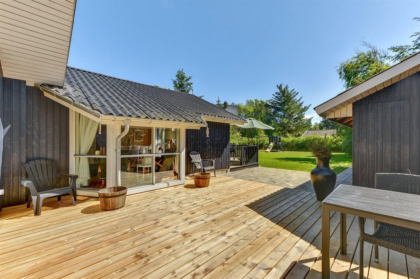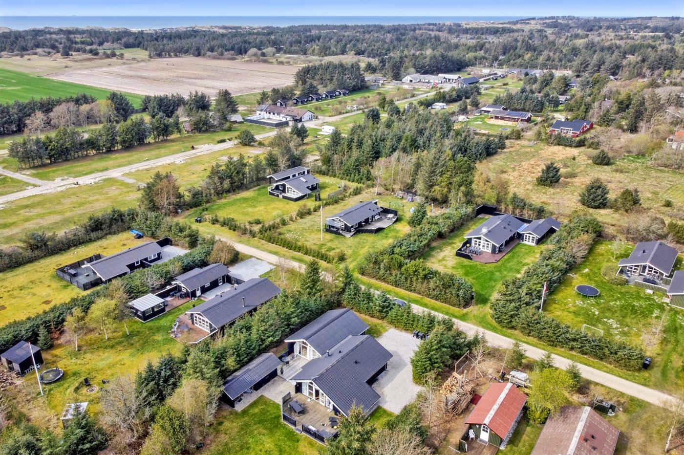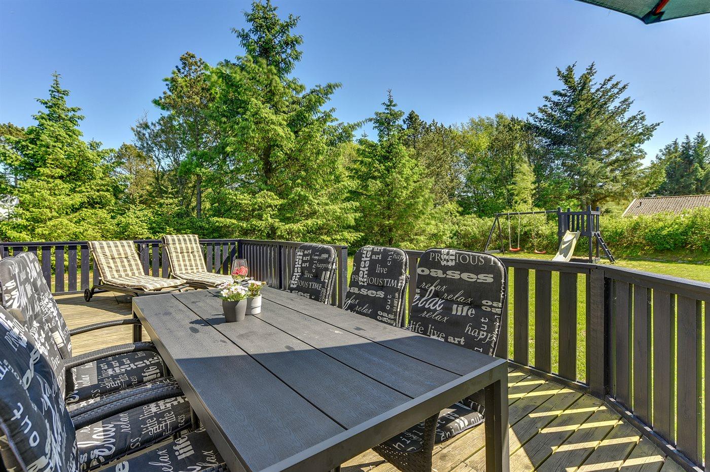 Ferieboligen er beliggende på en 1450 m² stor naturgrund. Der er 1200 m til havet. Nærmeste forretning er beliggende i en afstand af 800 m. Til ferieboligen hører 50 m² terrasseareal. Desuden er der 10 m² overdækket terrasse. Der er redskabsrum. Gynge. Sandkasse. Legetårn. Rutchebane. Shelter. Der er mulighed for at tilberede maden udendørs i udekøkkenet. Parkering ved ferieboligen.