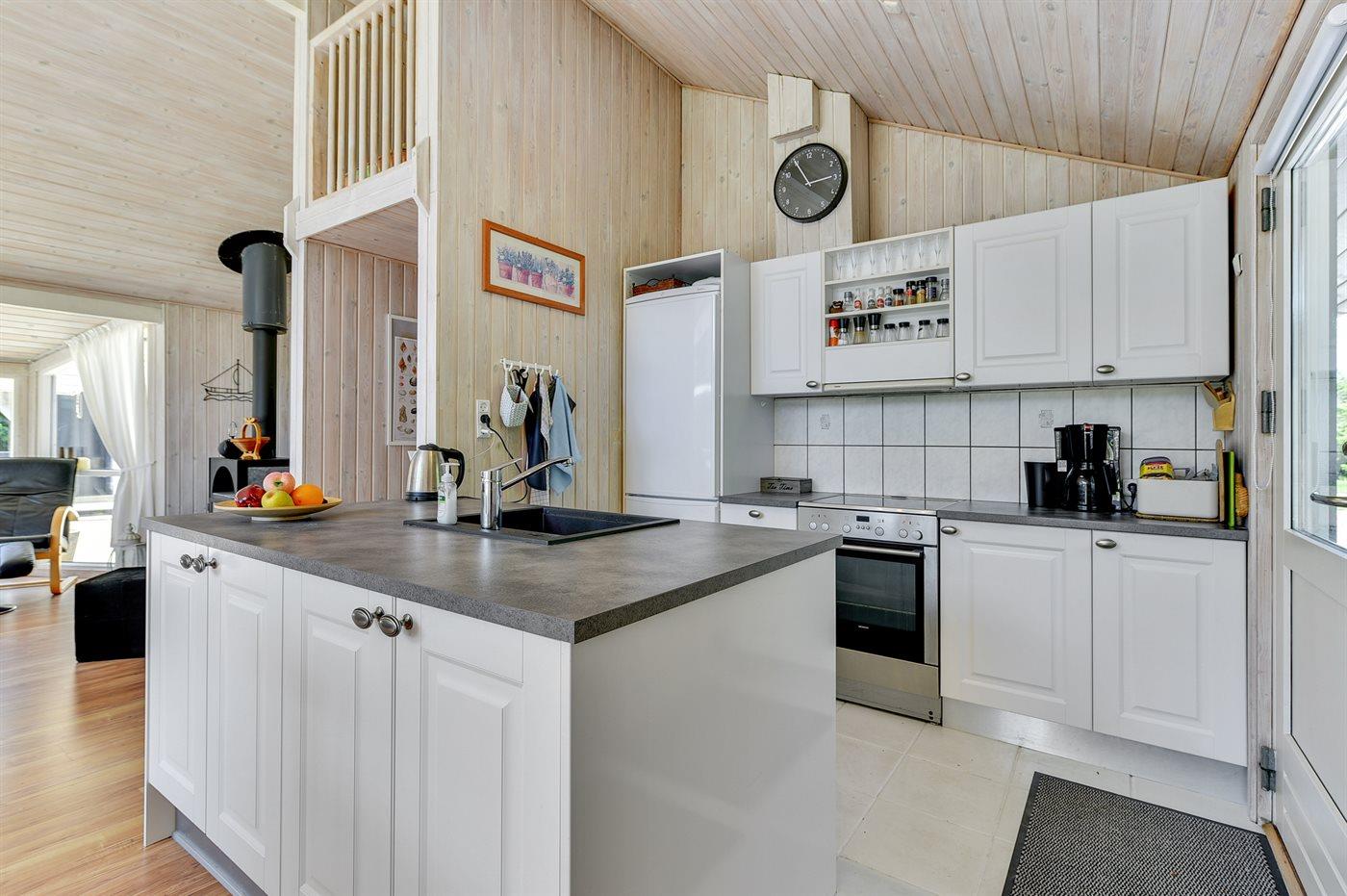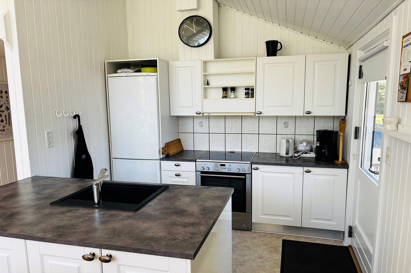 Køkkenet er udstyret med 1 køleskab. Der er 4 keramiske kogeplader, varmluftovn, mikrobølgeovn samt opvaskemaskine.