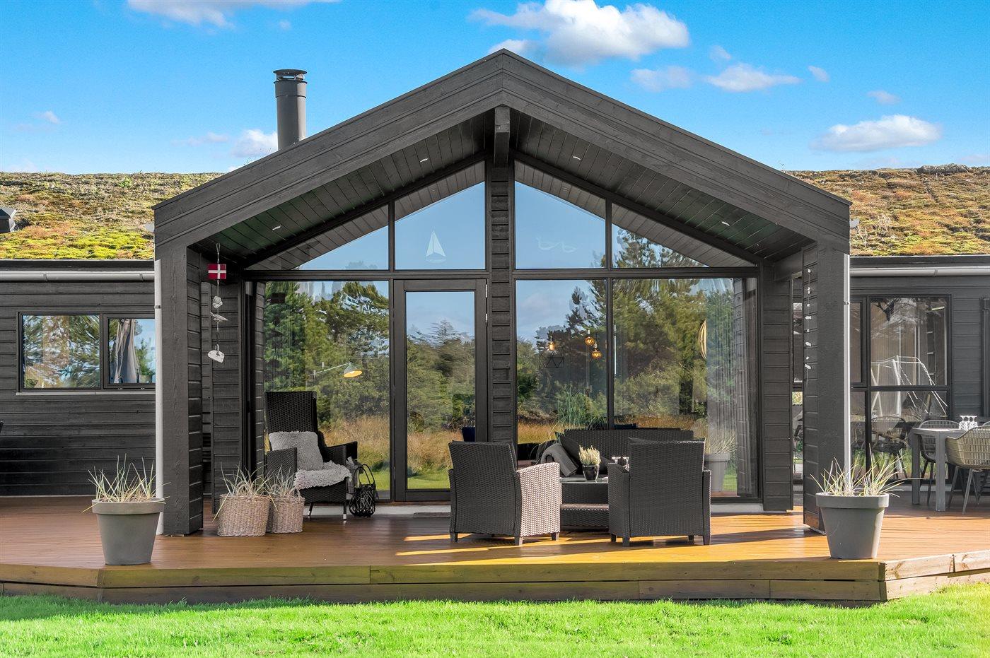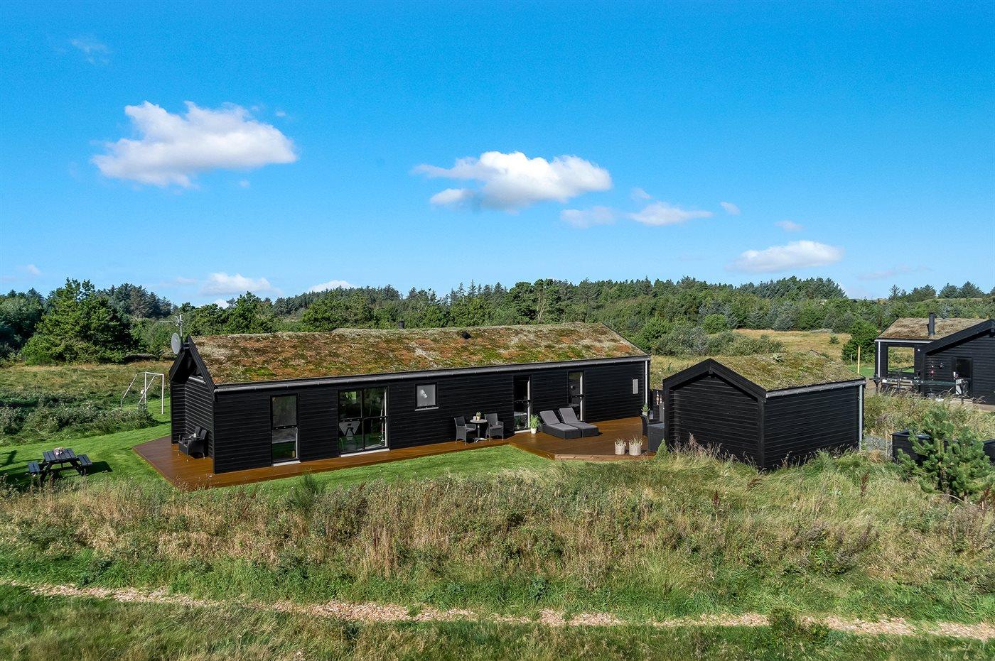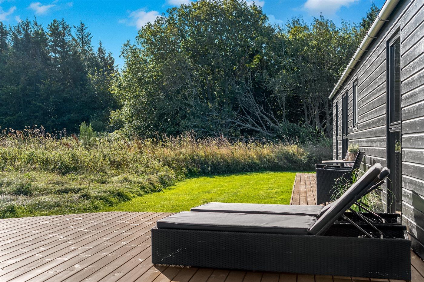 Moderne sommerhus med spa, aktivitetsrum og stor naturgrund nær stranden.