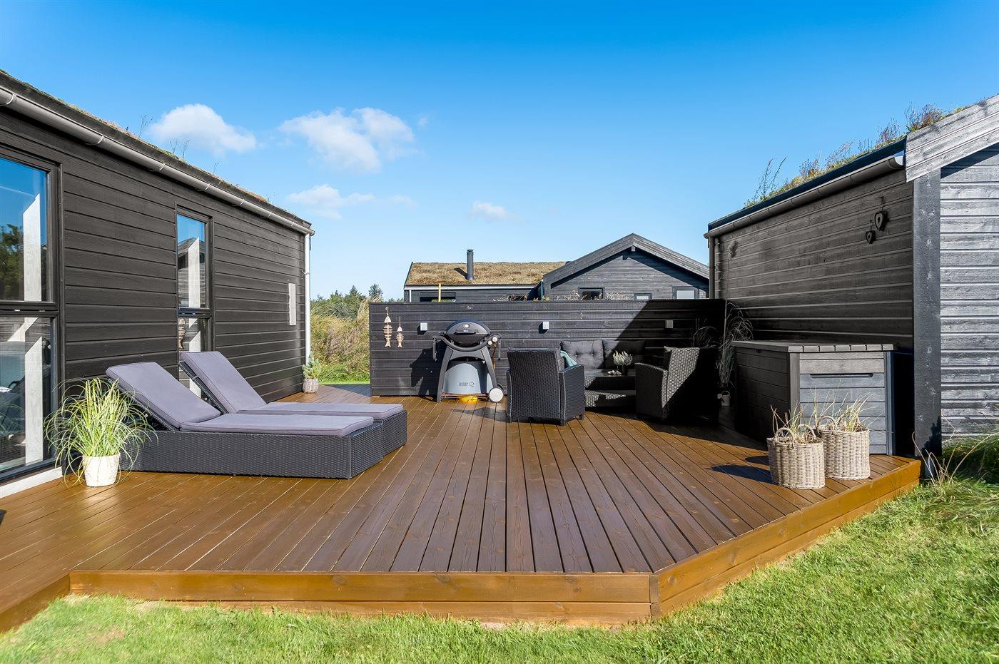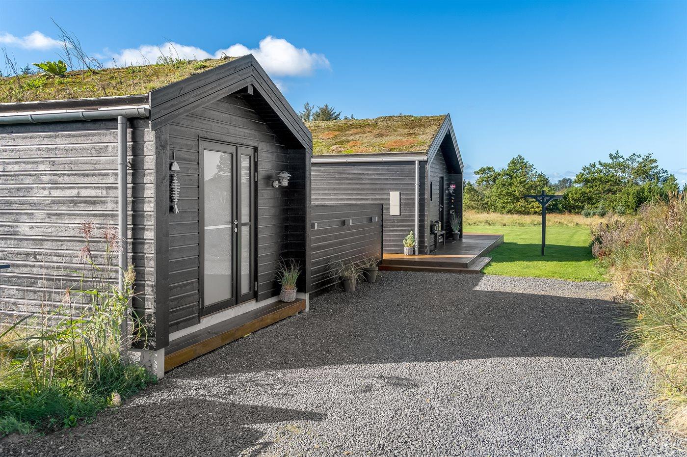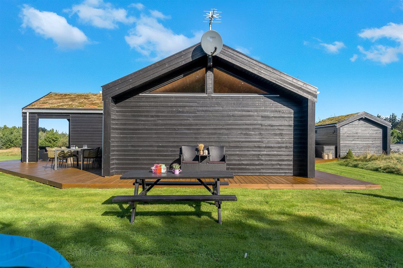 Moderne sommerhus med spa, aktivitetsrum og stor naturgrund nær stranden.
