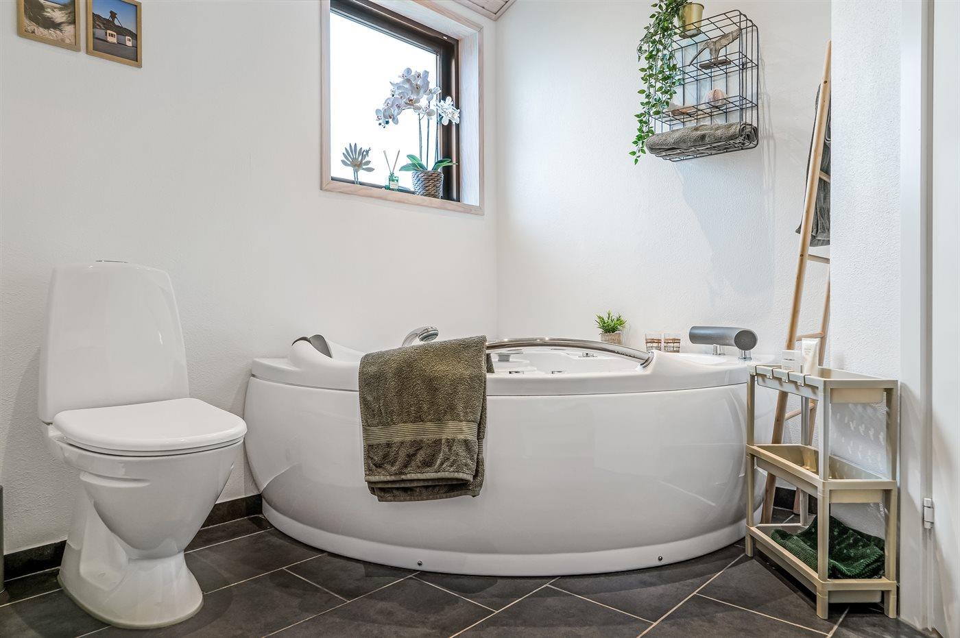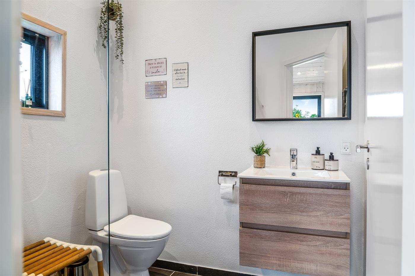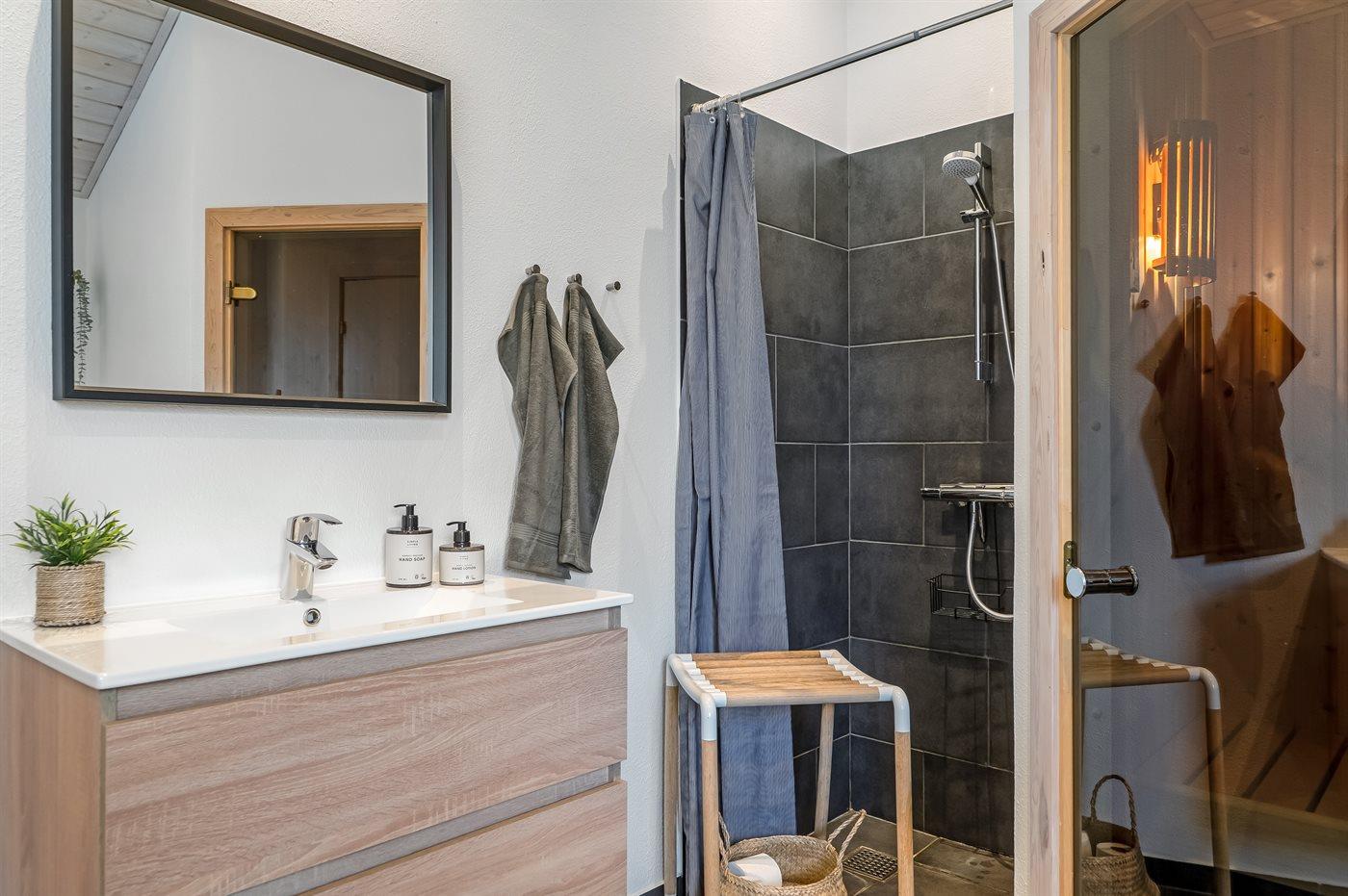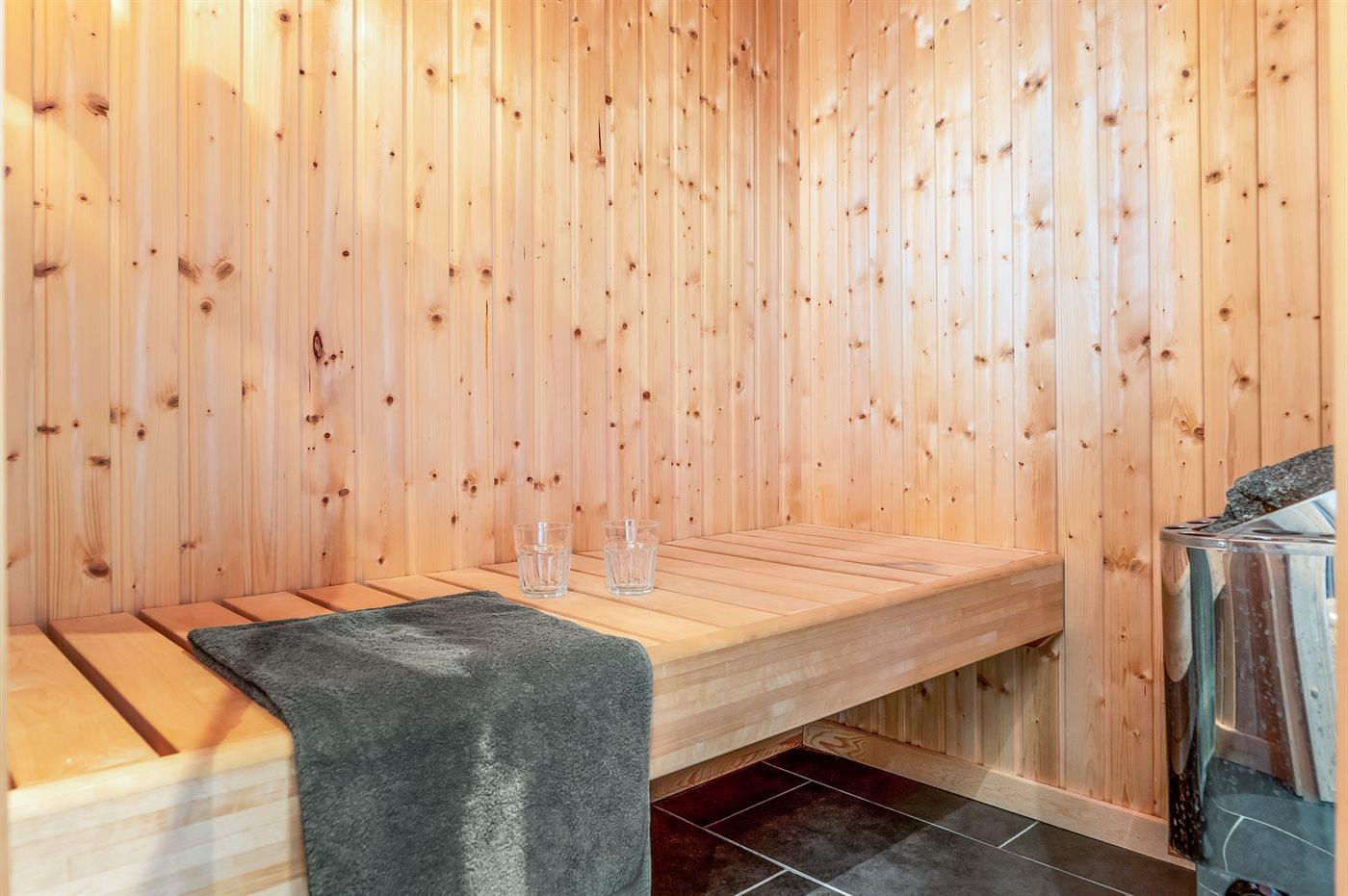Der er 2 badeværelser med bruseniche og 2 toiletter. Der er gulvvarme på 2 badeværelser. I saunaen er der mulighed for afslapning.