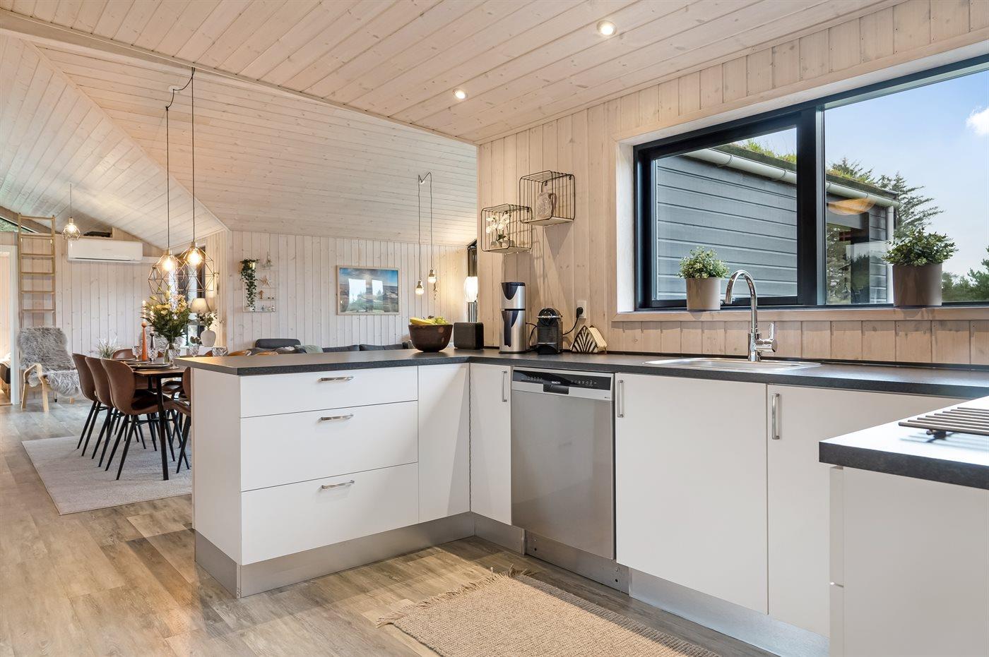Køkkenet er udstyret med 1 køleskab. Der er 4 induktionskogeplader, varmluftovn, mikrobølgeovn samt opvaskemaskine.