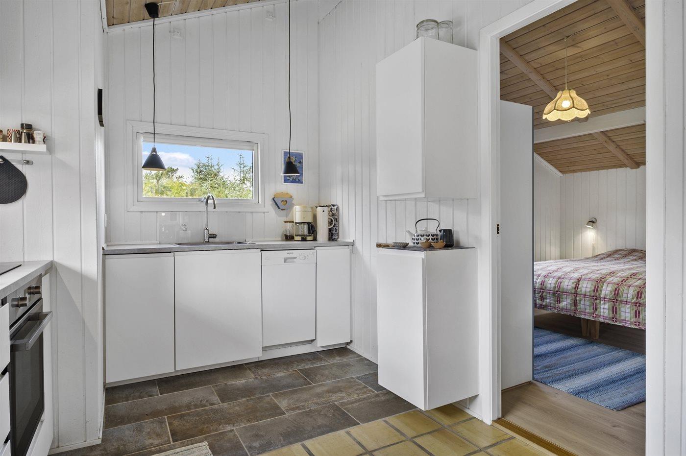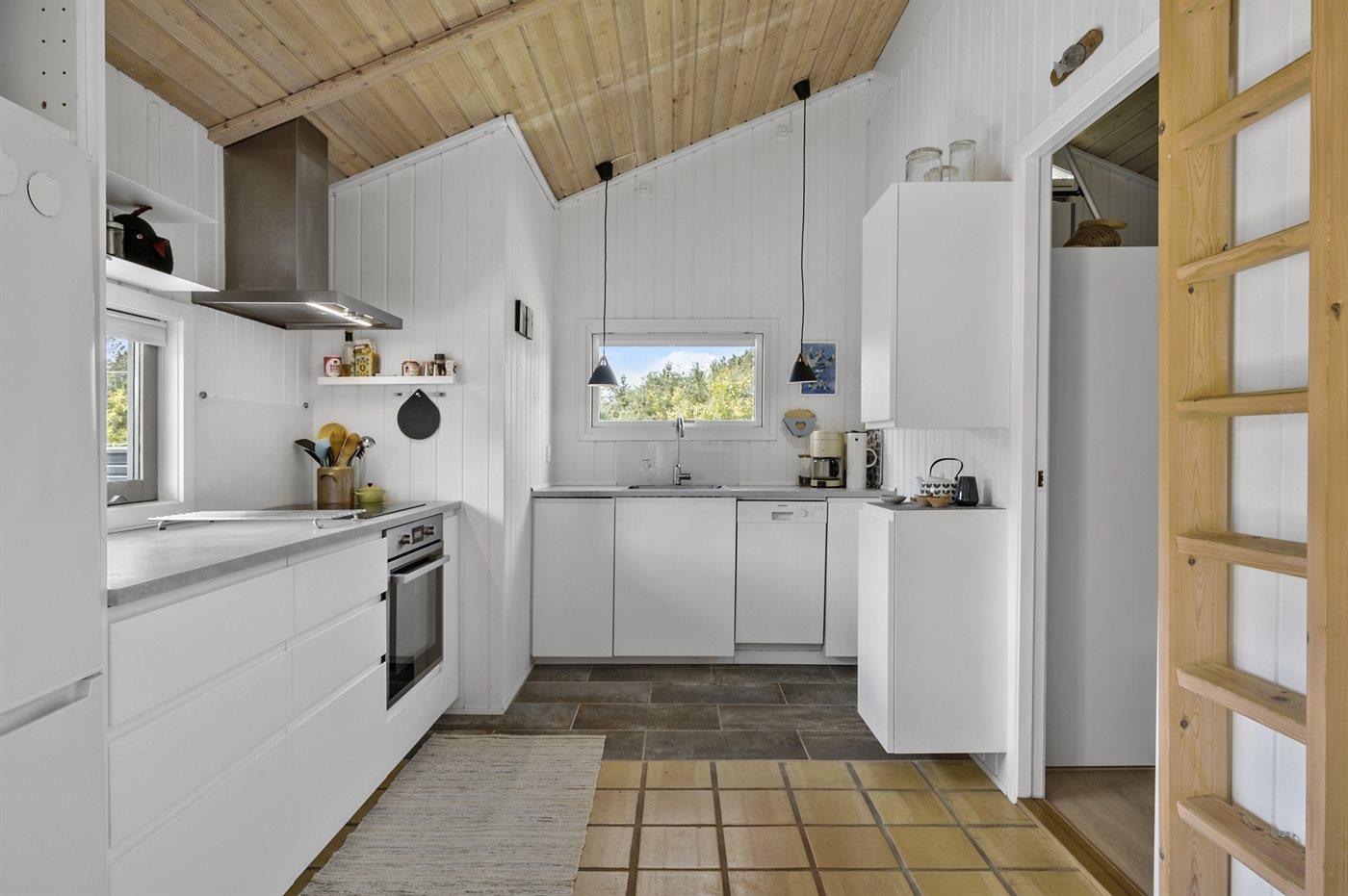 Køkkenet er udstyret med 1 køleskab. Der er 4 keramiske kogeplader, varmluftovn, mikrobølgeovn samt opvaskemaskine.