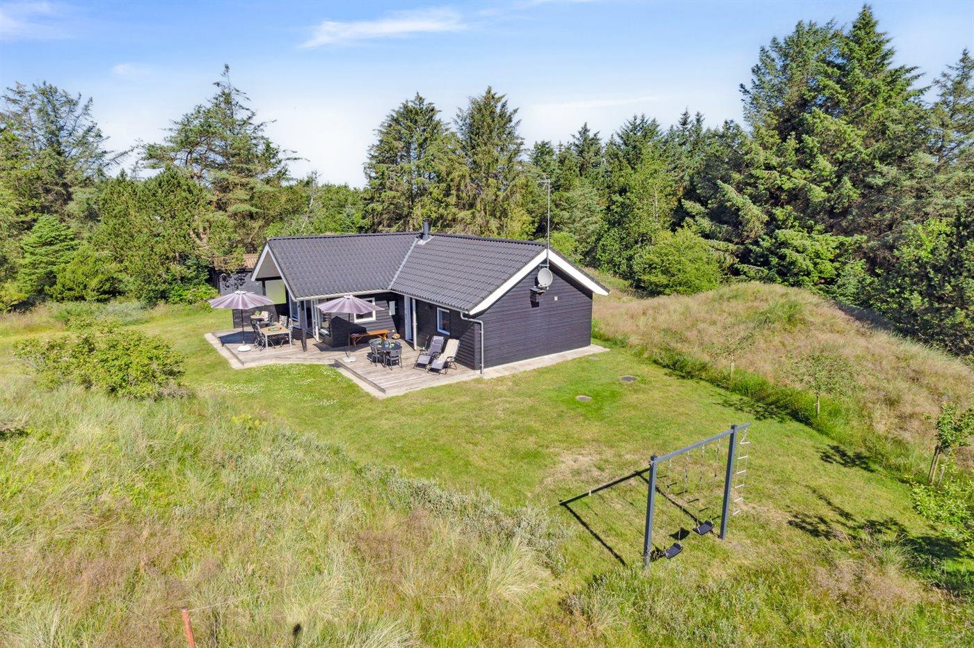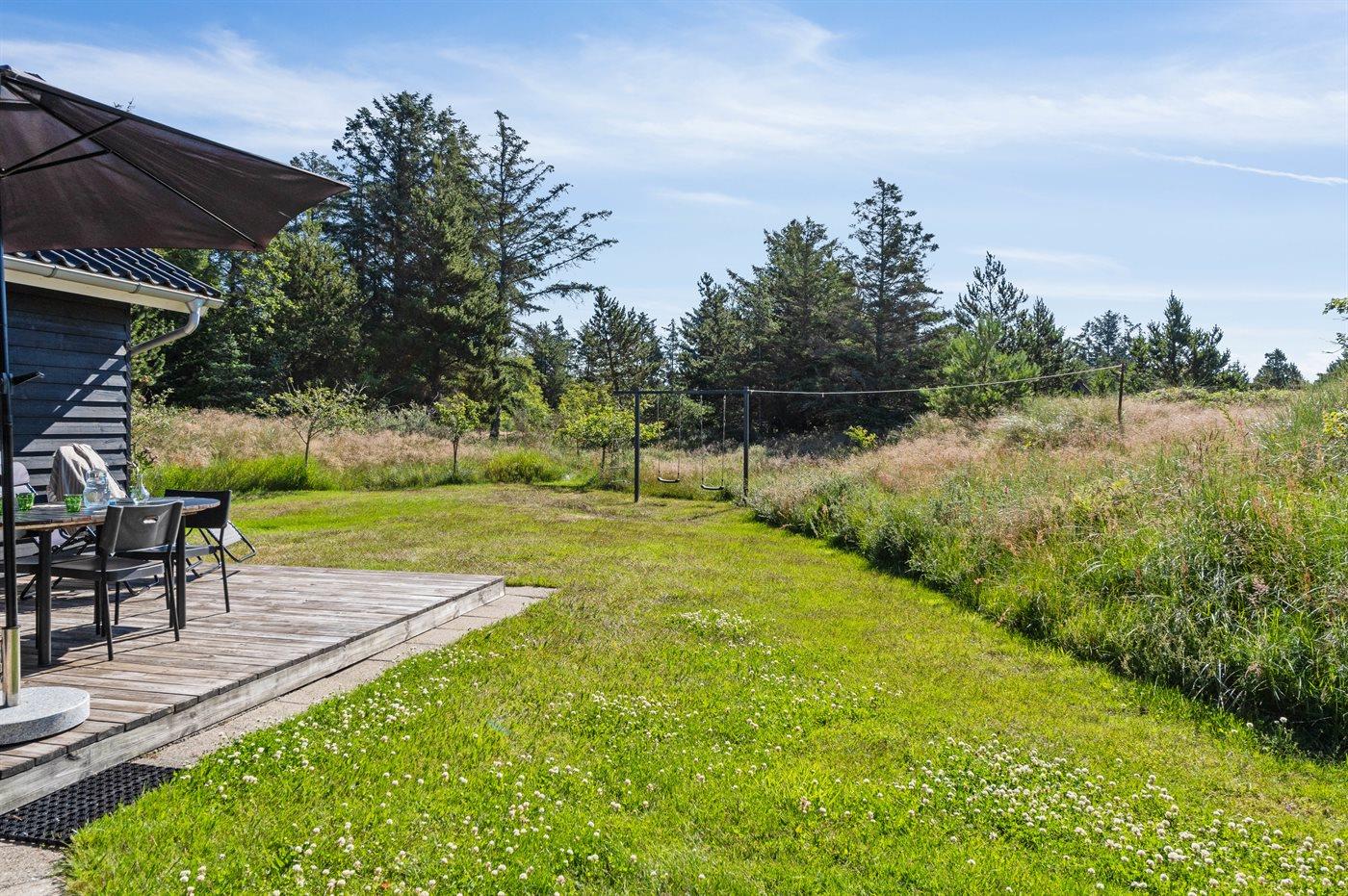 Ferieboligen er beliggende på en 2700 m² stor naturgrund. Der er 1300 m til havet. Nærmeste forretning er beliggende i en afstand af 200 m. Til ferieboligen hører 45 m² terrasseareal. Desuden er der 3 m² overdækket terrasse. Der er redskabsrum. Gynge. Grill til rådighed. Parkering ved ferieboligen.
