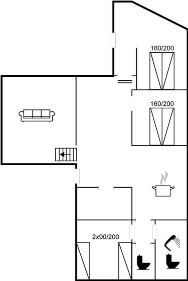 Der er i alt 3 soveværelser. Sovepladserne fordeler sig på: 4 sovepladser i dobbeltsenge. 2 sovepladser i enkeltsenge. Derudover er der 1 stk. barneseng.
