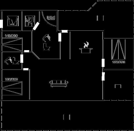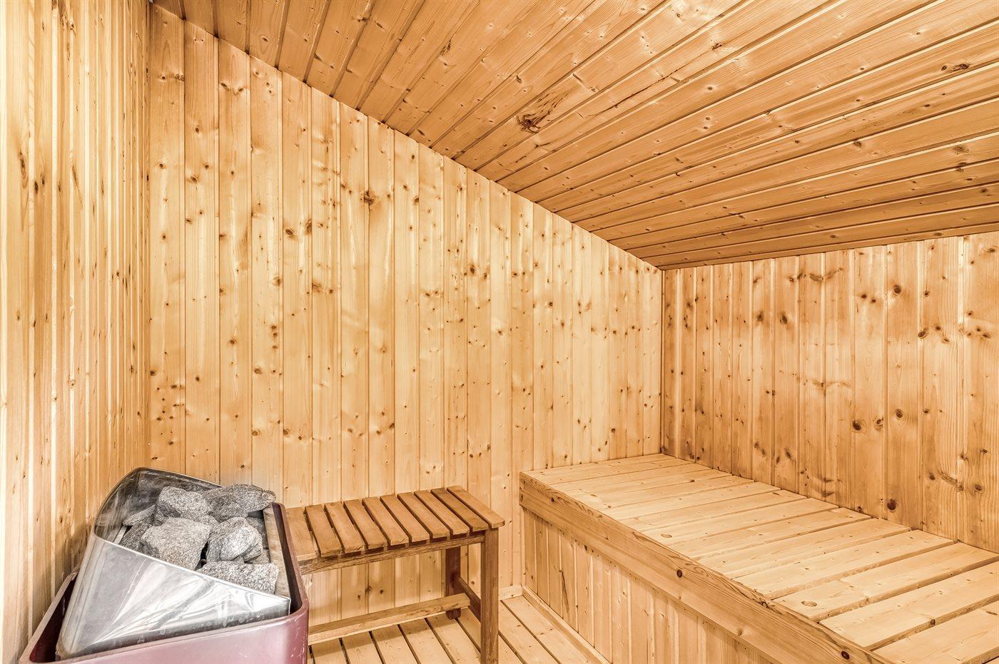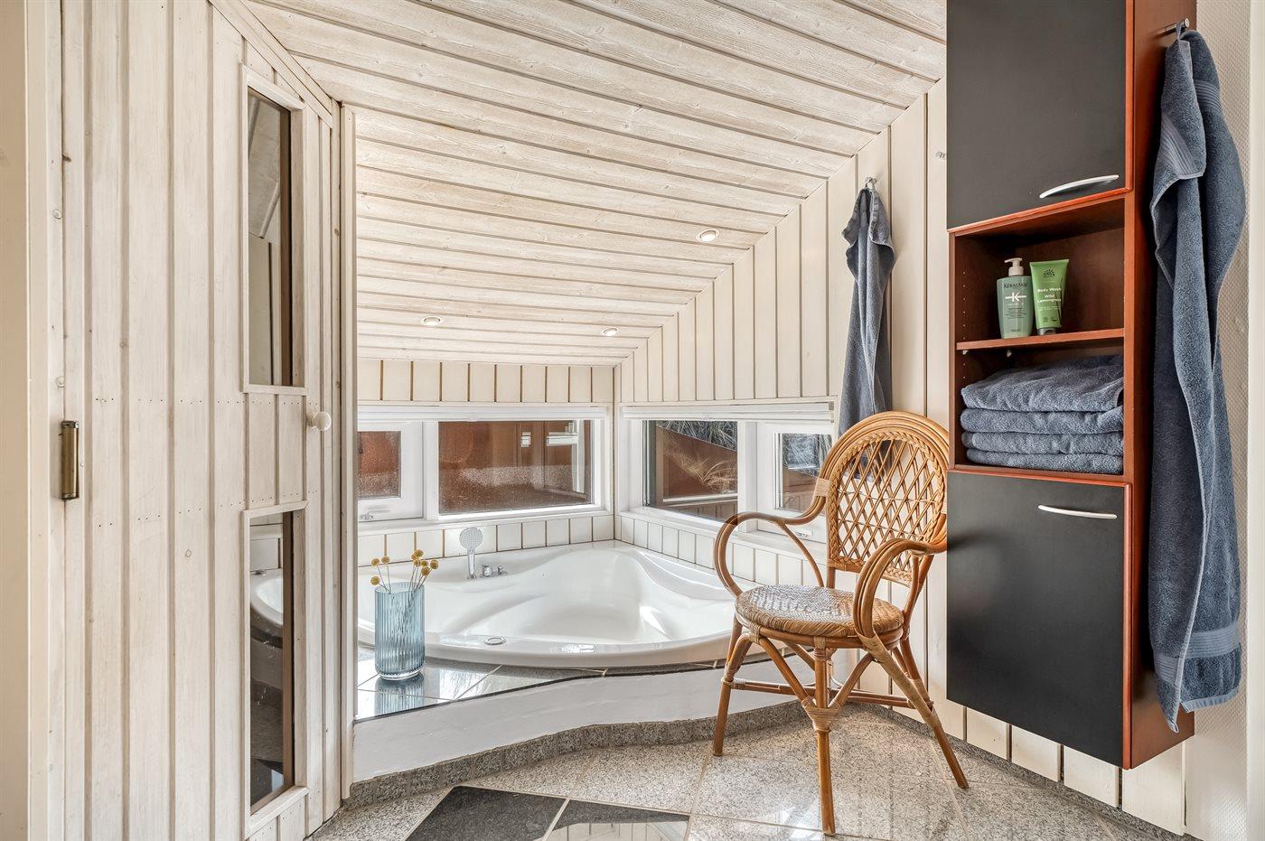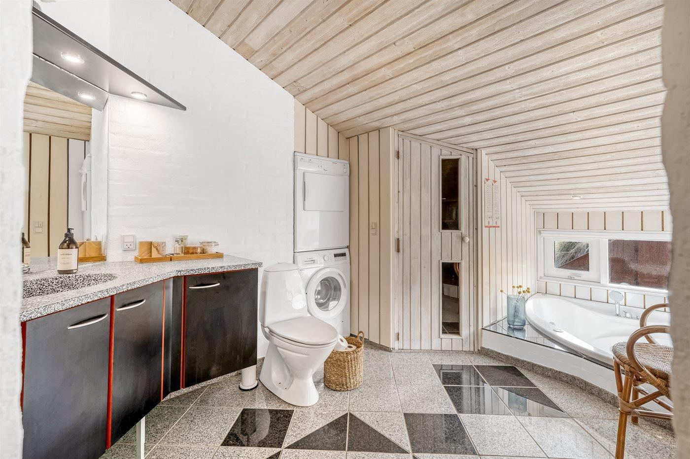 Der er 2 badeværelser med bruseniche og 2 toiletter. Der er gulvvarme på 2 badeværelser. I saunaen er der mulighed for afslapning.