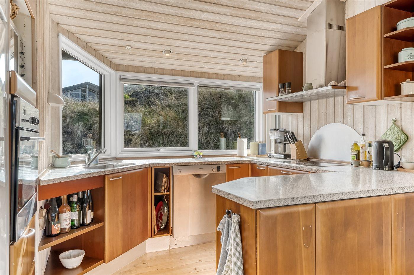 Køkkenet er udstyret med 1 køleskab. Der er 4 keramiske kogeplader, varmluftovn, mikrobølgeovn samt opvaskemaskine.