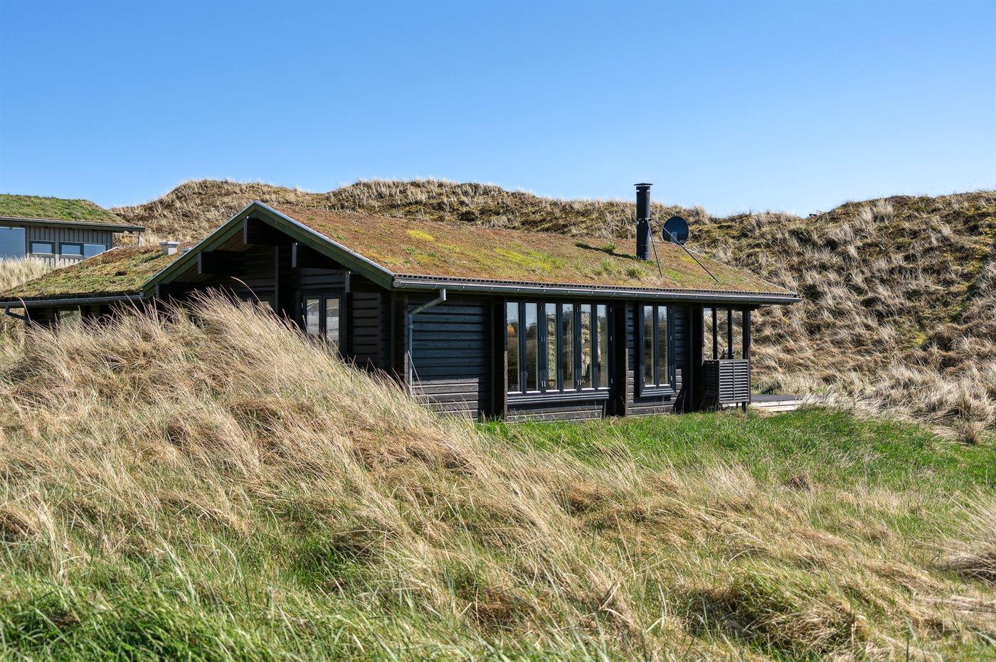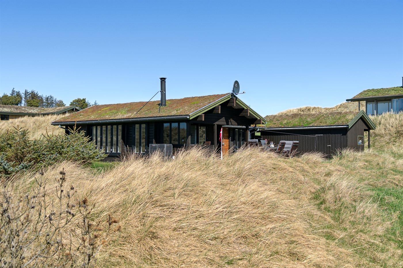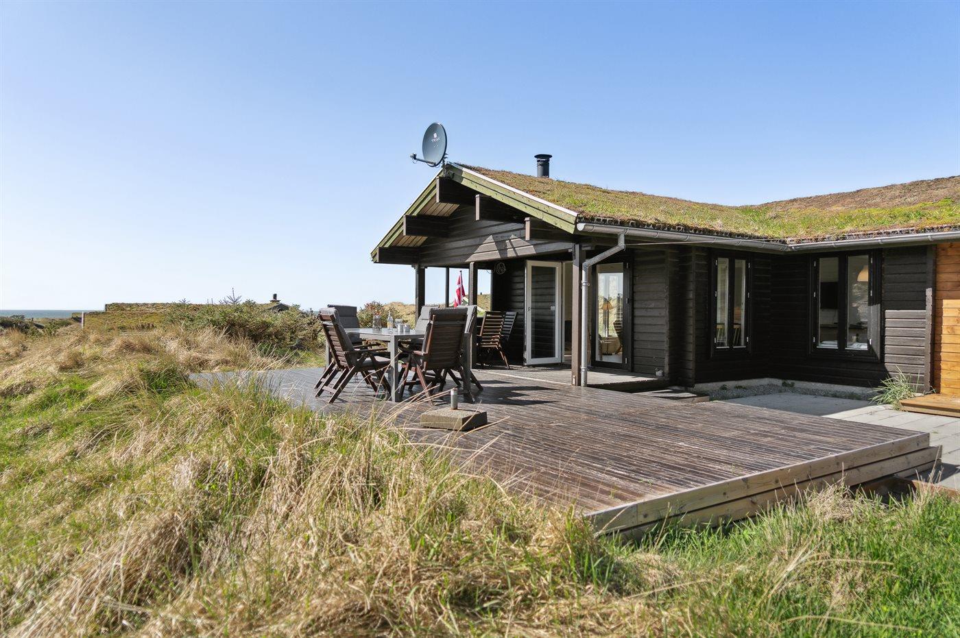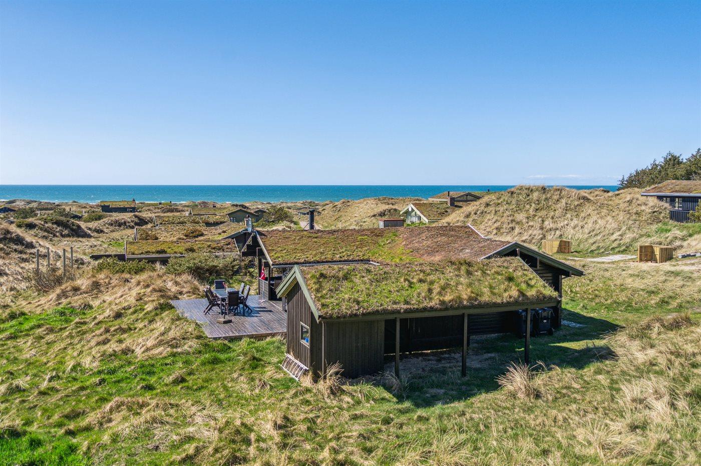 Sommerhuset er lige sådan, som et klassisk sommerhus skal være med træbeklædt facade, græs på taget og en idyllisk placering midt i det uspolerede klitlandskab. Den enkle og rustikke stil går igen inde i huset, hvor der er træ på gulve, vægge og lofter og et charmerende interiør, som sætter fine rammer om ferieturens hyggelige samvær. Køkkenet ligger i åben forbindelse med stuen, som har lysindfald fra tre verdenshjørner – og ikke mindst en flot udsigt til Vesterhavet fra de store vinduespartier.