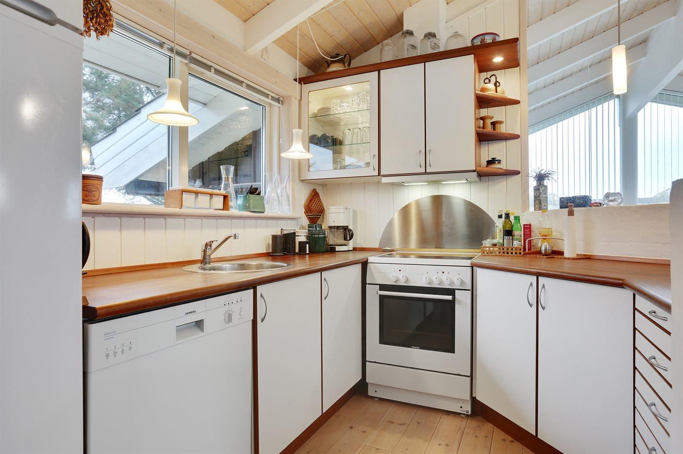 Køkkenet er udstyret med 1 køleskab. Der er 4 keramiske kogeplader, varmluftovn samt opvaskemaskine.