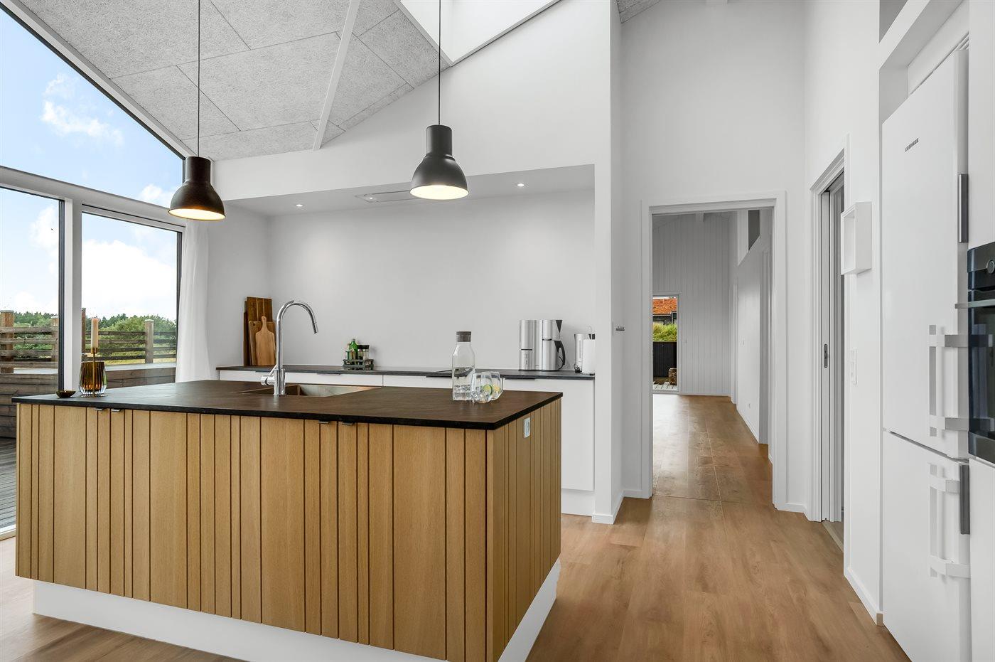 Køkkenet er udstyret med 1 køleskab. Der er 4 induktionskogeplader, varmluftovn, mikrobølgeovn samt opvaskemaskine. Desuden findes der et vinkøleskab.