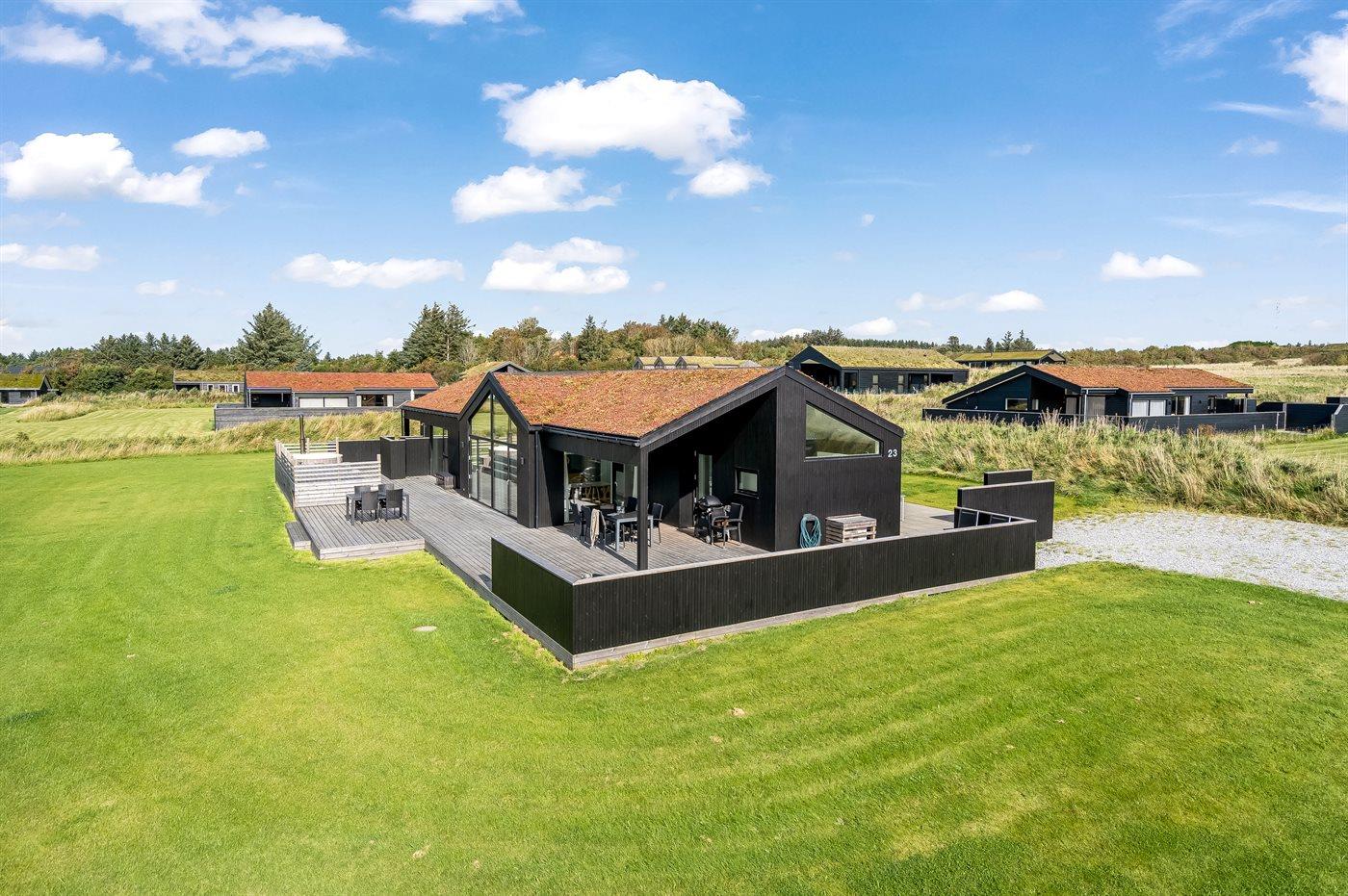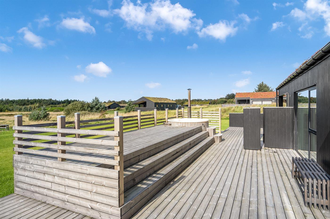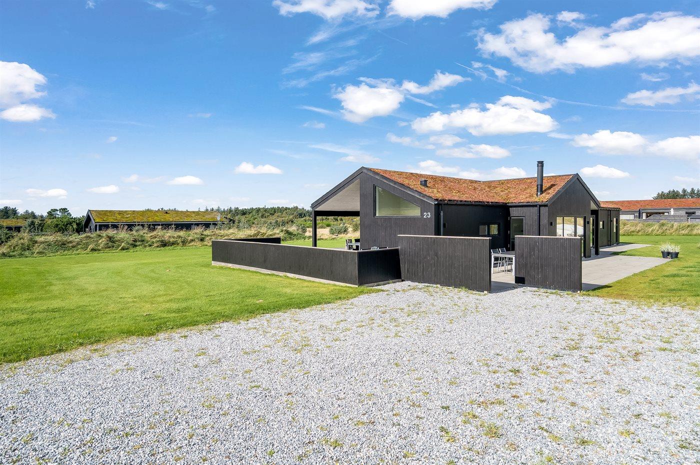 Ferieboligen er beliggende på en 2500 m² stor naturgrund. Der er 1500 m til havet. Nærmeste forretning er beliggende i en afstand af 1800 m. Der er en golfbane i en afstand af 8000 m. Til ferieboligen hører åbent terrasseareal. Desuden er der overdækket terrasse. Udendørs bruser. Grill til rådighed. Der er installeret stik til opladning af elbil. Parkering ved ferieboligen.