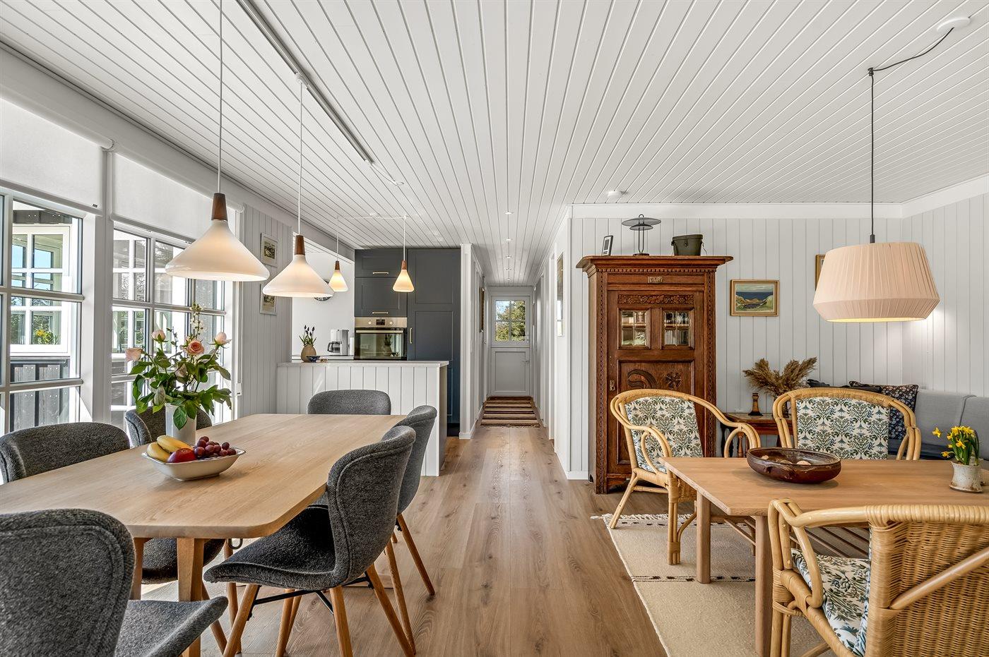 Huset fremstår utrolig indbydende og indrettet med fokus på kvalitet og funktionalitet. Den store træterrasse er et perfekt samlingspunkt for både afslapning og hyggelige stunder med familie og venner. En del af terrassen er overdækket, hvilket gør det muligt at nyde udendørslivet - uanset vejret. Der er også en dejlig udebruser, som giver en forfriskende oplevelse på de varme sommerdage.