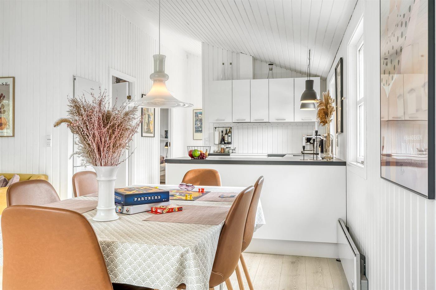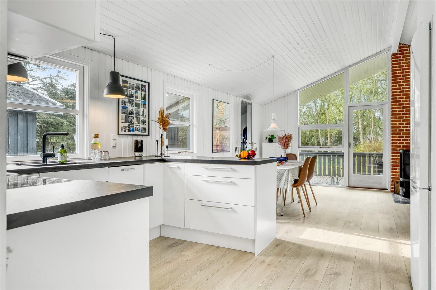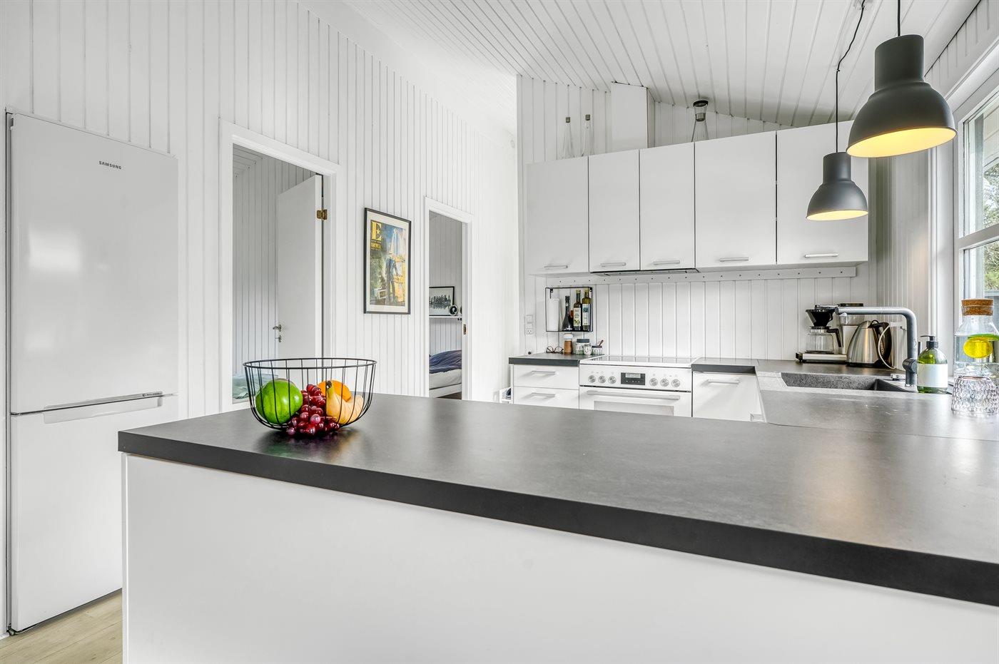 Køkkenet er udstyret med 1 køleskab. Der er 4 keramiske kogeplader, varmluftovn samt opvaskemaskine.