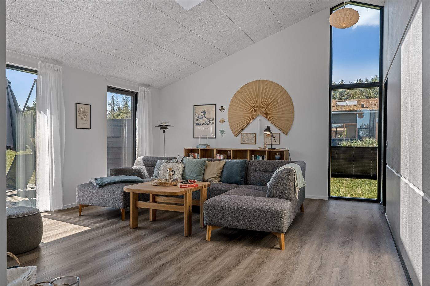 Huset rummer et lækkert, lyst og moderne indrettet opholdsrum med åbent køkken og store vinduespartier, der giver masser af naturligt lys. Fra stuen er der direkte adgang til et fantastisk terrasseområde med både åbne og overdækket terrasse – ideelt til lange sommeraftener med grill og hygge uanset vejret.