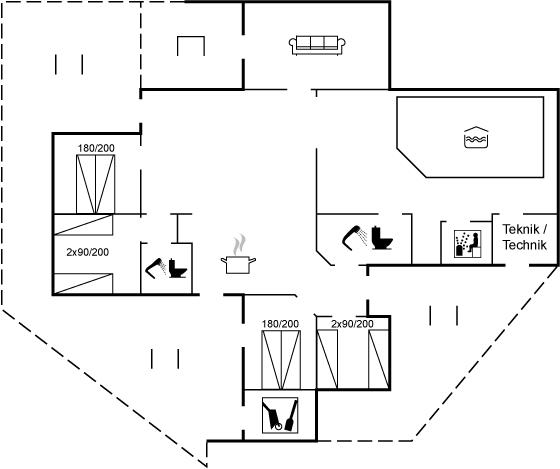 Der er 2 badeværelser med bruseniche og 2 toiletter I saunaen er der mulighed for afslapning.