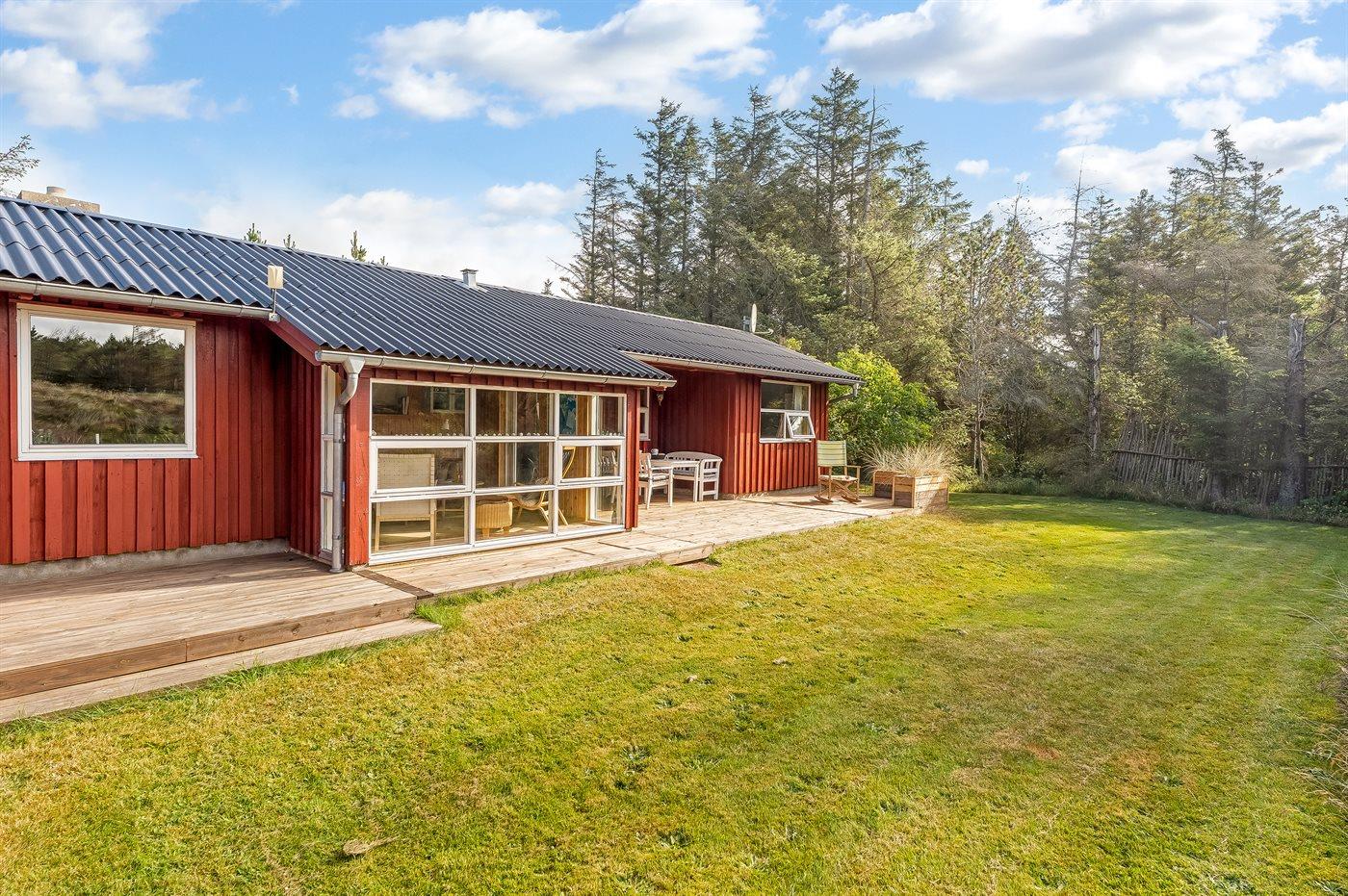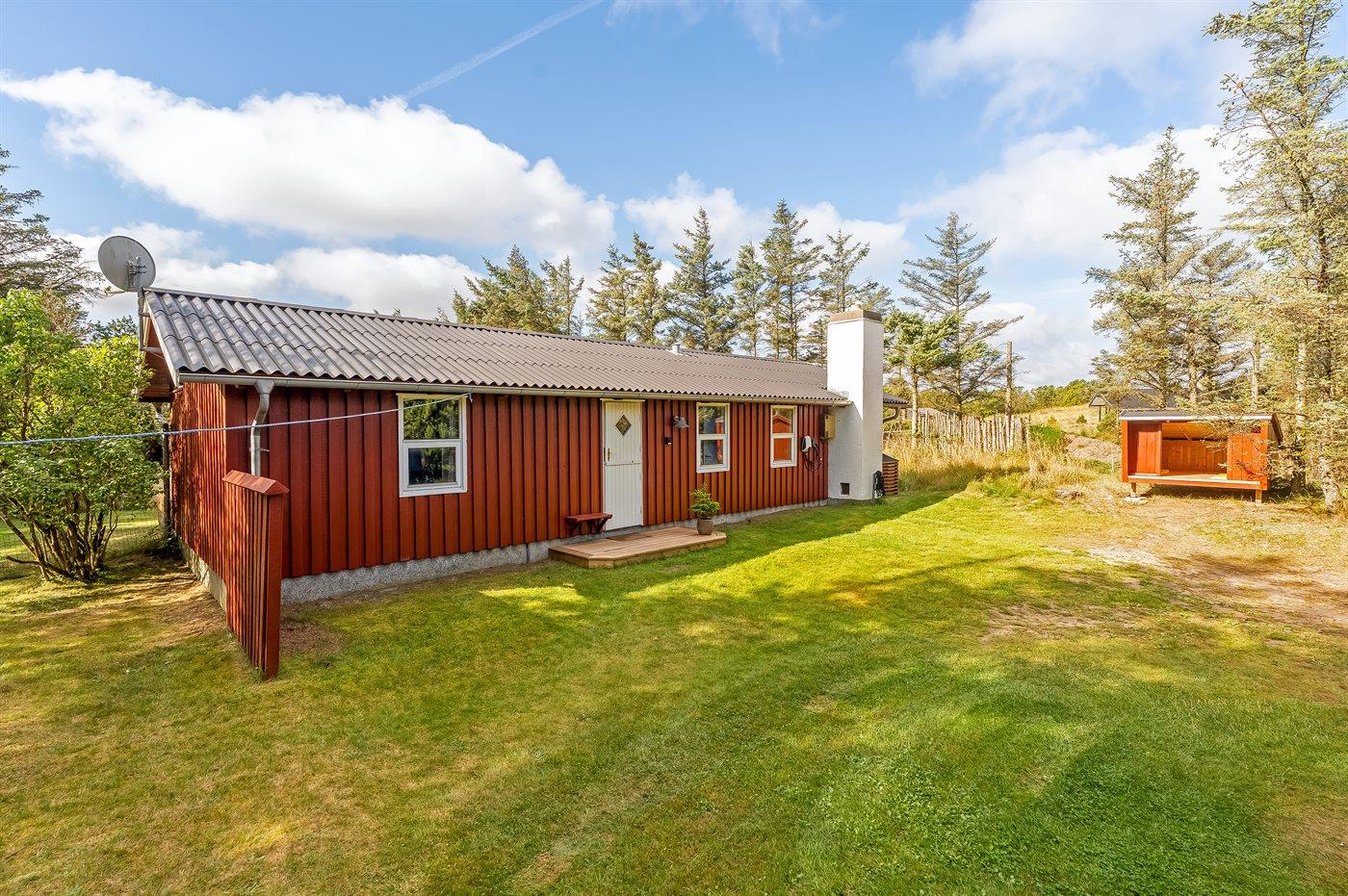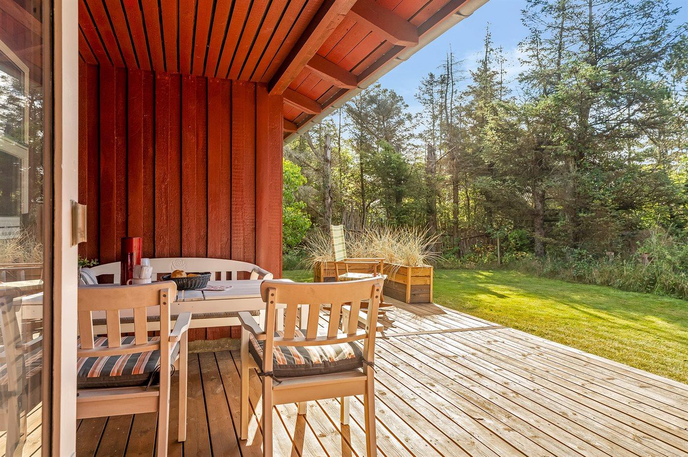 Ferieboligen er beliggende på en 2758 m² stor naturgrund. Grunden er indhegnet. Der er 600 m til havet. Nærmeste forretning er beliggende i en afstand af 4500 m. Til ferieboligen hører åbent terrasseareal. Desuden er der overdækket terrasse. Gynge. Shelter. Grill til rådighed. Der er garage til rådighed. Der er installeret stik til opladning af elbil. Med 11 kW ladeeffekt. Parkering ved ferieboligen.
