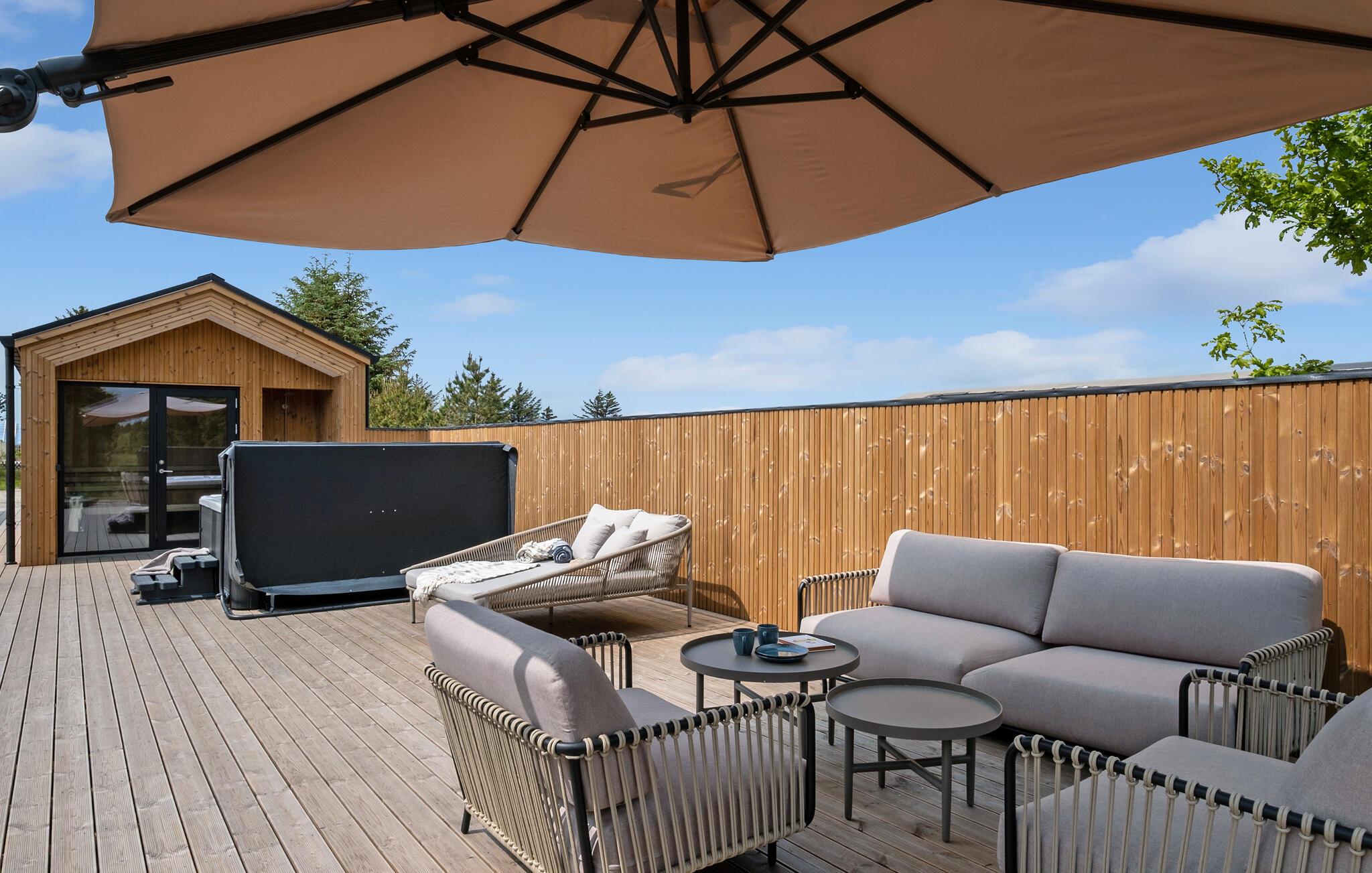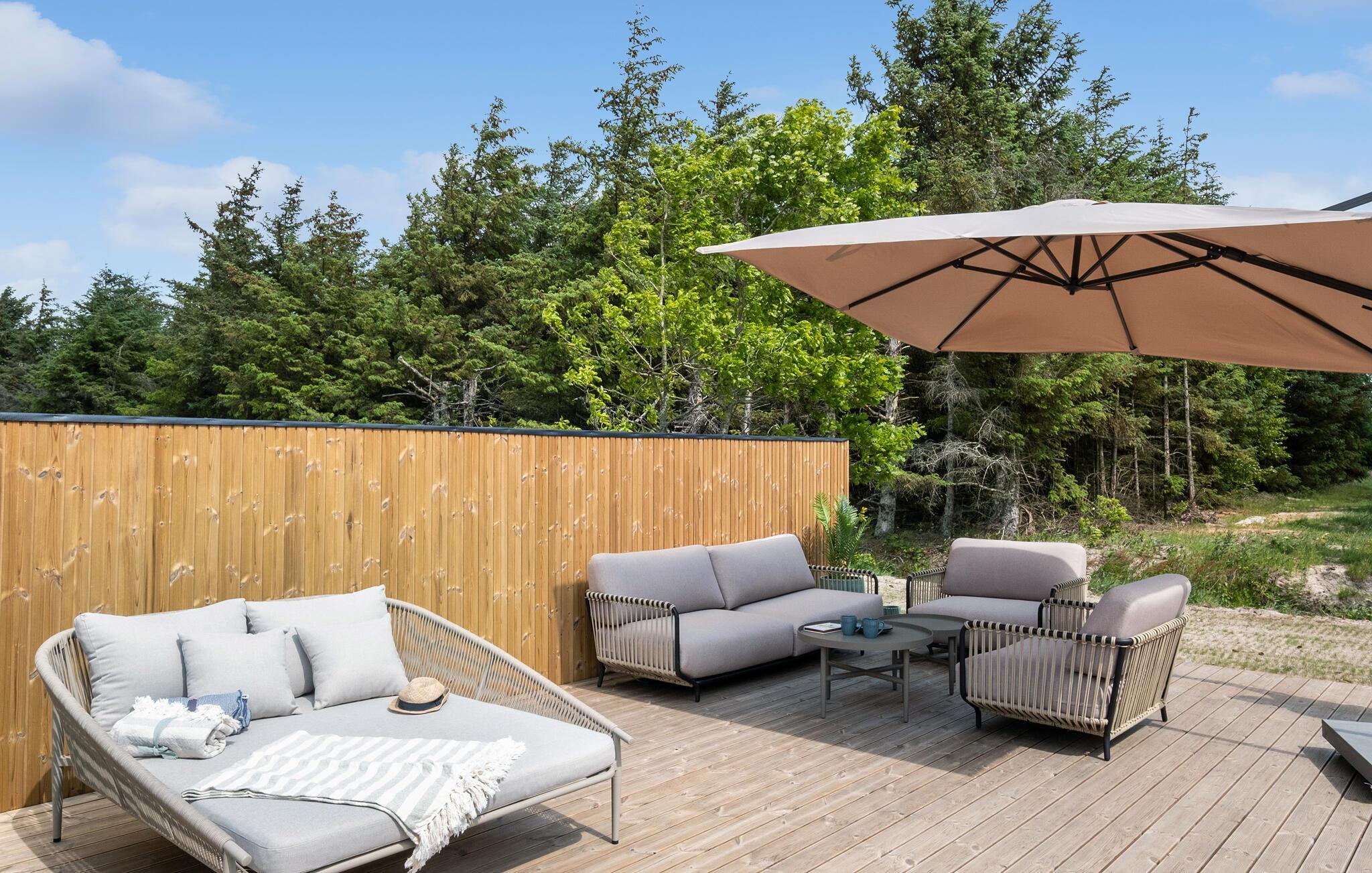Den åbne terrasse indbyder til at gå barfodet rundt og byder på rendyrket afslapning under åben himmel. Nyd solen på liggestolen, slap af i det varme spabad, og få varmen igen i saunaen efter en lang tur i området. Giv jeres børn plads til leg på den store græsplæne, og brug tiden sammen med en god grillaften.