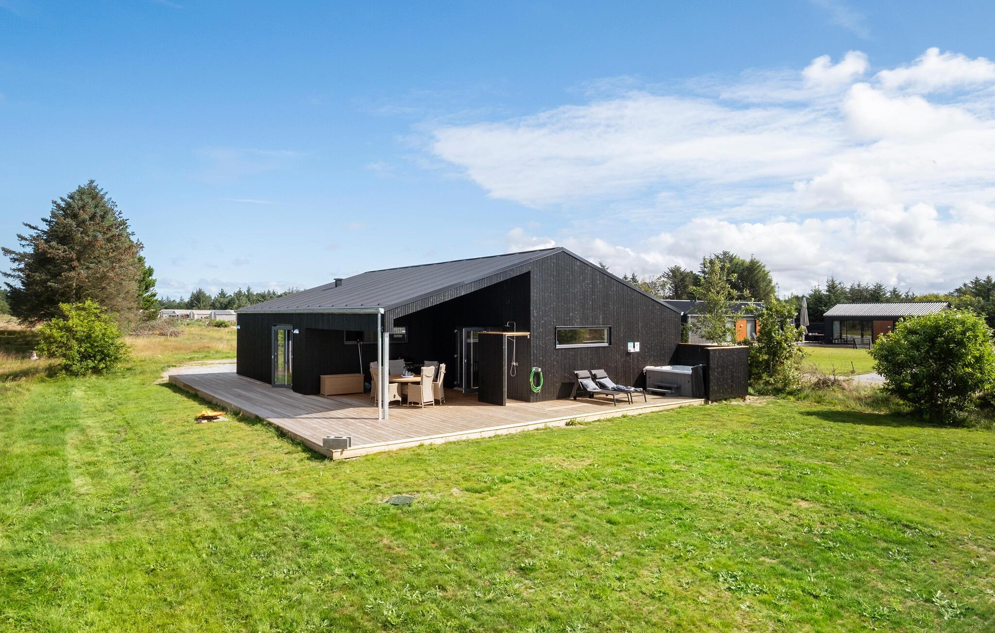 Dette moderne feriehus i Saltum byder på stilfuld indretning, aktivitetsrum og udendørs spabad nær Vesterhavet.