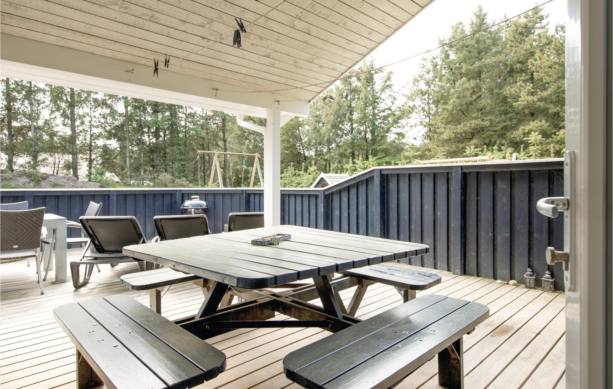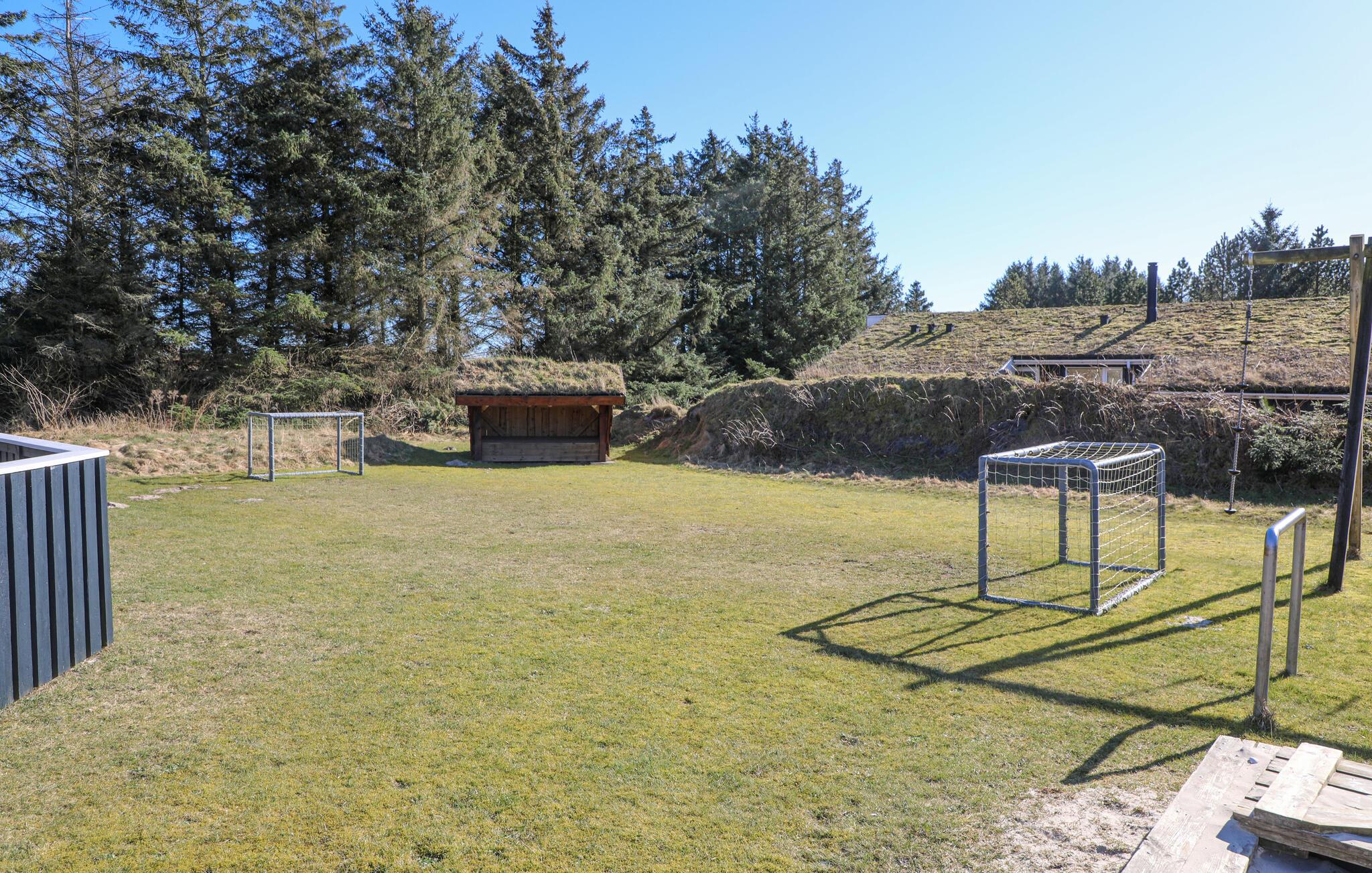 På den dejlige, lukkede træterrasse står der gode havemøbler og solsenge til alle gæster. Hvis det bliver for varmt i solen, har I også mulighed for at finde skygge på den overdækkede terrasse. Børnene kan sikkert få timer til at gå med at holde teselskab i legehuset, skyde bolde i fodboldmålet, bygge tårne i sandkassen og svinge sig i gyngerne. Måske har nogle af jer lyst til at tilbringe en nat i shelteret og se solen stå op ude i det fri.