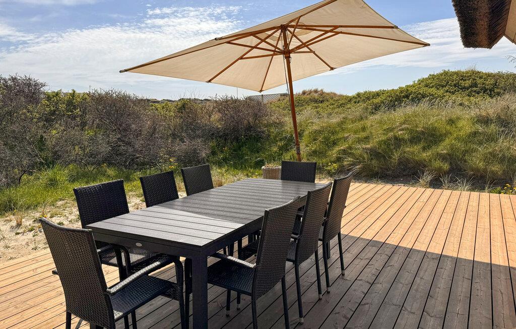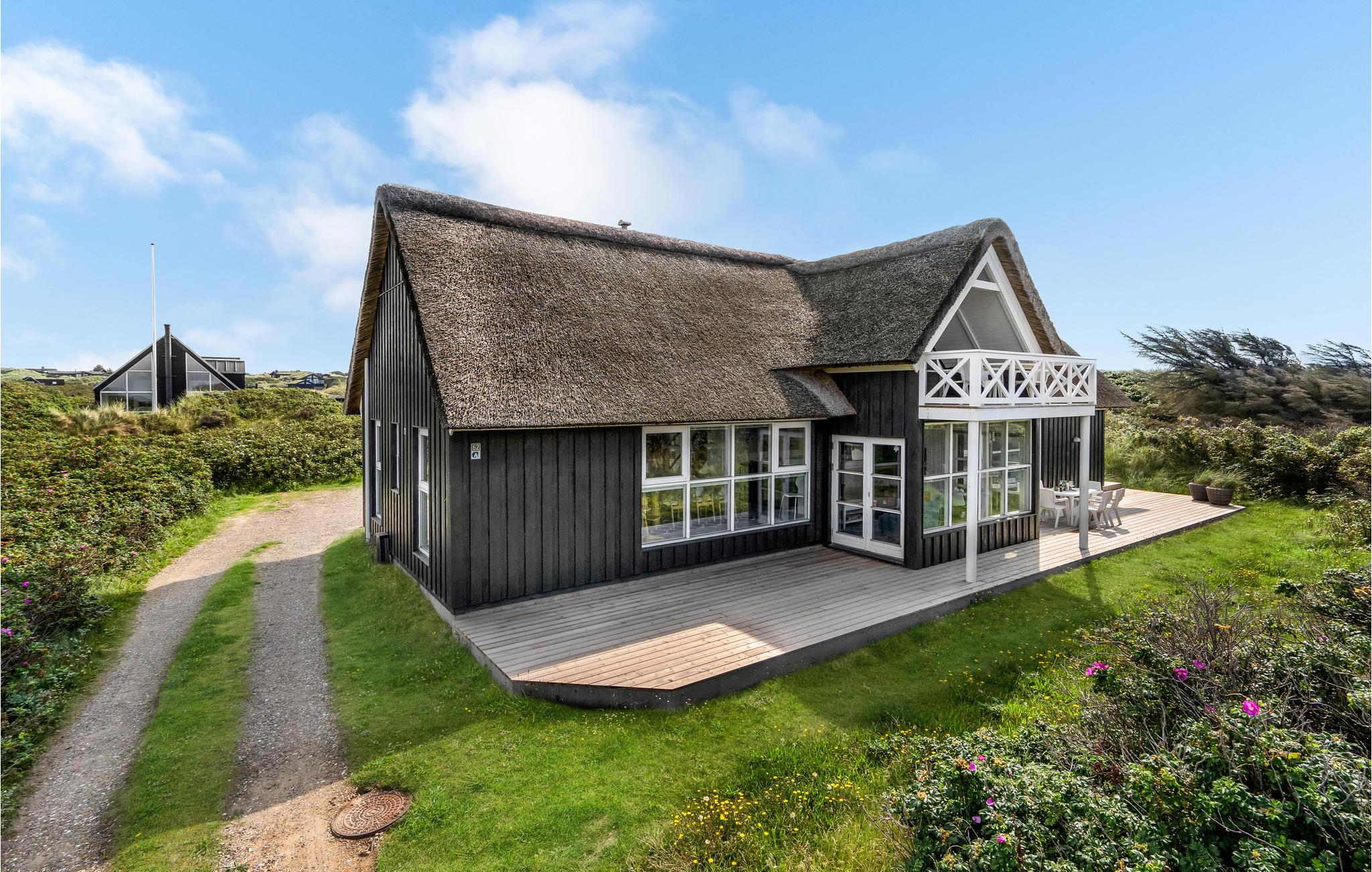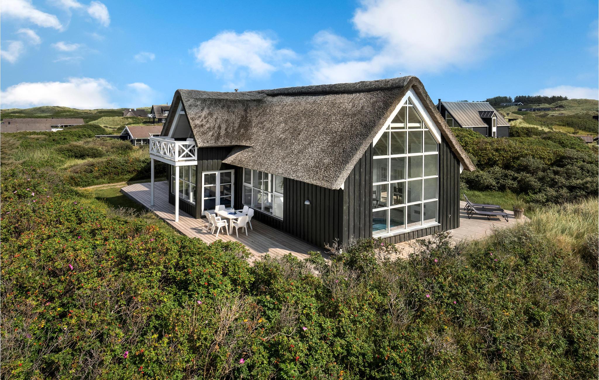 Ved et af Danmarks smukkeste kystområder ligger dette feriehus. Ved den kuperede klitgrund er der nedkørsel direkte til stranden. Huset falder godt ind i naturen, da det er bygget af træ og har stråtag. Den store poolafdeling indeholder en stor swimmingpool til glæde for hele familien. I det ene af husets to badeværelser findes den fire pers. spa. Huset er lyst og venligt indrettet og møbler samt farvevalg er nøje afstemt. Fra såvel stuen som poolafdelingen er der udgang til læfyldte terrasser. Fra stuen på første sal er der udgang til en flot balkon, hvorfra der er en dejlig udsigt over Vesterhavet og klitterne. Garagen har automatisk portåbning-/lukning.