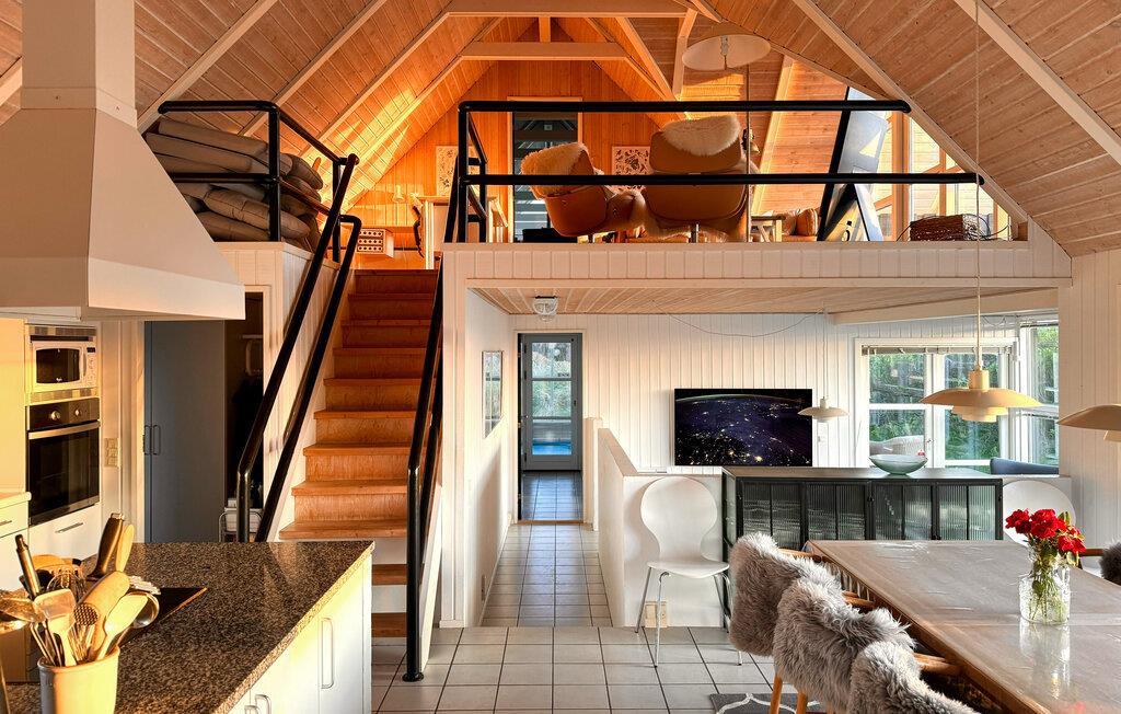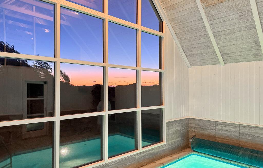 Charmerende træhus med stråtag og pool tæt på Vesterhavets strand og klitter.