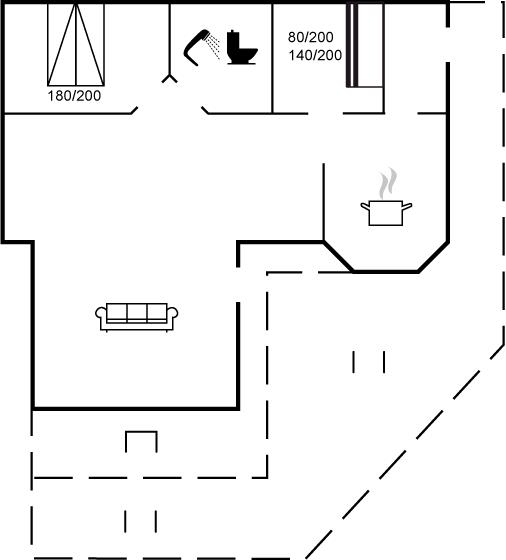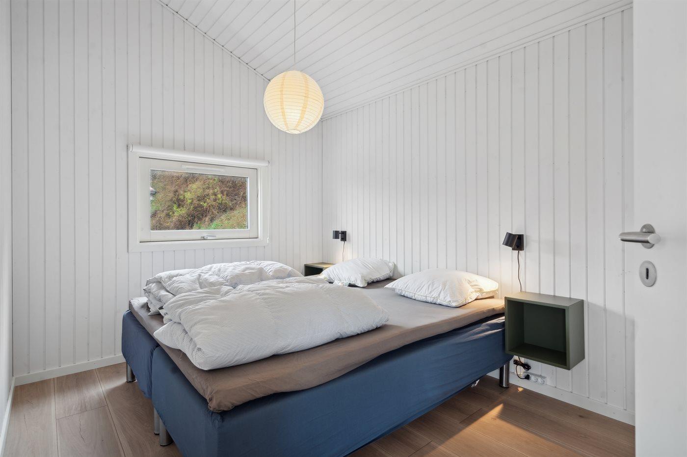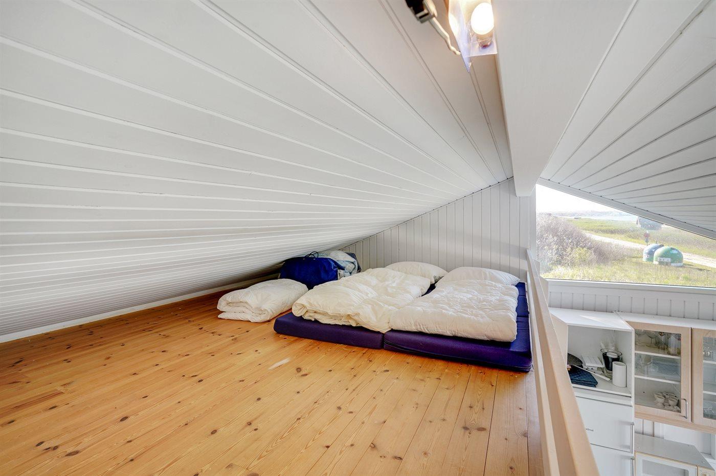 Der er i alt 2 soveværelser. Sovepladserne fordeler sig på: 2 sovepladser i dobbeltseng. 2 sovepladser i køjeseng. 2 sovepladser på madrasser. 2 af disse sovepladser befinder sig på husets hems.