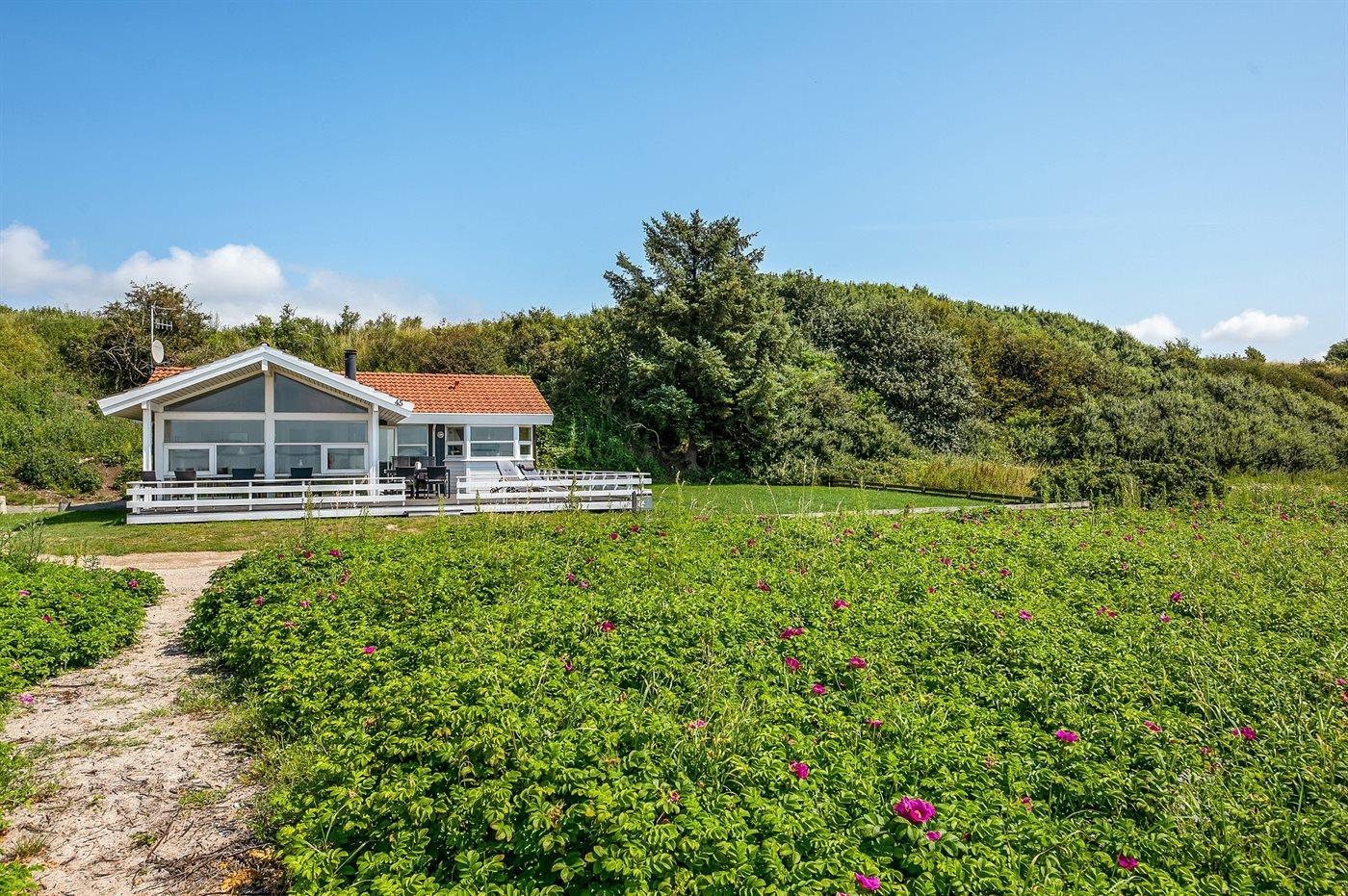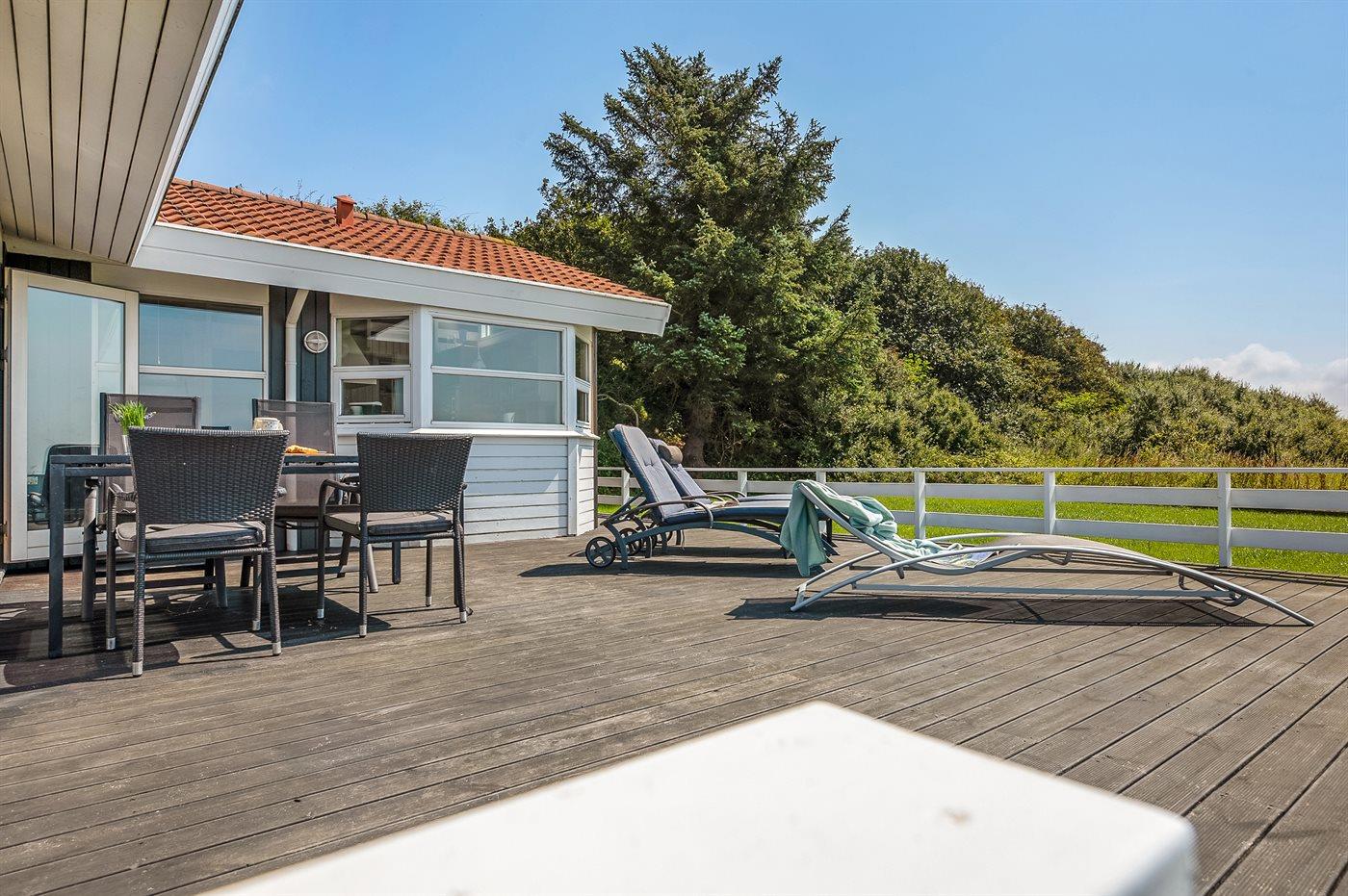 Ferieboligen er beliggende på en 640 m² stor naturgrund. Der er 20 m til havet. Nærmeste forretning er beliggende i en afstand af 12000 m. Til ferieboligen hører 60 m² terrasseareal. Desuden er der 10 m² overdækket terrasse. Der er garage til rådighed. Der er installeret stik til opladning af elbil. Parkering ved ferieboligen.