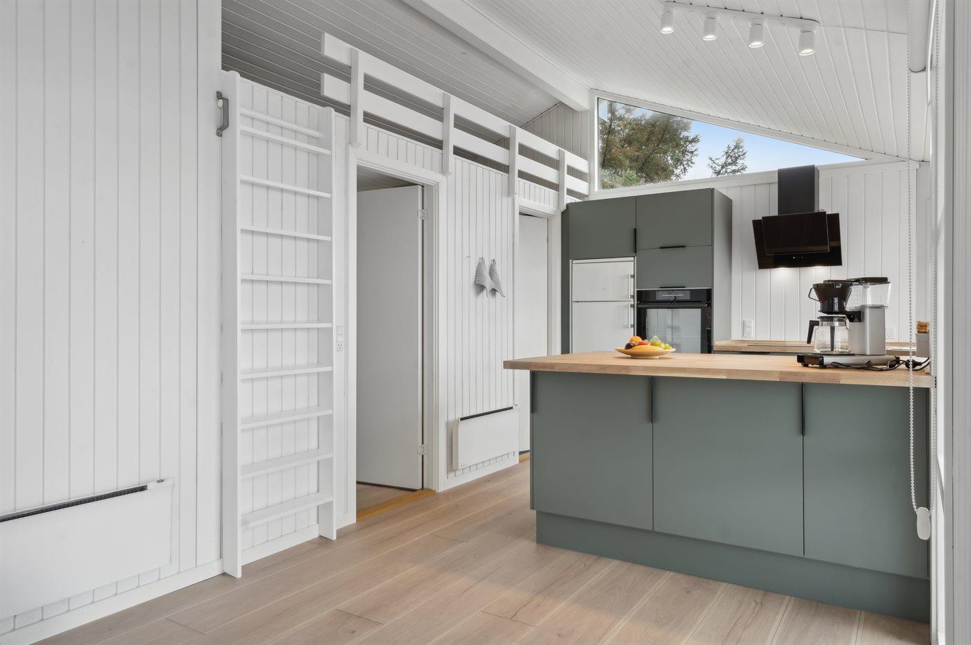 Køkkenet er udstyret med 1 køleskab. Der er 4 induktionskogeplader, bageovn, mikrobølgeovn samt opvaskemaskine.