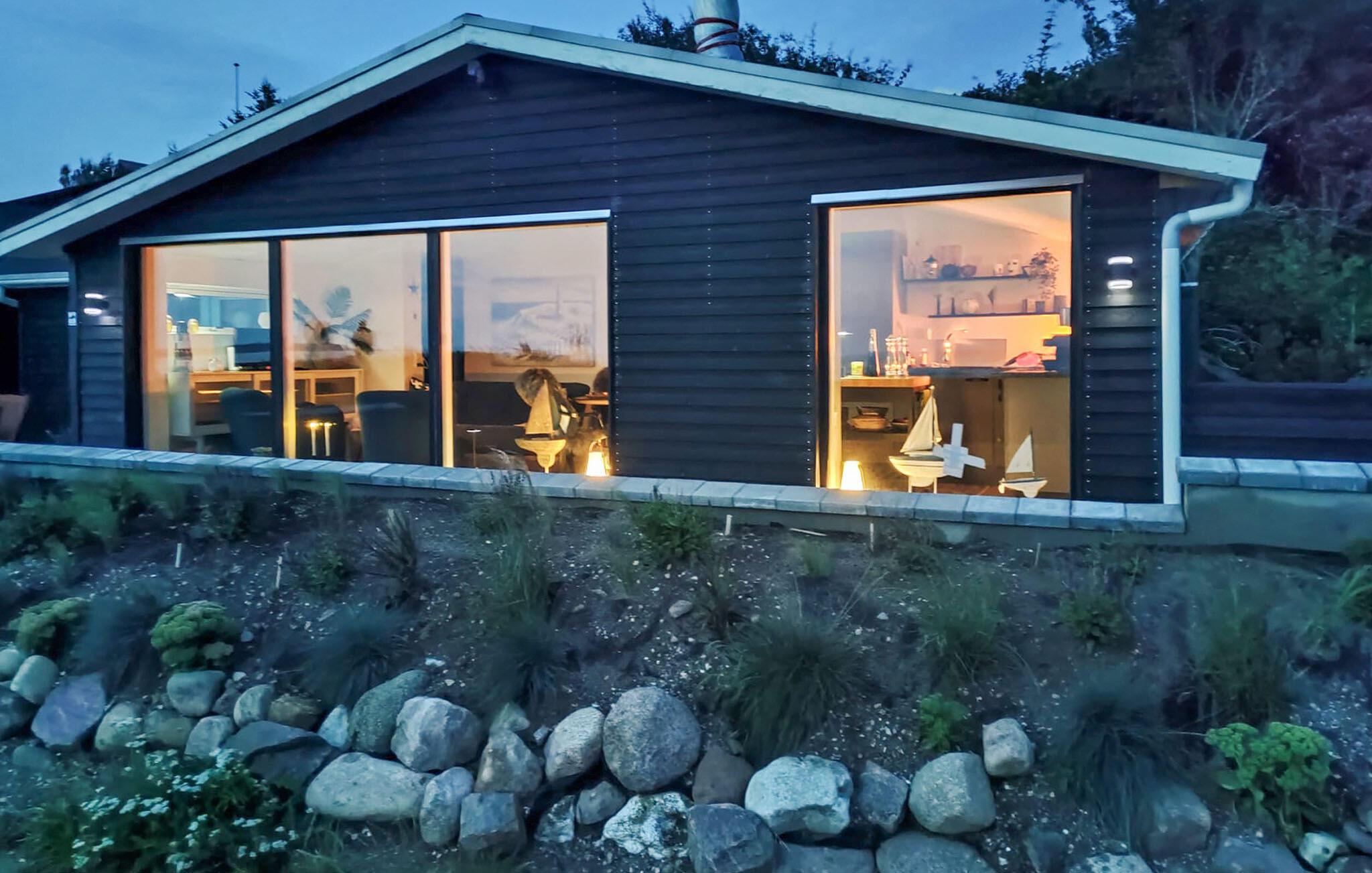 Hyggeligt sommerhus med panoramaudsigt over Lillebælt, tæt på stranden og badebroen i Sandager Næs.