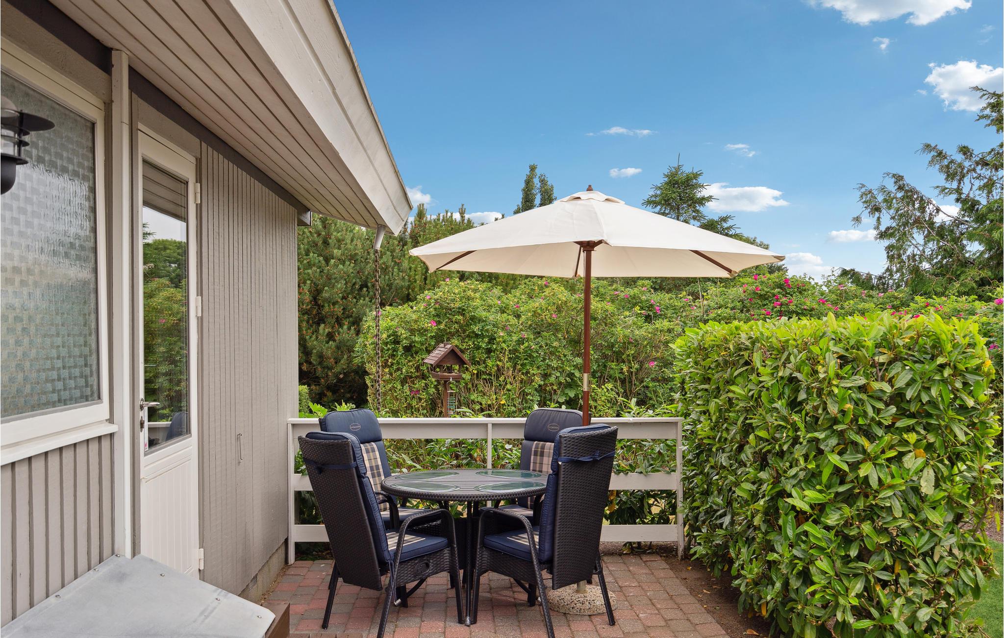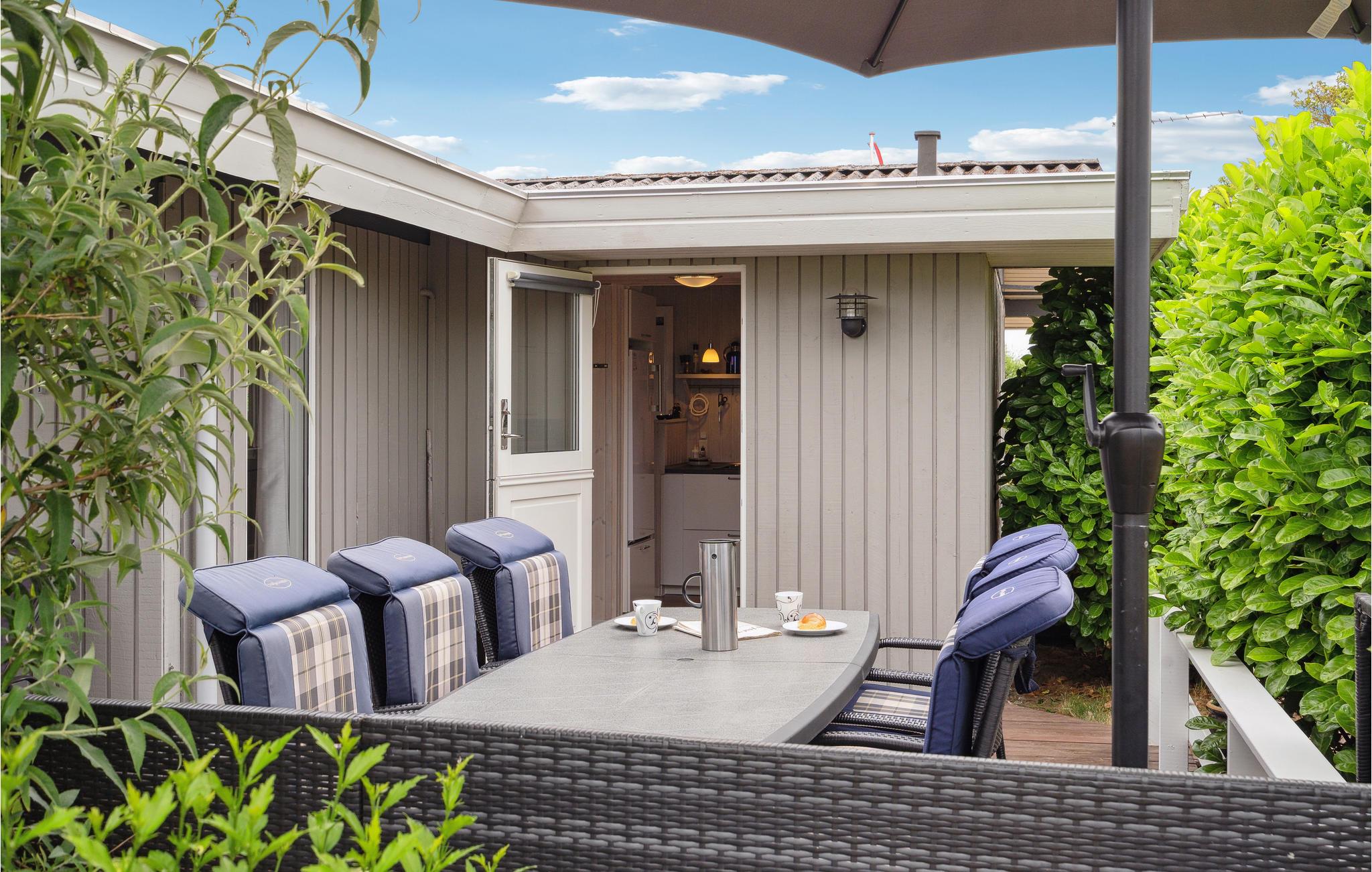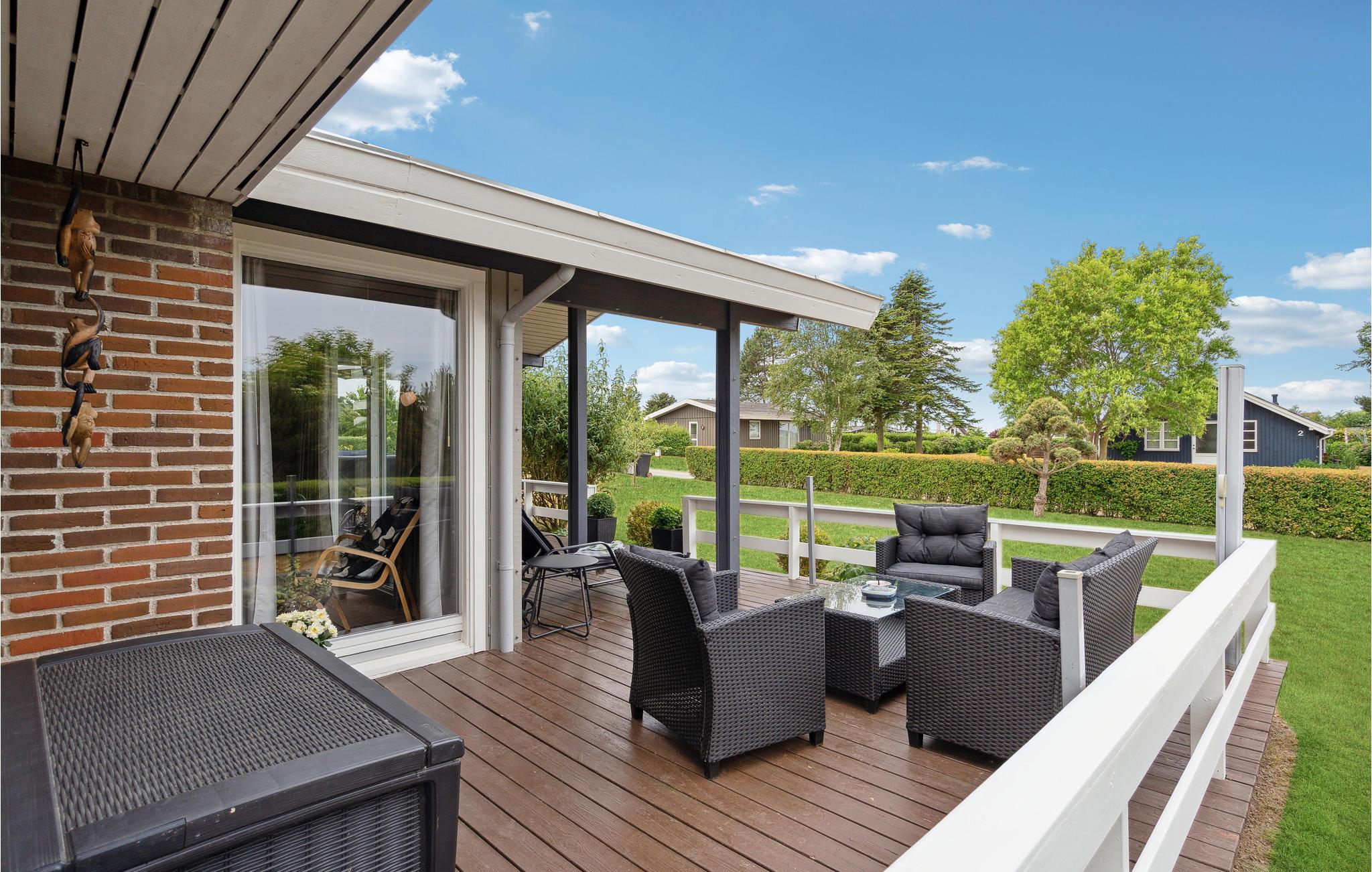 Hyggeligt feriehus ved Sandager Næs med brændeovn, flere terrasser og tæt på stranden og legeplads.