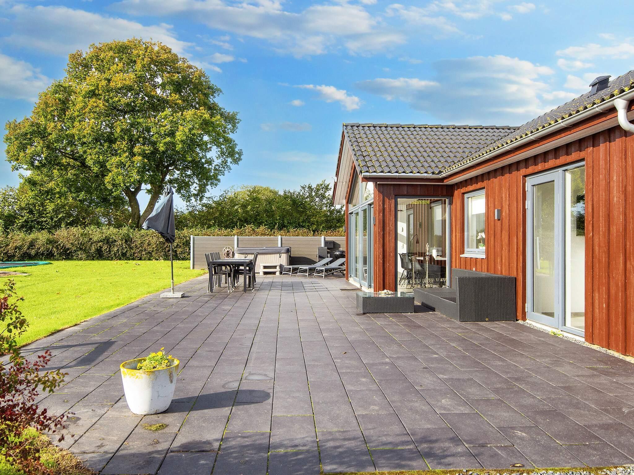 Alrummet har direkte udgang til det store terrasseområde, som er pænt indrettet med flere havemøbler og liggestole. På terrassen har du også adgang til det store udendørs spabad, hvor op til syv personer ad gangen kan stirre på stjernerne med et glas boble om aftenen. Indenfor fortsætter huset sit wellnessområde med infrarød sauna og spabad i et af badeværelserne.
