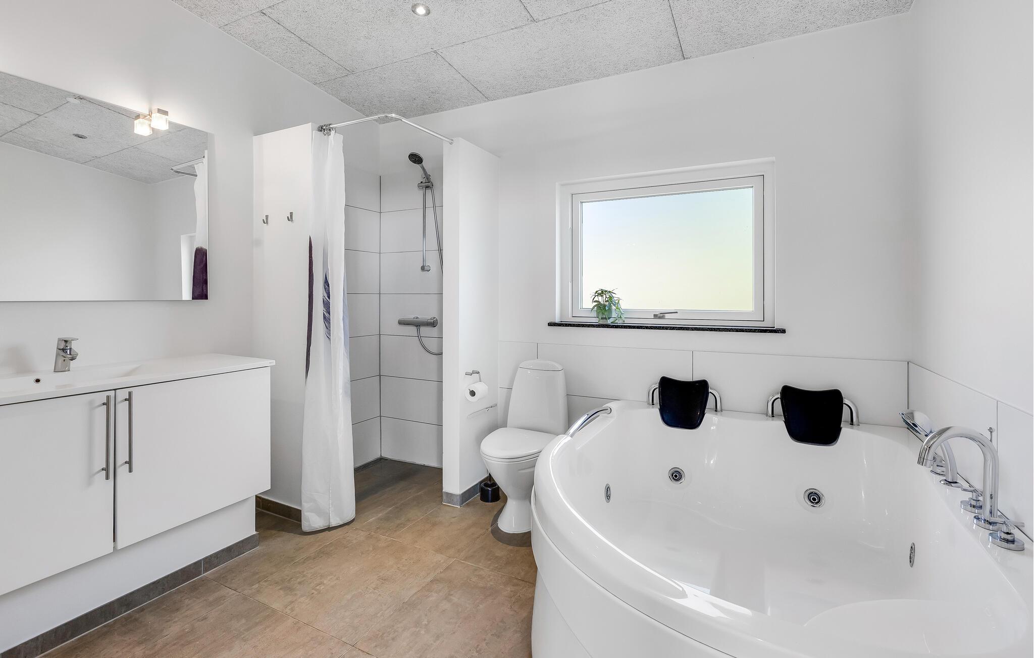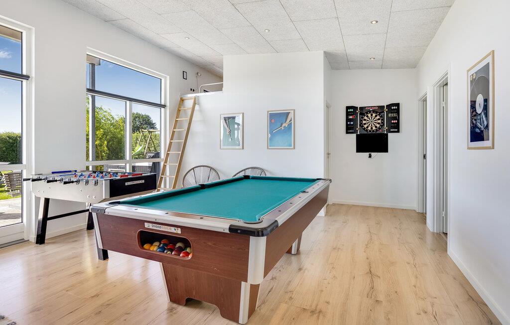 Dette rummelige sommerhus ligger i et område med en dejlig sandstrand og byder på mange aktivitetsmuligheder. Her findes nemlig et aktivitetsrum med mulighed for at vise jeres færdigheder i bordtennis, pool og bordfodbold. Bagefter kan I slappe af i det dejlige to-personers spabad eller nyde varmen fra den knitrende brændeovn. Soveværelserne er placeret, så de ikke ligger op mod hinanden. Udenfor finder I et udespa til 6 personer, hvor I kan nyde skøn ferieafslapning i det fri.