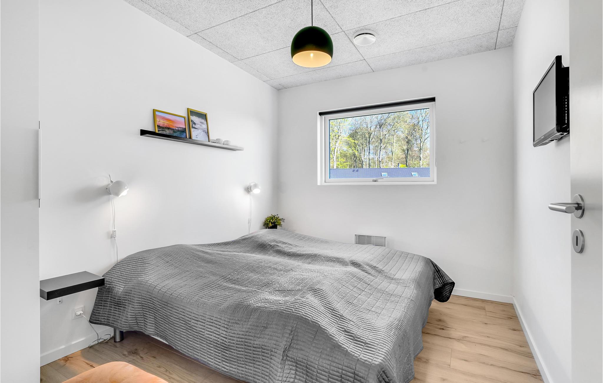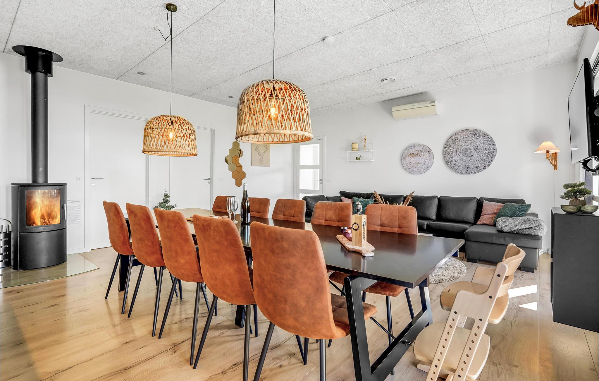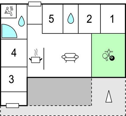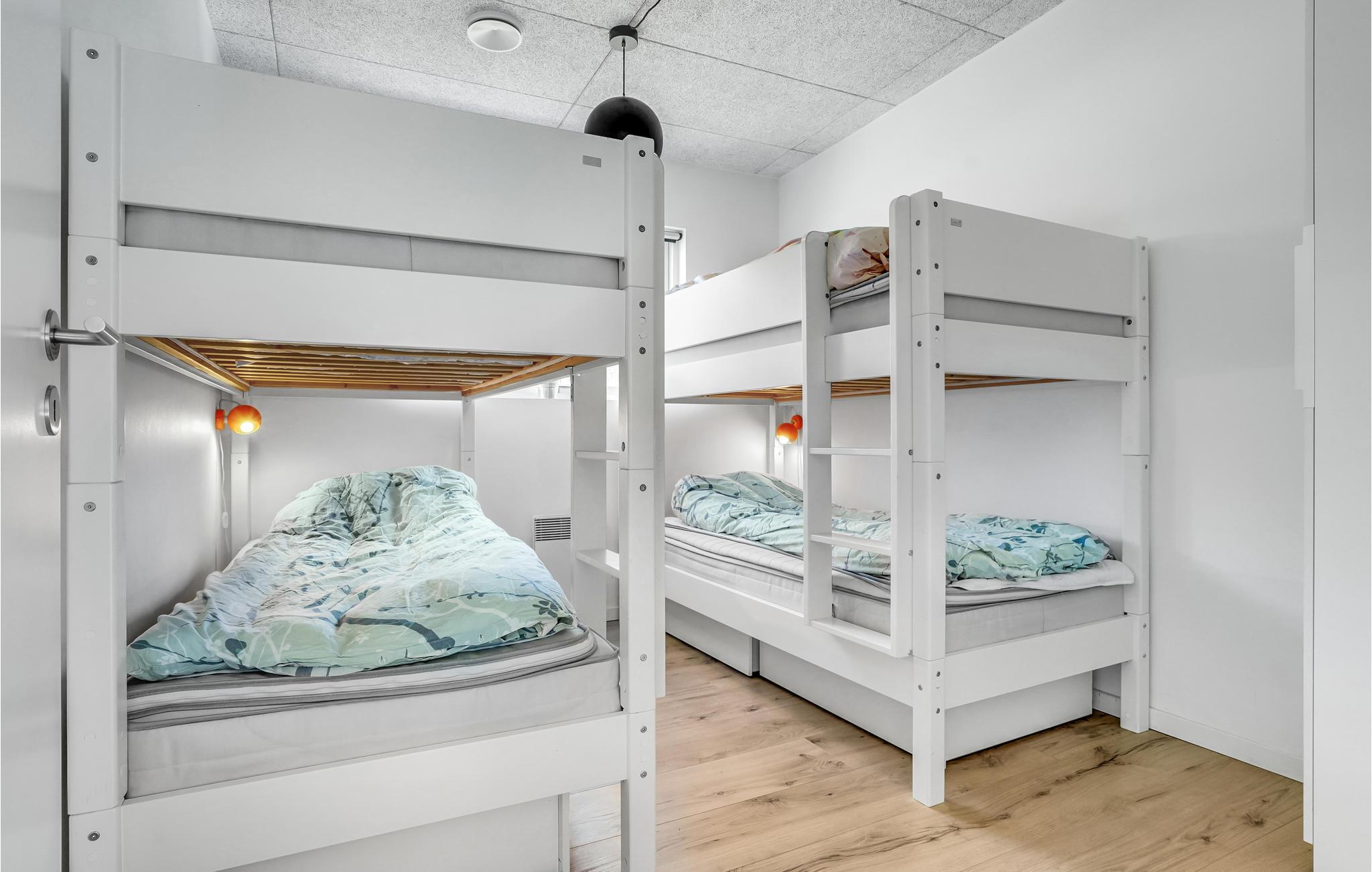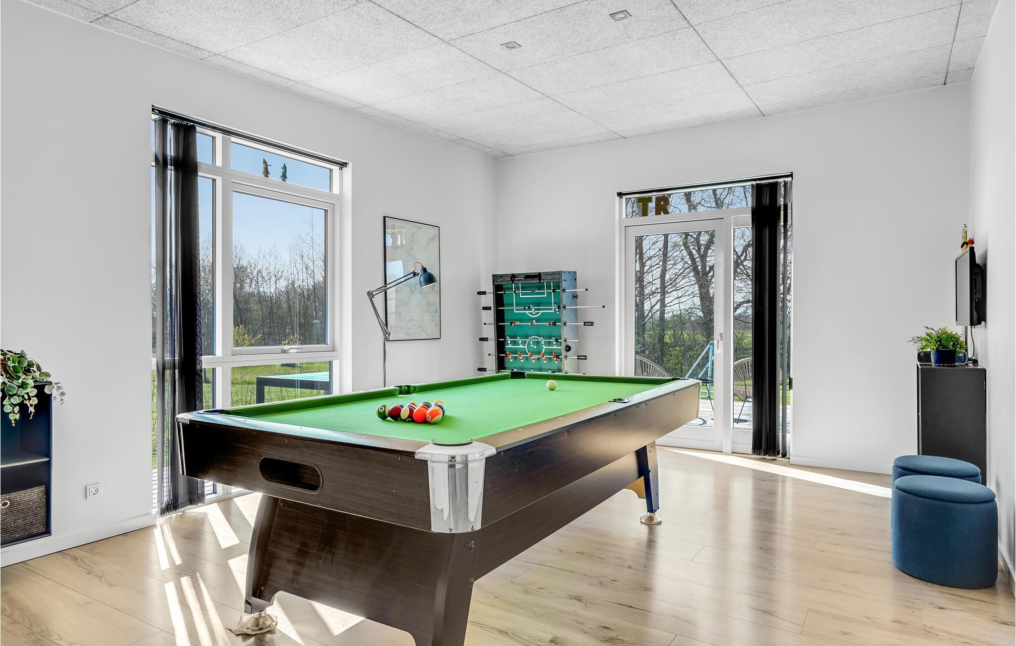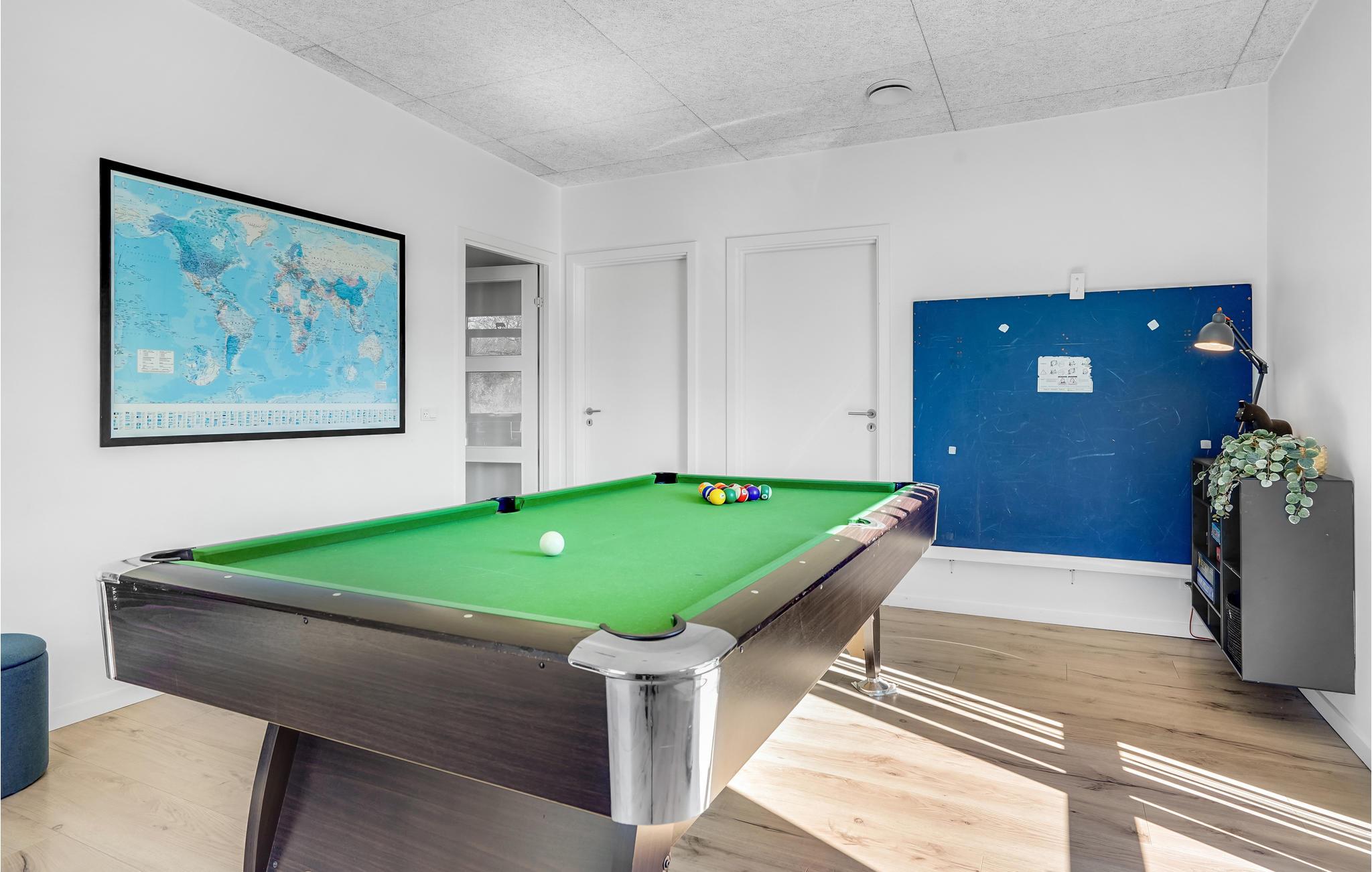 Huset er indrettet med et aktivitetsrum, hvor I kan få mange timer til at gå, her findes bl.a. billard, bordfodbold, bordtennis og spillemaskine. Det dejlige kombinerede køkken/alrum med opholdsstue har god plads til alle, og på kølige aftener kan I mødes omkring brændeovnen. I huset findes fem gode soverum, hvor køjesengene er monteret med rigtig gode boksmadrasser, så nattesøvnen er sikret. Værelserne er placeret i forskellige afdelinger af huset og alle værelser har eget TV, så det er ideelt for flere familier, der gerne vil holde ferie sammen. Desuden to flotte badeværelser, det ene indeholdende et dejligt 2-personers spabad og adgang til sauna.
