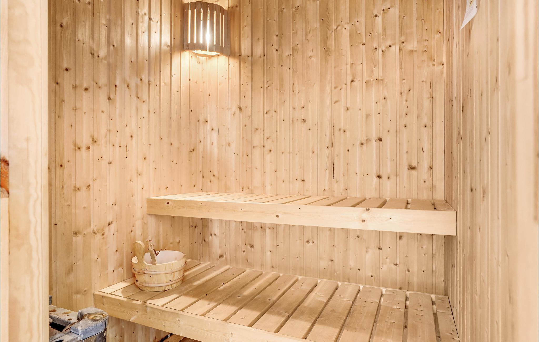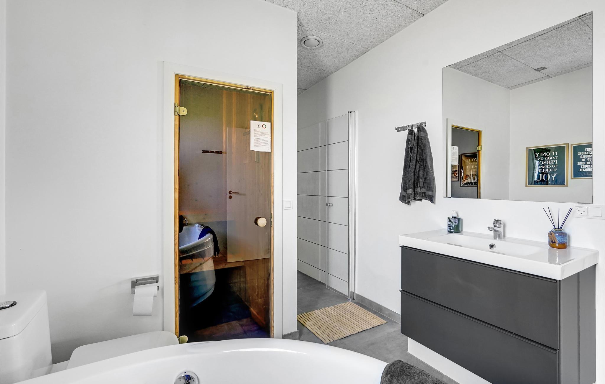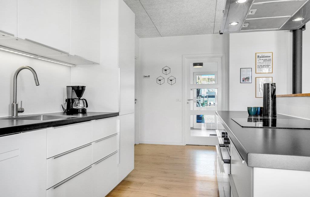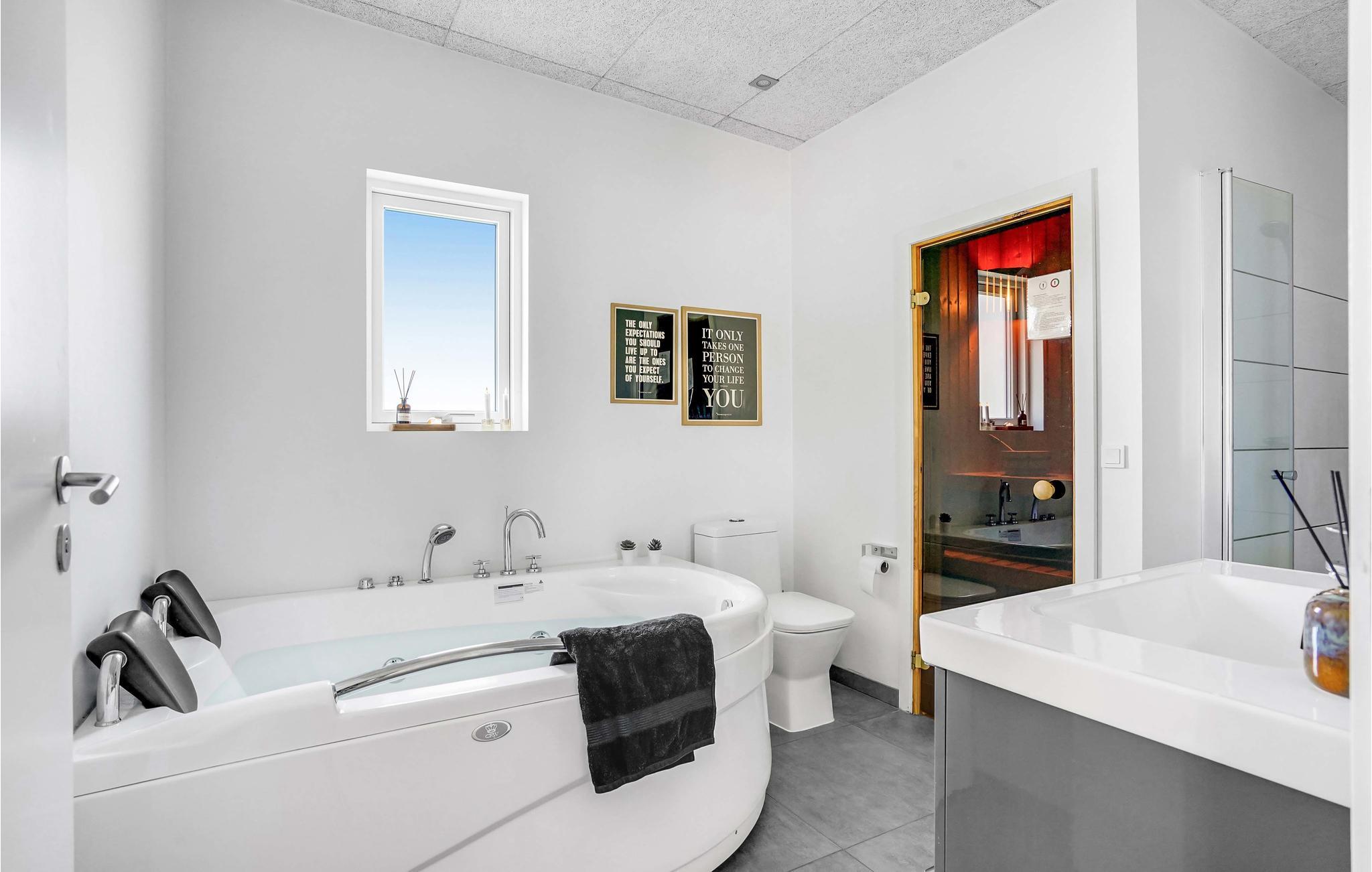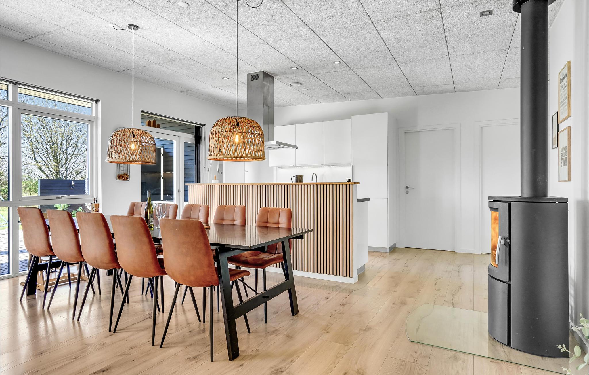 Huset er indrettet med et aktivitetsrum, hvor I kan få mange timer til at gå, her findes bl.a. billard, bordfodbold, bordtennis og spillemaskine. Det dejlige kombinerede køkken/alrum med opholdsstue har god plads til alle, og på kølige aftener kan I mødes omkring brændeovnen. I huset findes fem gode soverum, hvor køjesengene er monteret med rigtig gode boksmadrasser, så nattesøvnen er sikret. Værelserne er placeret i forskellige afdelinger af huset og alle værelser har eget TV, så det er ideelt for flere familier, der gerne vil holde ferie sammen. Desuden to flotte badeværelser, det ene indeholdende et dejligt 2-personers spabad og adgang til sauna.