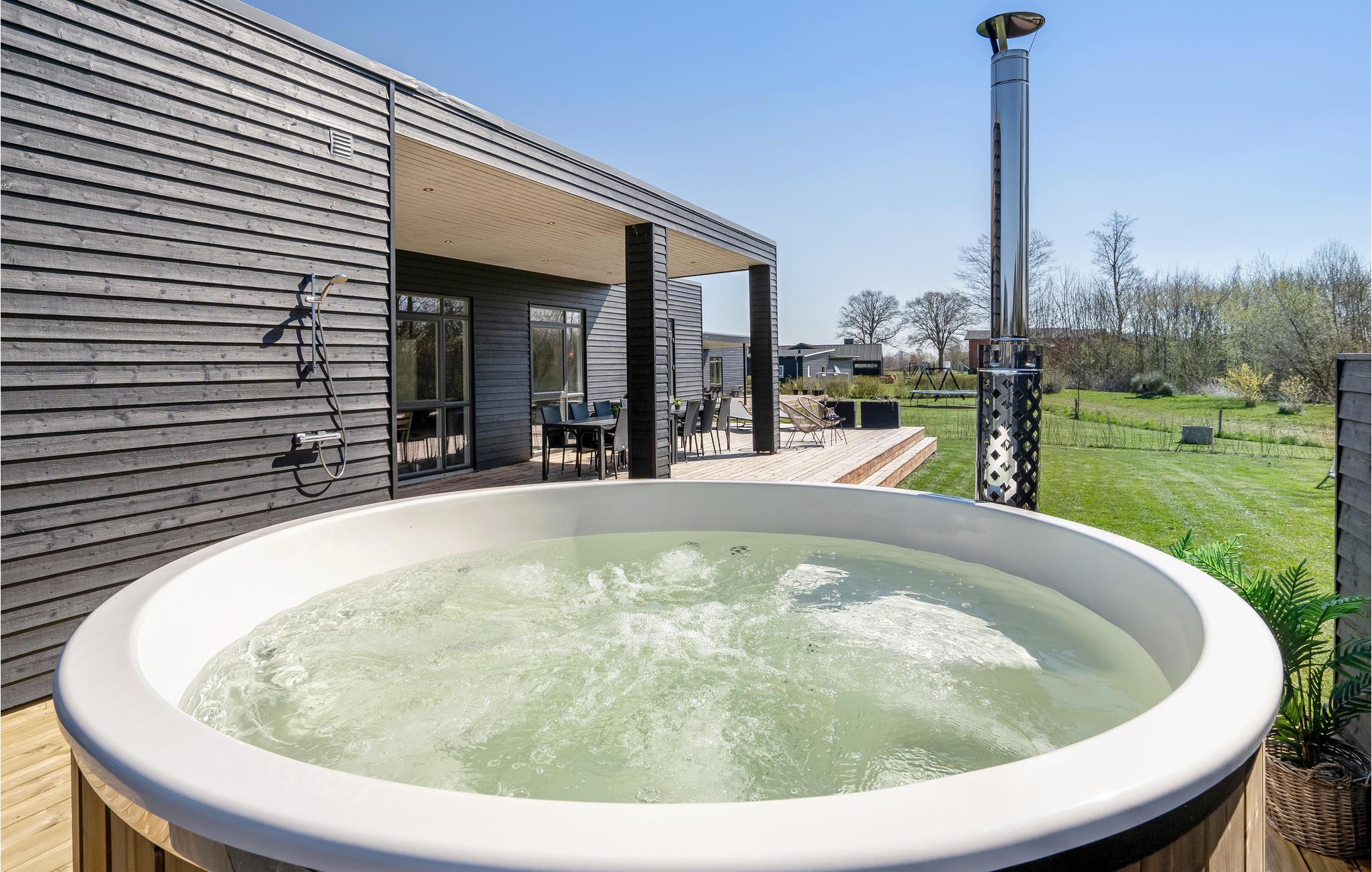 Lækkert sommerhus ved Sandersvig Strand med aktivitetsrum, spabad og sauna, tæt på natur og børnevenlig strand.