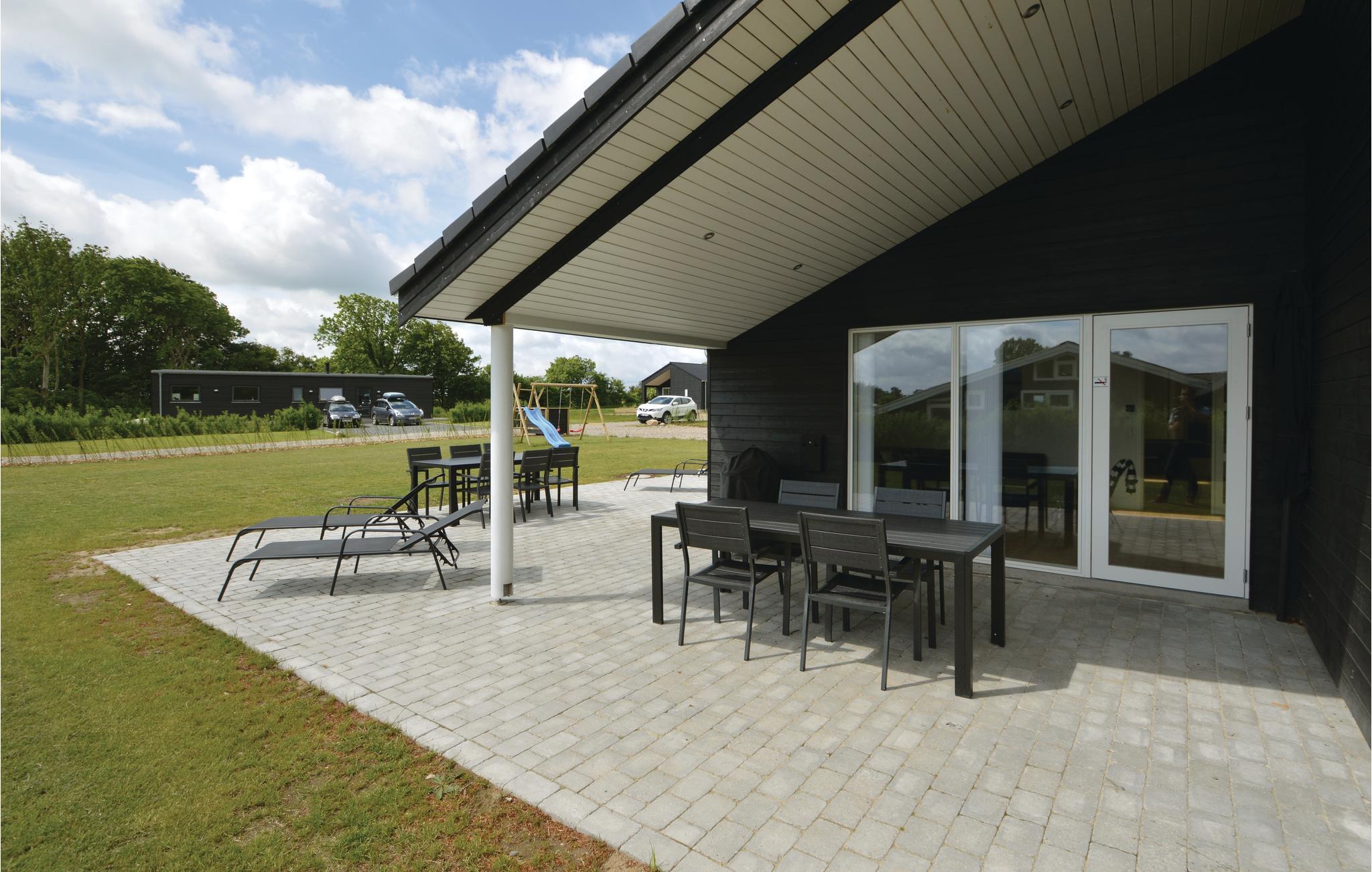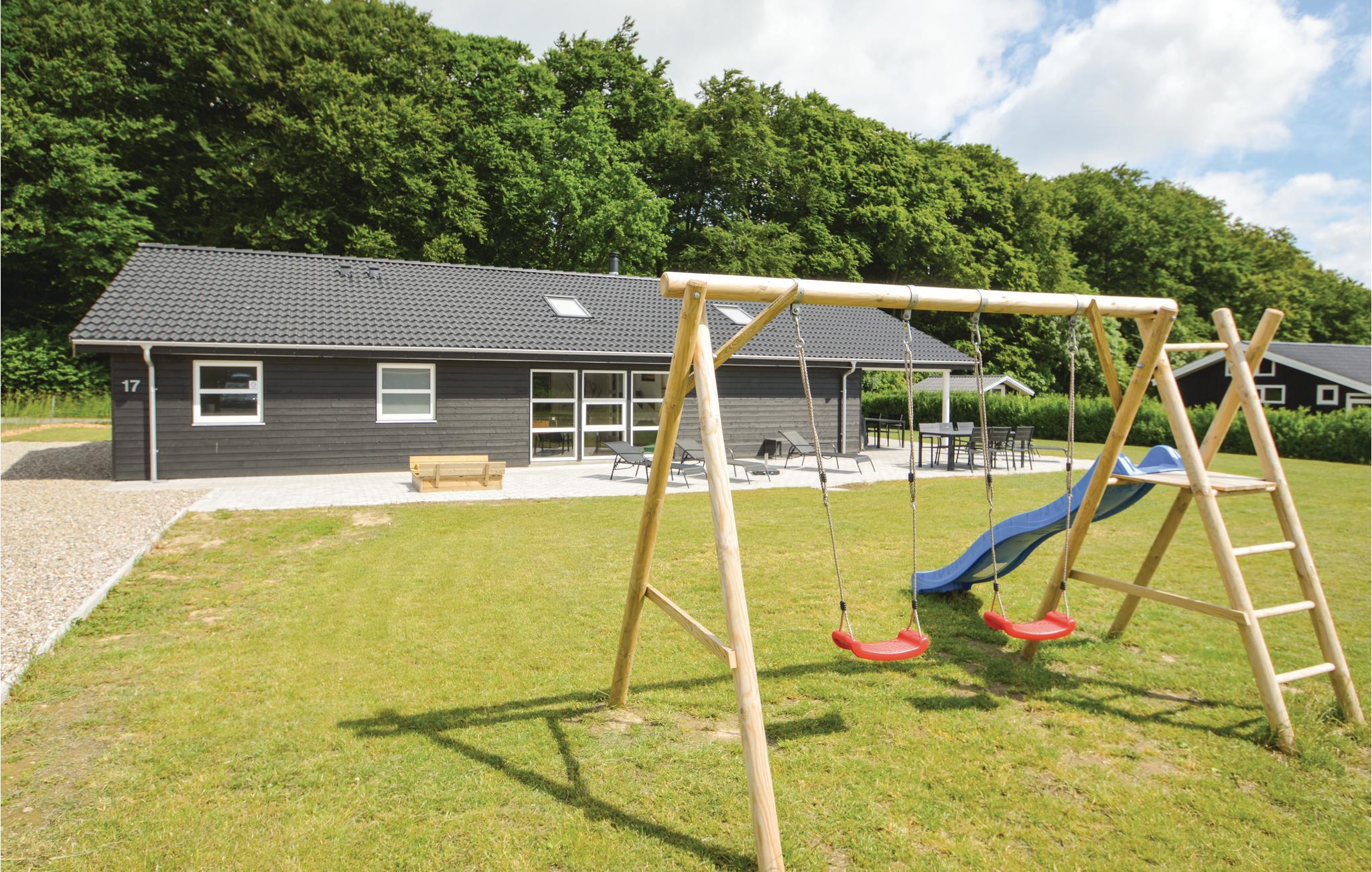 Moderne sommerhus nær strand og skov med wellness, aktivitetsrum og stor terrasse for en komfortabel ferie.