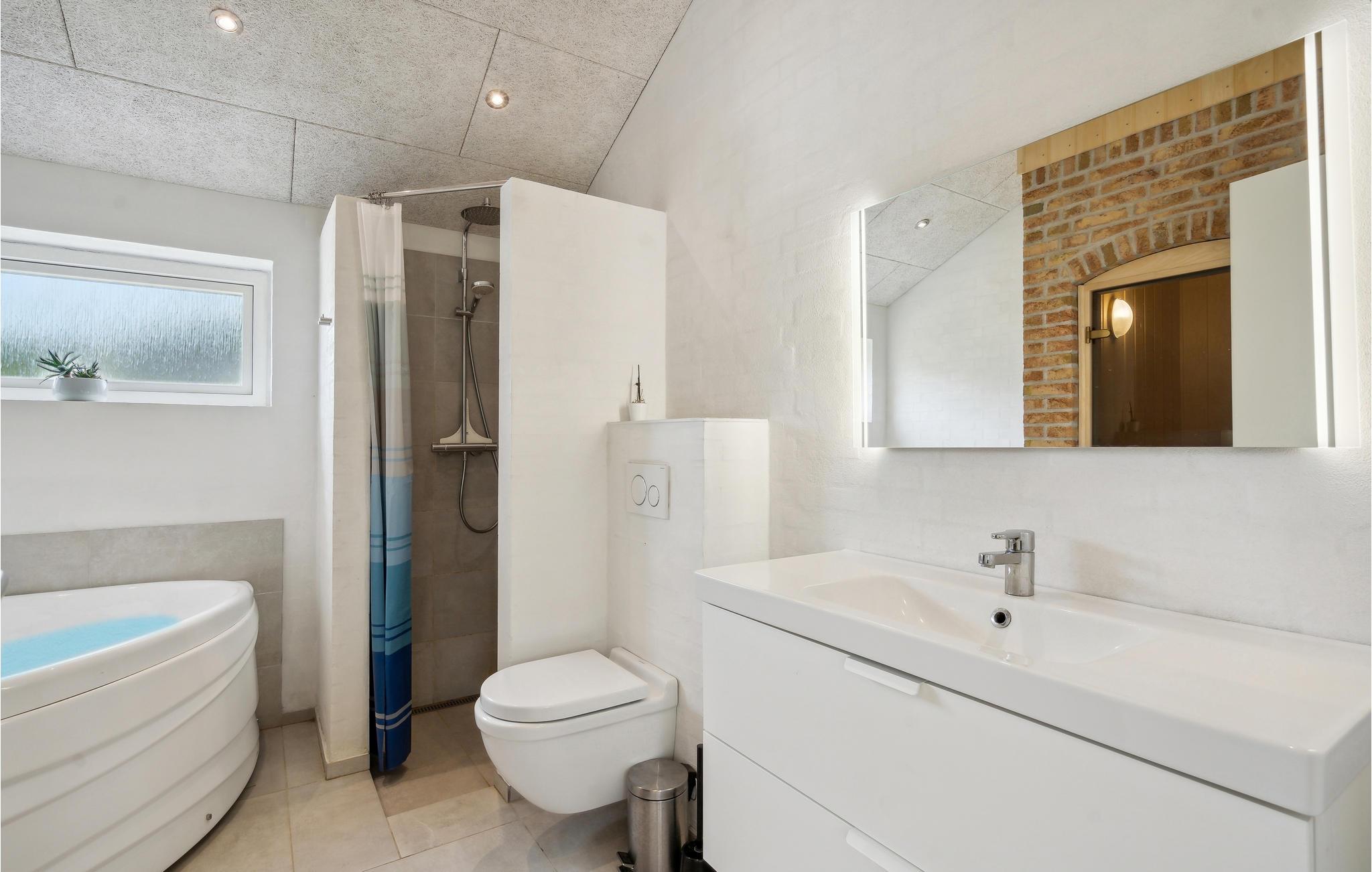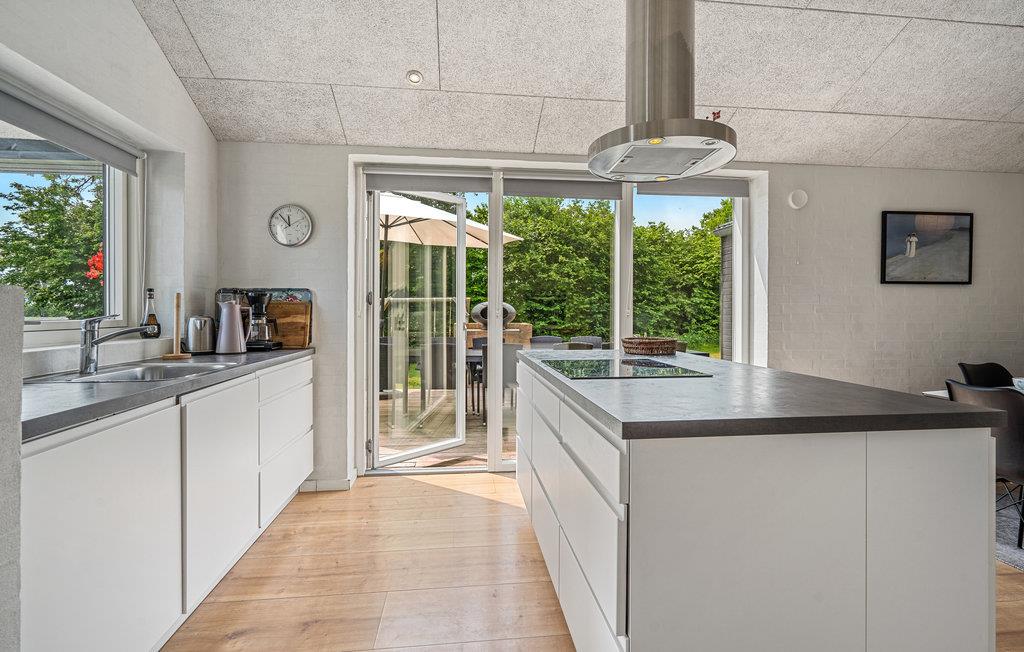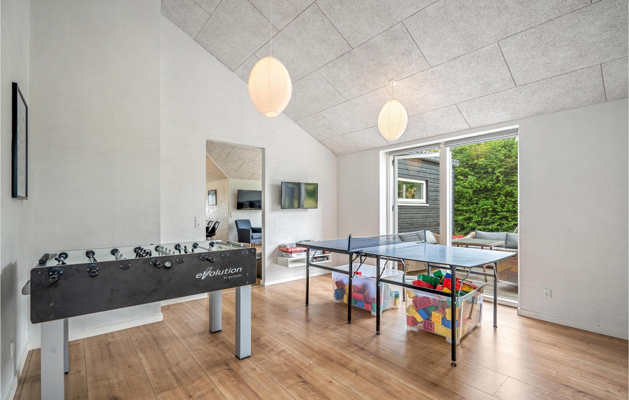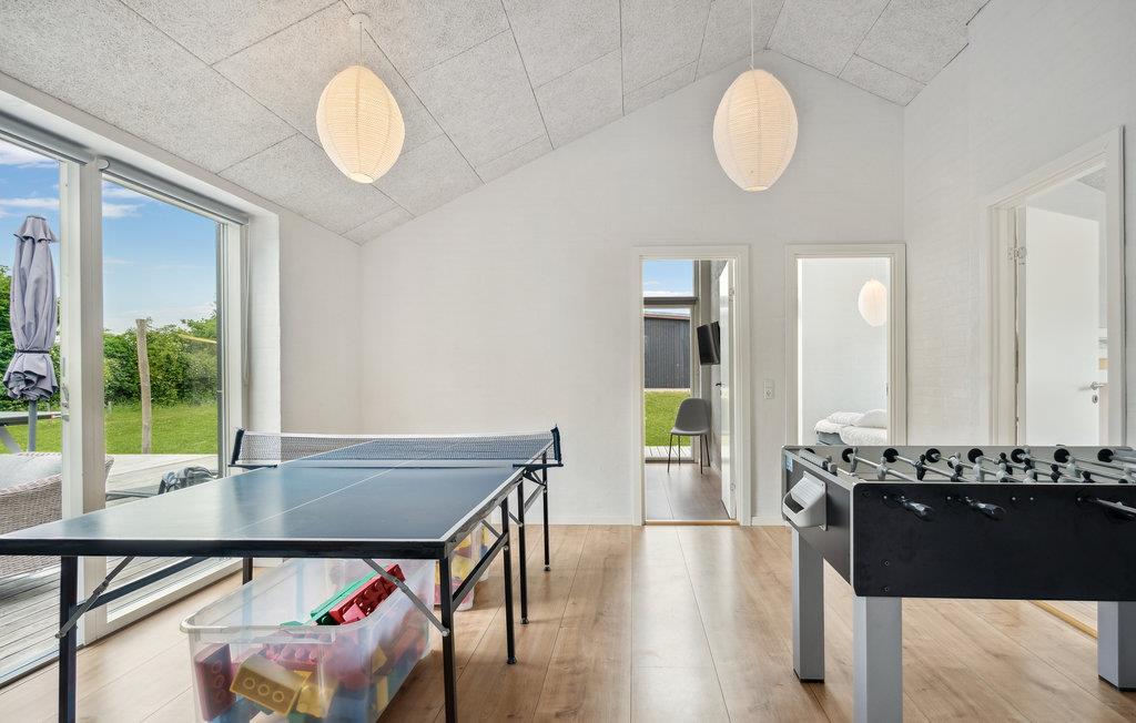 Rigtig lækkert sommerhus opført i 2019, beliggende i et skønt område med kort afstand til stranden. Huset er indrettet med et aktivitetsrum, hvor I kan få mange timer til at gå, her findes bordfodbold, bordtennis og ekstra tv. Det dejlige kombinerede køkken/alrum med opholdsstue har god plads til alle, og på kølige aftener kan I mødes omkring brændeovnen. I huset findes fem gode soveværelser hvor der i de to er eget tv. Desuden to flotte badeværelser, det ene indeholdende et dejligt badekar og adgang til sauna.