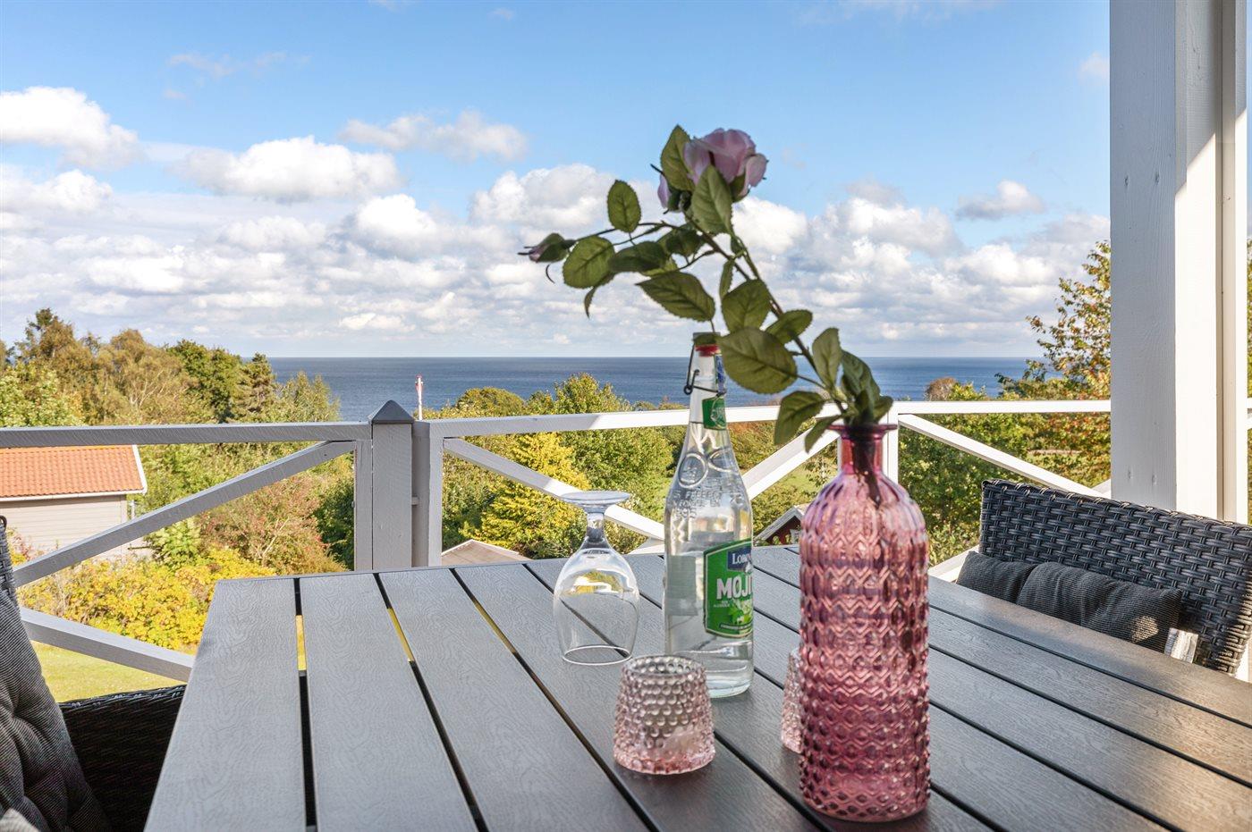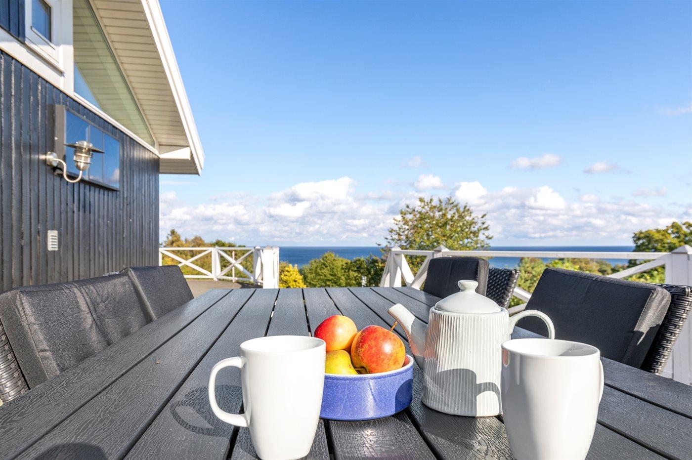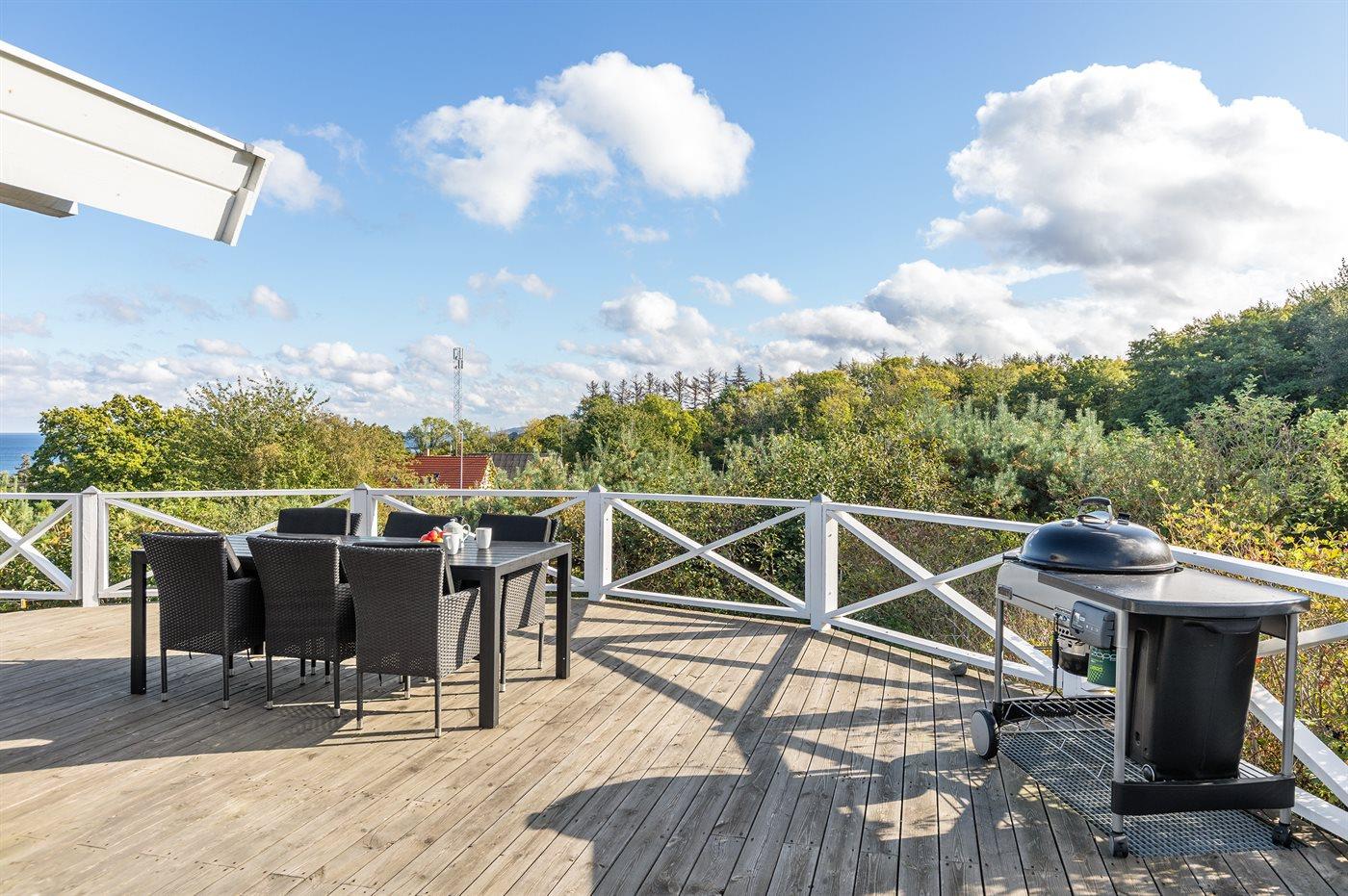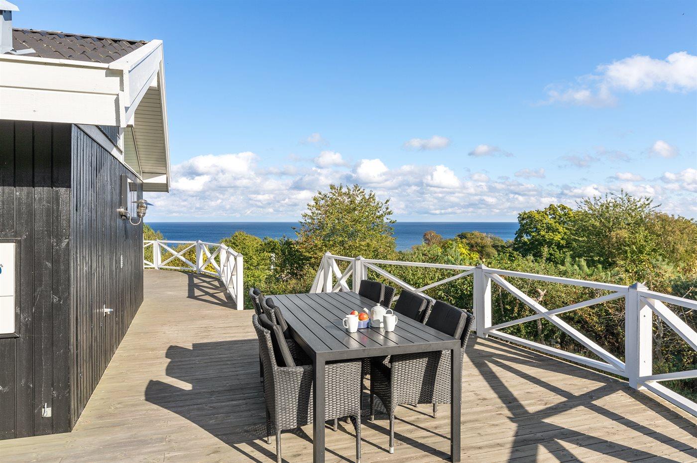 Smagfuldt sommerhus med panoramaudsigt over Østersøen og stor terrasse i Sandkås.