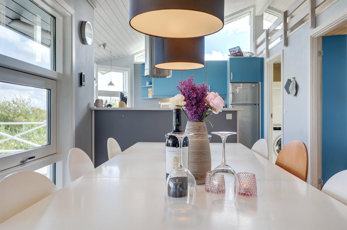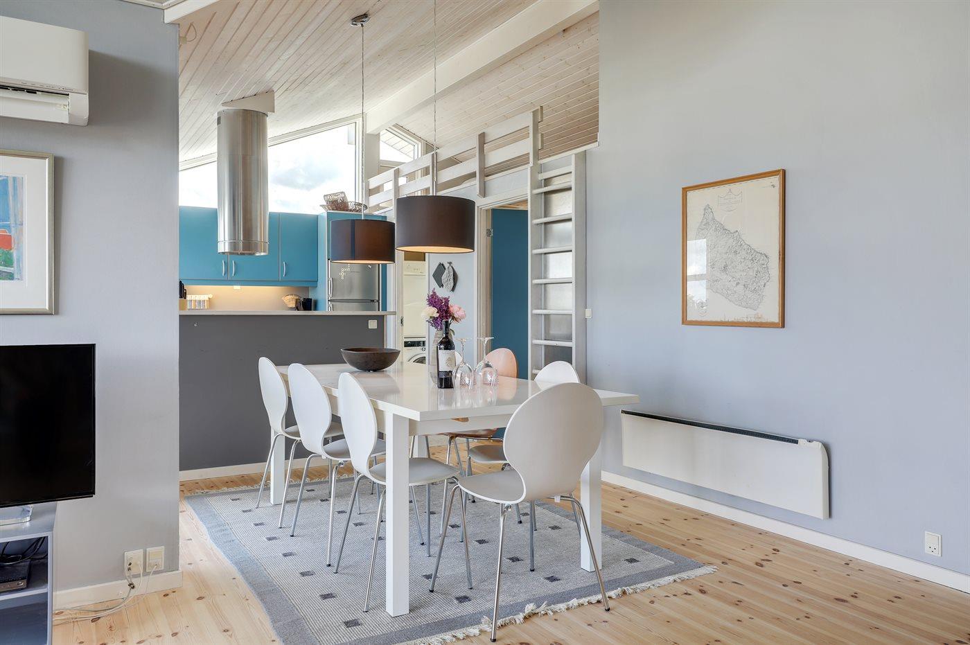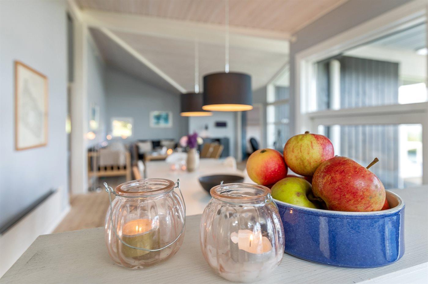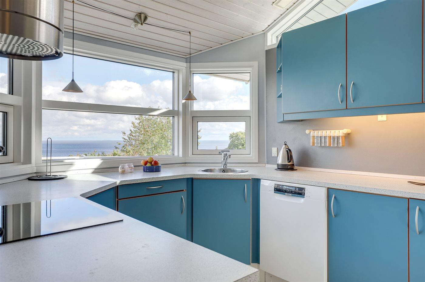 Køkkenet er udstyret med 1 køleskab. Der er 4 induktionskogeplader, varmluftovn (med pyrolyse), mikrobølgeovn samt opvaskemaskine.