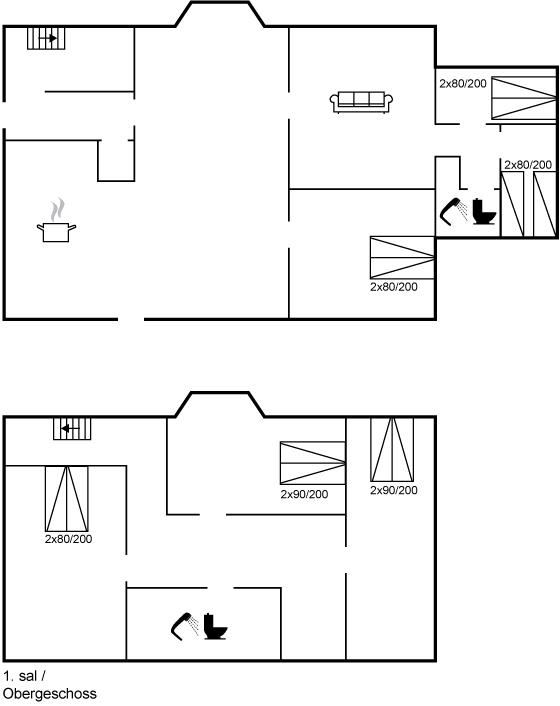 Der er i alt 6 soveværelser. Sovepladserne fordeler sig på: 10 sovepladser i dobbeltsenge. 2 sovepladser i enkeltsenge.