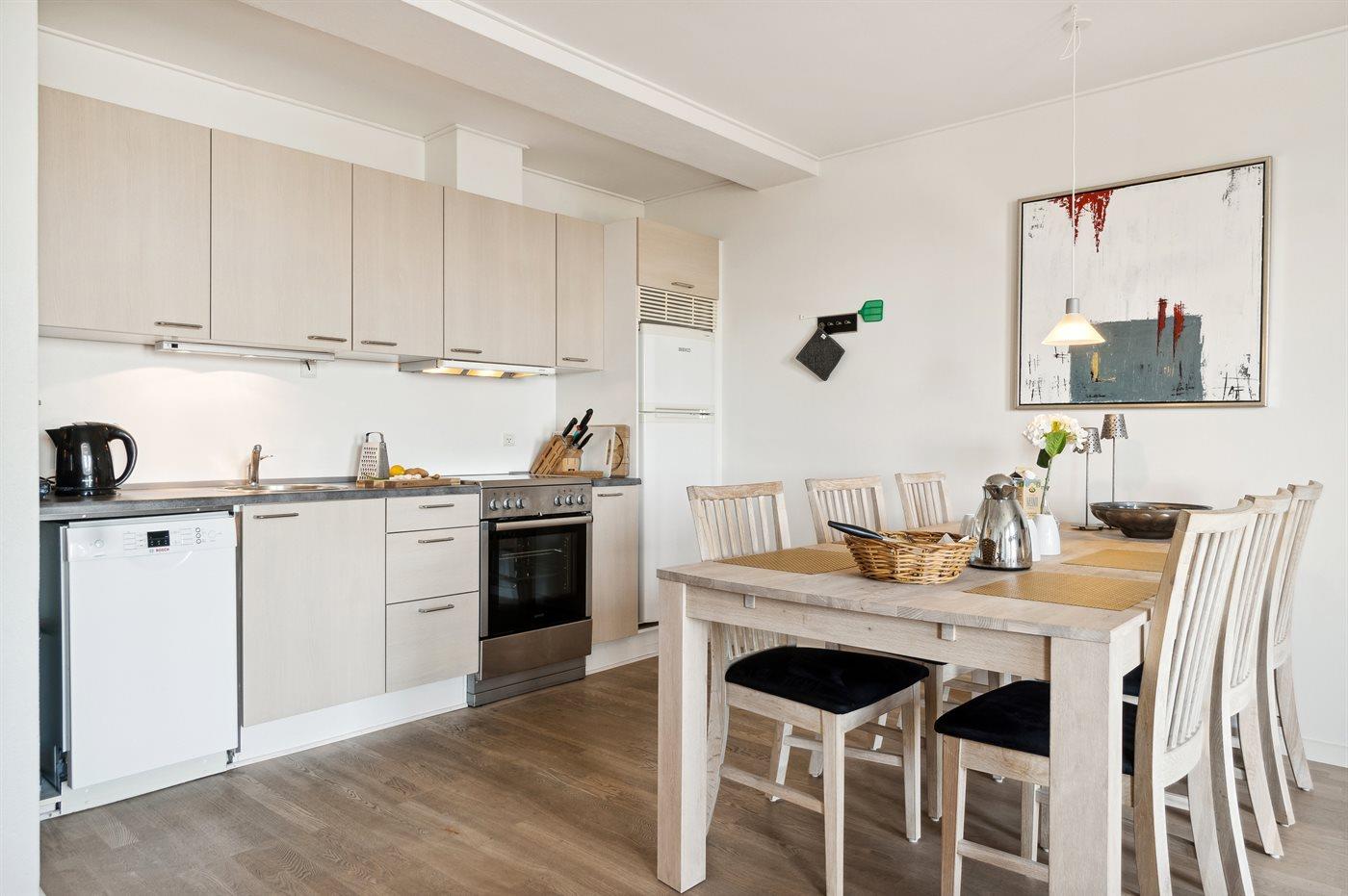Køkkenet er udstyret med 1 køleskab. Der er 4 keramiske kogeplader, varmluftovn samt opvaskemaskine.