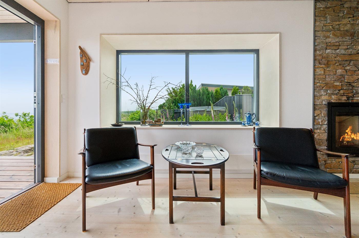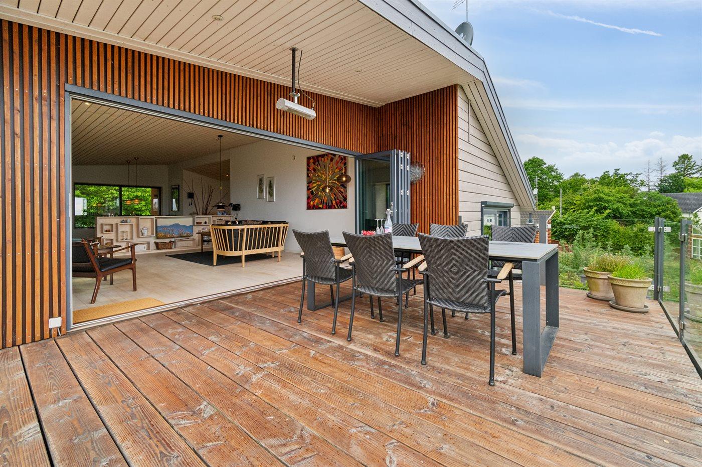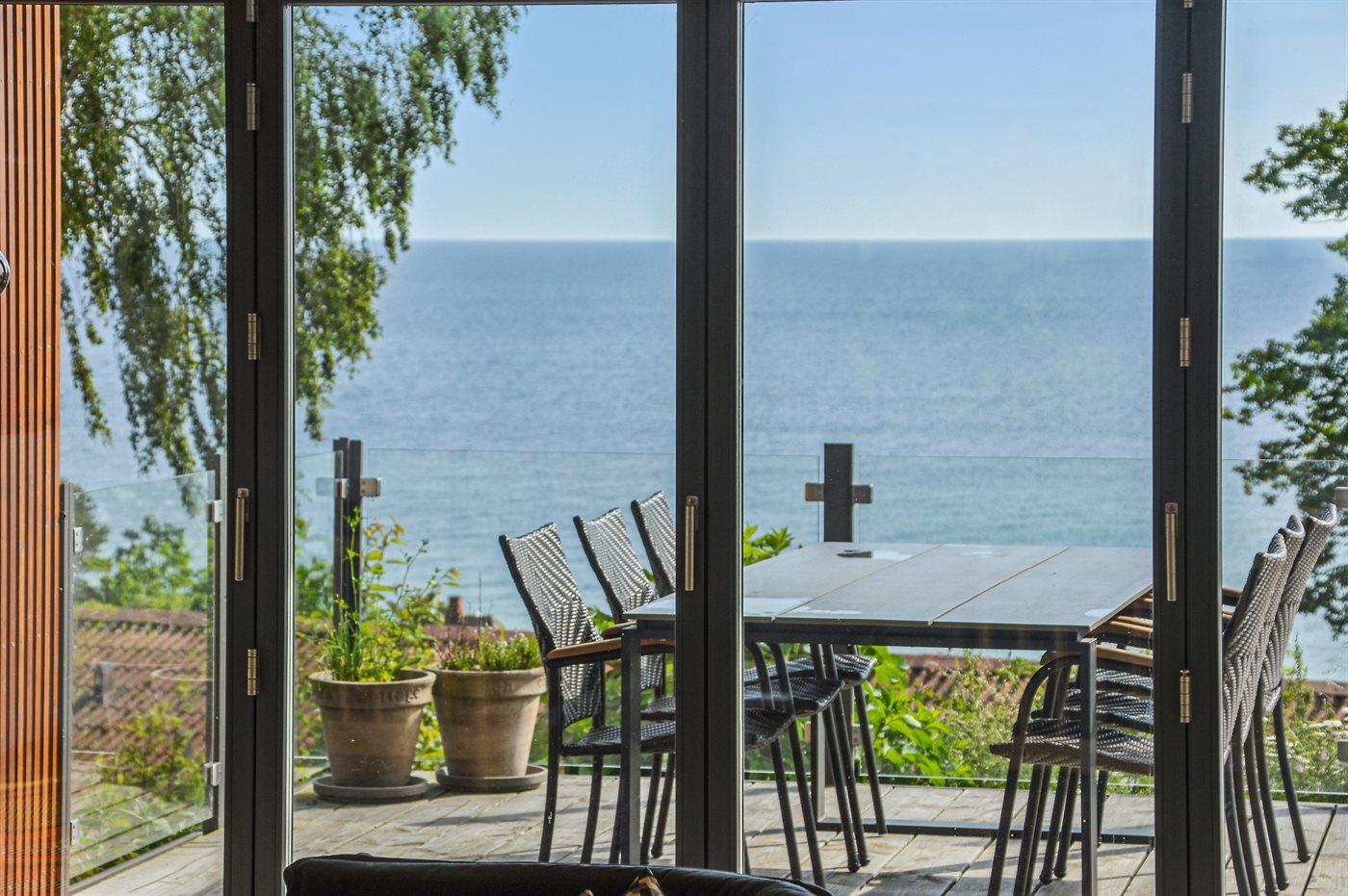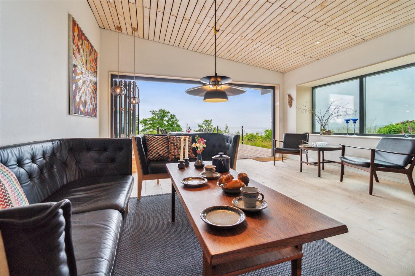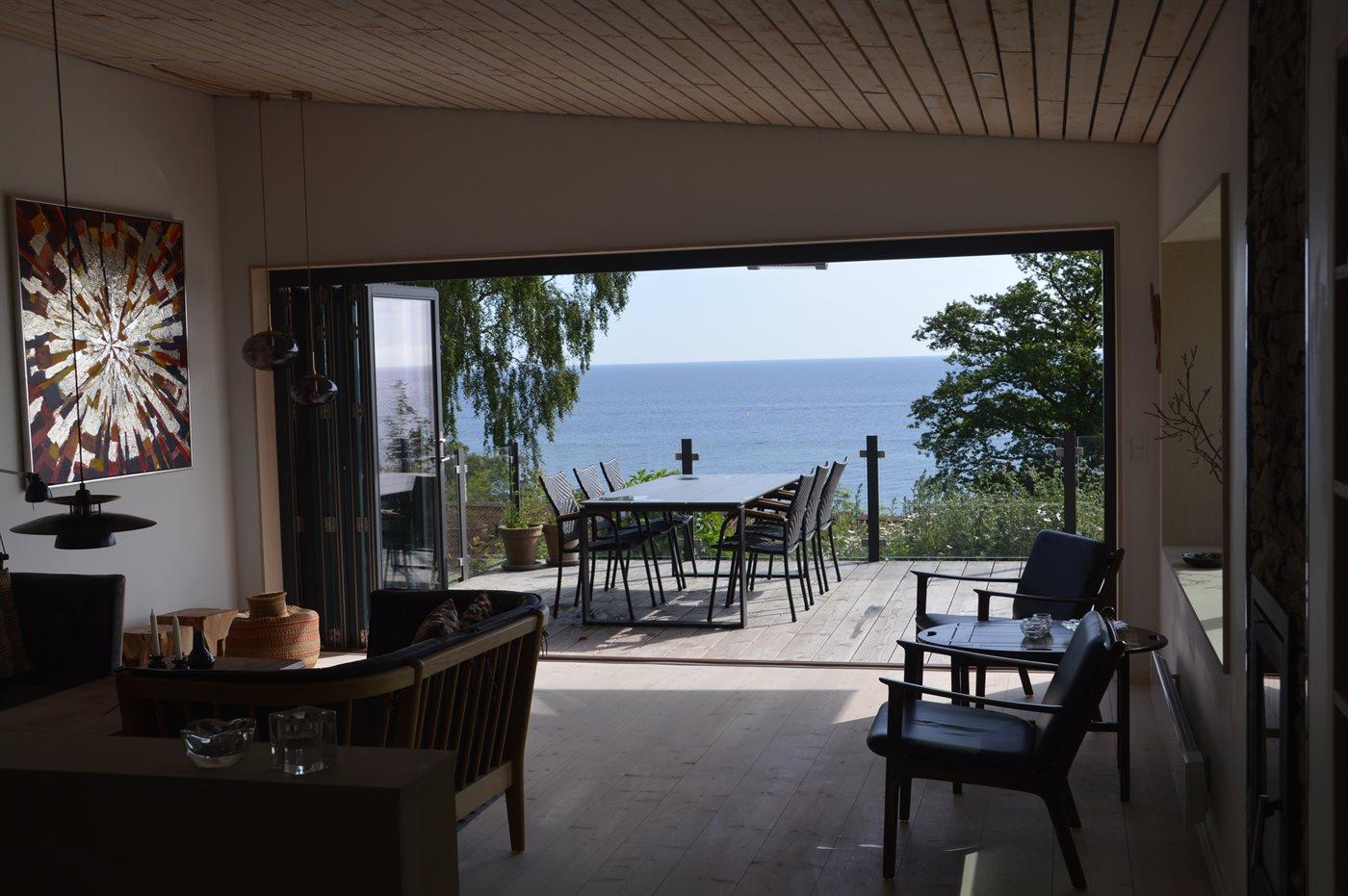 Mod havet kan man åbne et stort glasparti og stuen og den store terrasse skaber et skønt leverum.