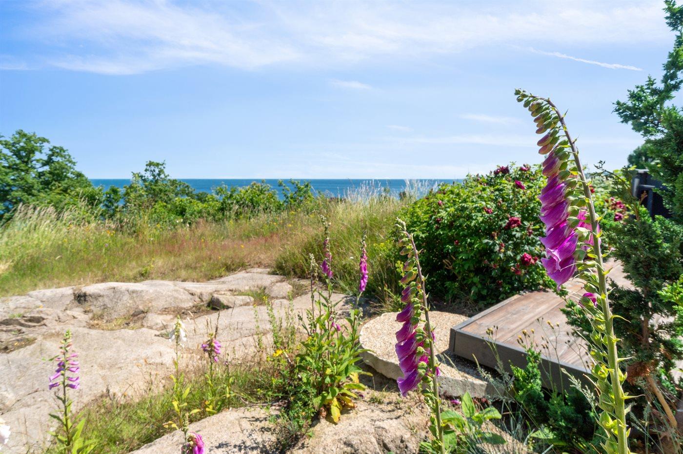Huset er beliggende på en 1000 m² stor naturgrund med klippefremspring, der ligger ca. 200 m fra havet.