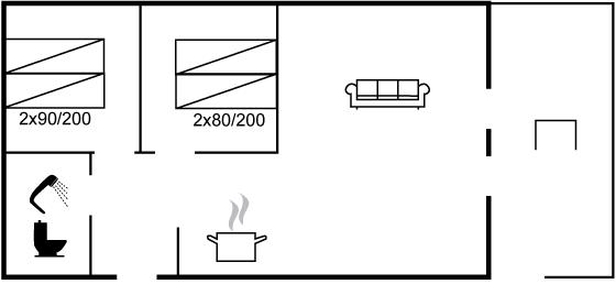 Der er i alt 2 soveværelser. Sovepladserne fordeler sig på: 4 sovepladser i dobbeltsenge. 2 sovepladser på madrasser. 2 af disse sovepladser befinder sig på husets hems.