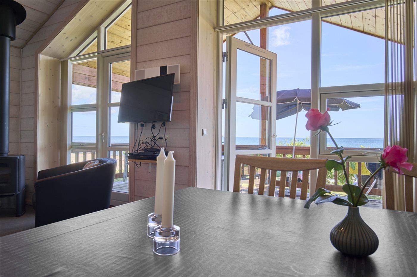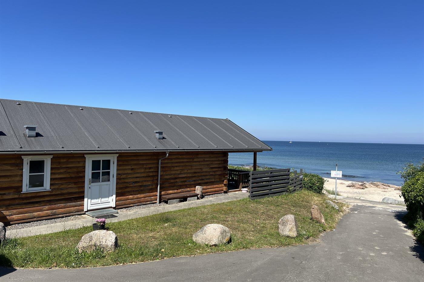 Moderne feriehus i træ beliggende i vandkanten i Sandkås på strandgrund ca. 10 meter fra havet. Panoramaudsigt over Østersøen. Terrassen er delvist overdækket og vender naturligvis ud mod havet, så man kan følge solens gang på himmelen.
