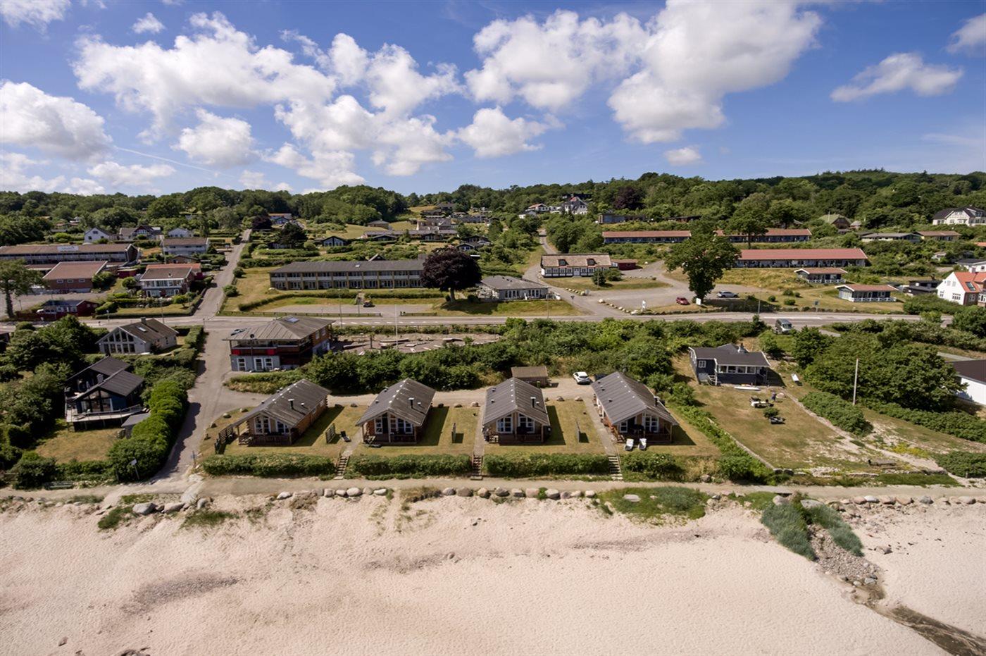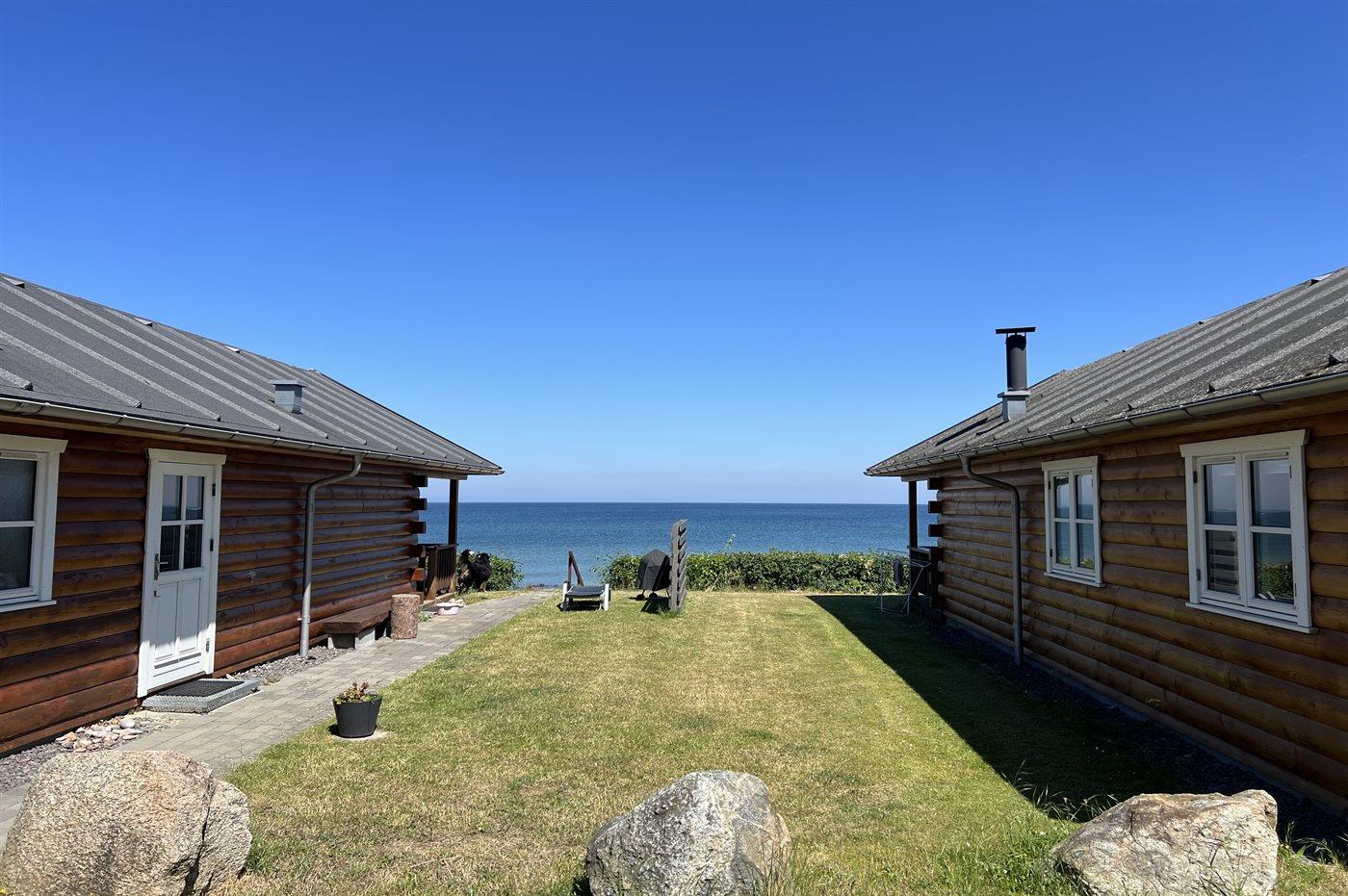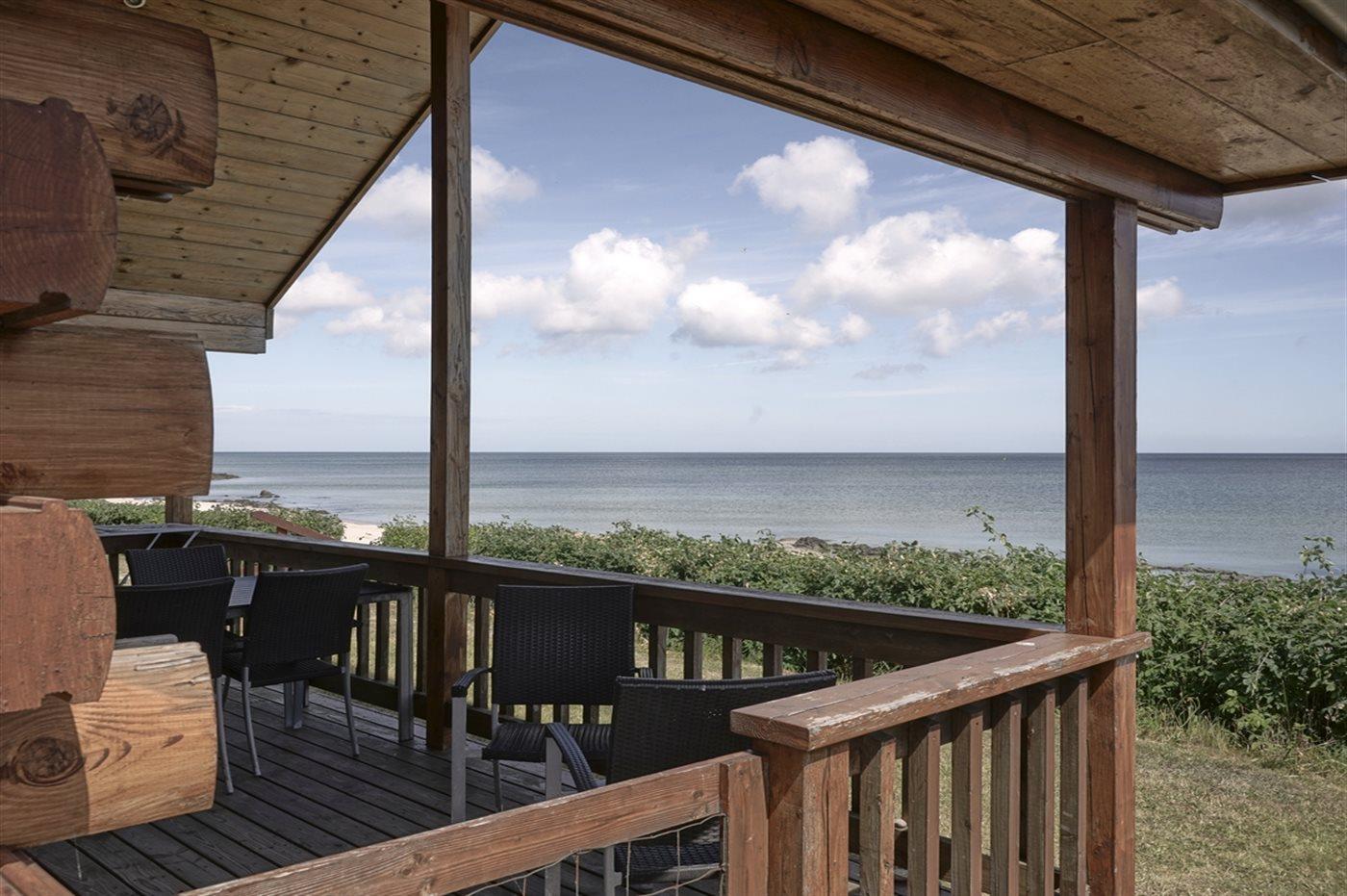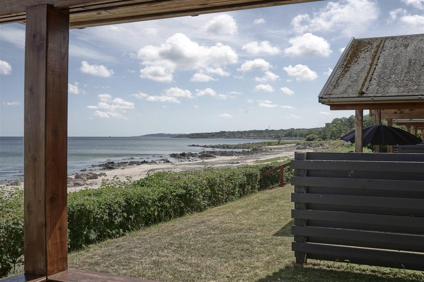 Moderne feriehus i træ beliggende i vandkanten i Sandkås på strandgrund ca. 10 meter fra havet - med panoramaudsigt over Østersøen. Terrassen er delvist overdækket og vender naturligvis ud mod havet, så man kan følge solens gang på himmelen.