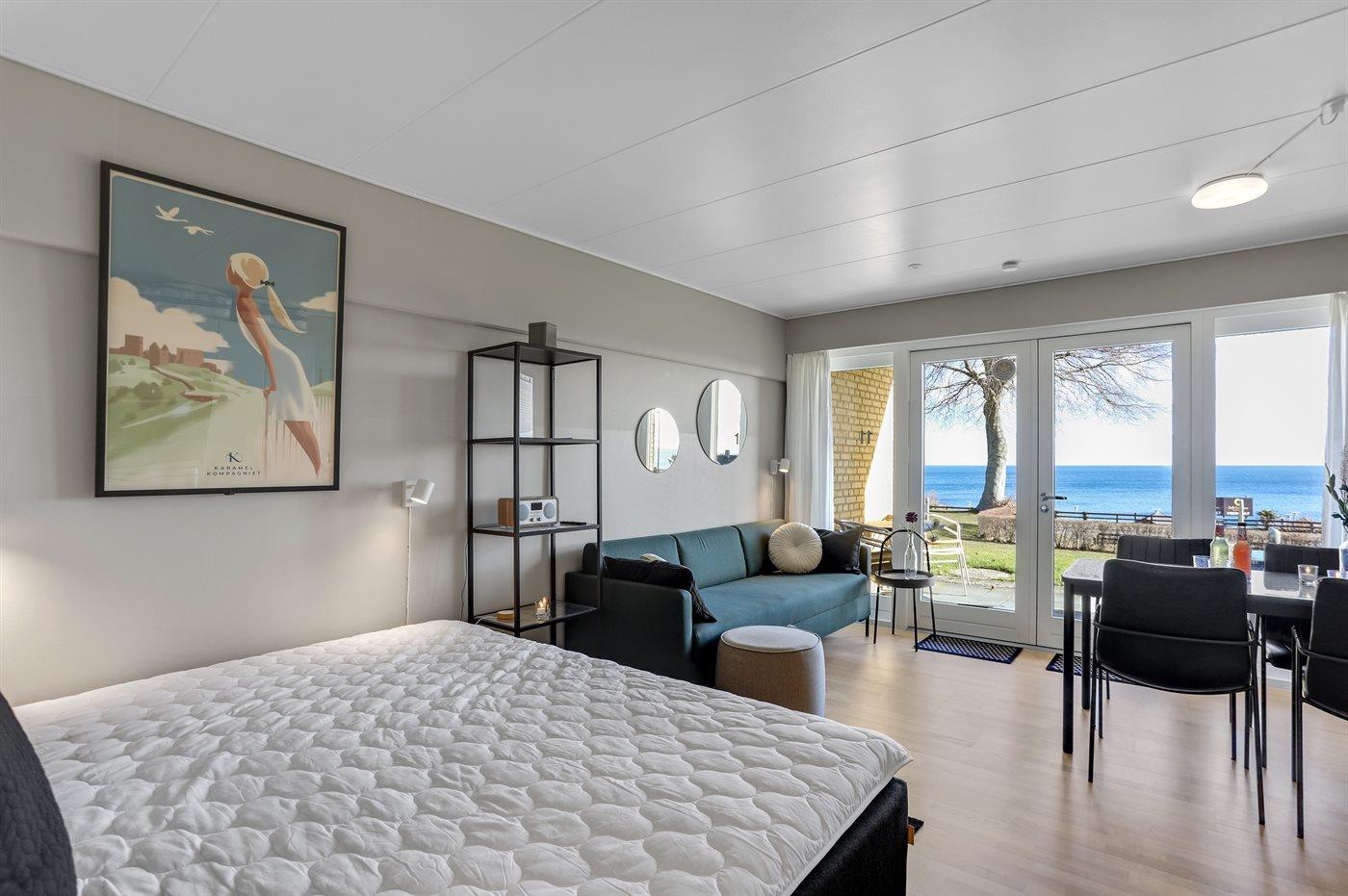 Lejlighedens midtpunkt er opholdsstuen, hvorfra der er adgang til den overdækkede terrasse med havudsigt, og som er indrettet med spiseplads, dobbeltseng samt sofa – her er der gode muligheder for afslapning mens man ser fjernsyn eller lytter til musik.