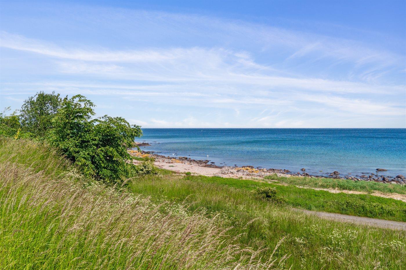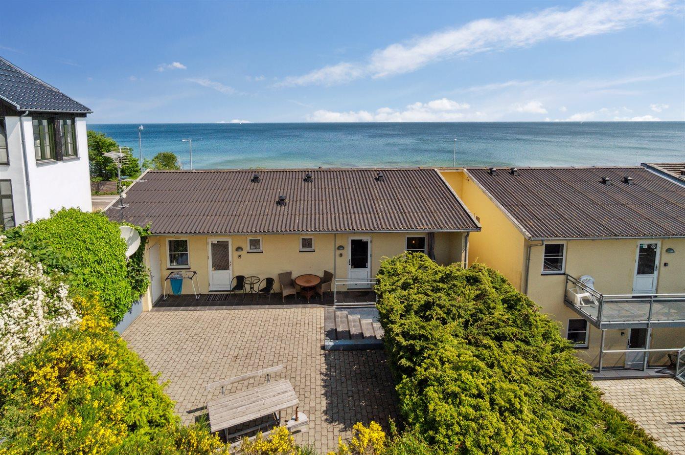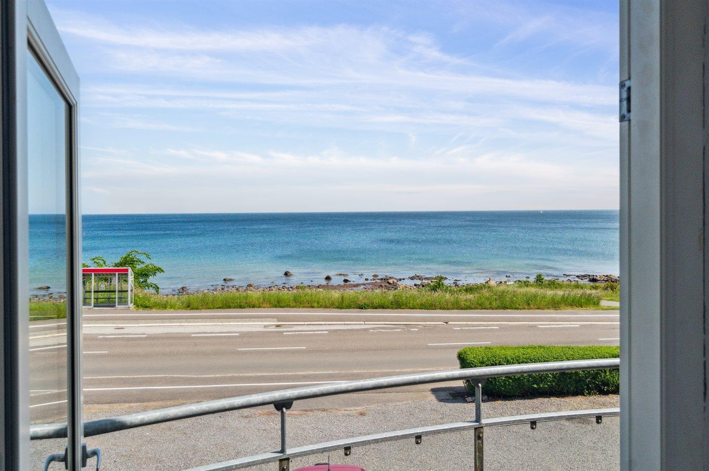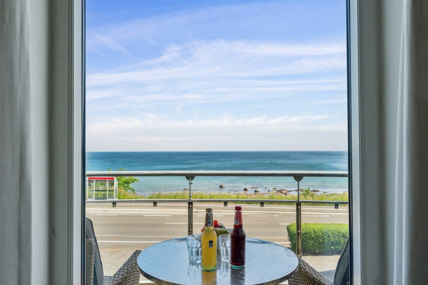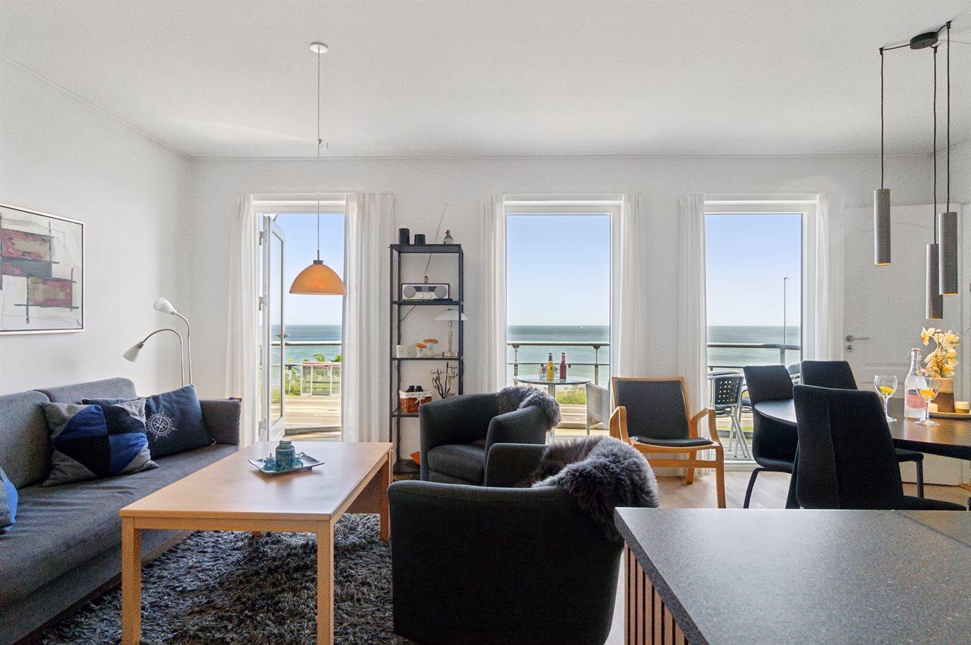 Velindrettet ferielejlighed med udsigt til kysten og havet fra terrasse og stue. Der er adgang til den store fælles grund med plæner, gårdhave og stor solterrasse højt hævet, så man får det bedste kig ud over havet.