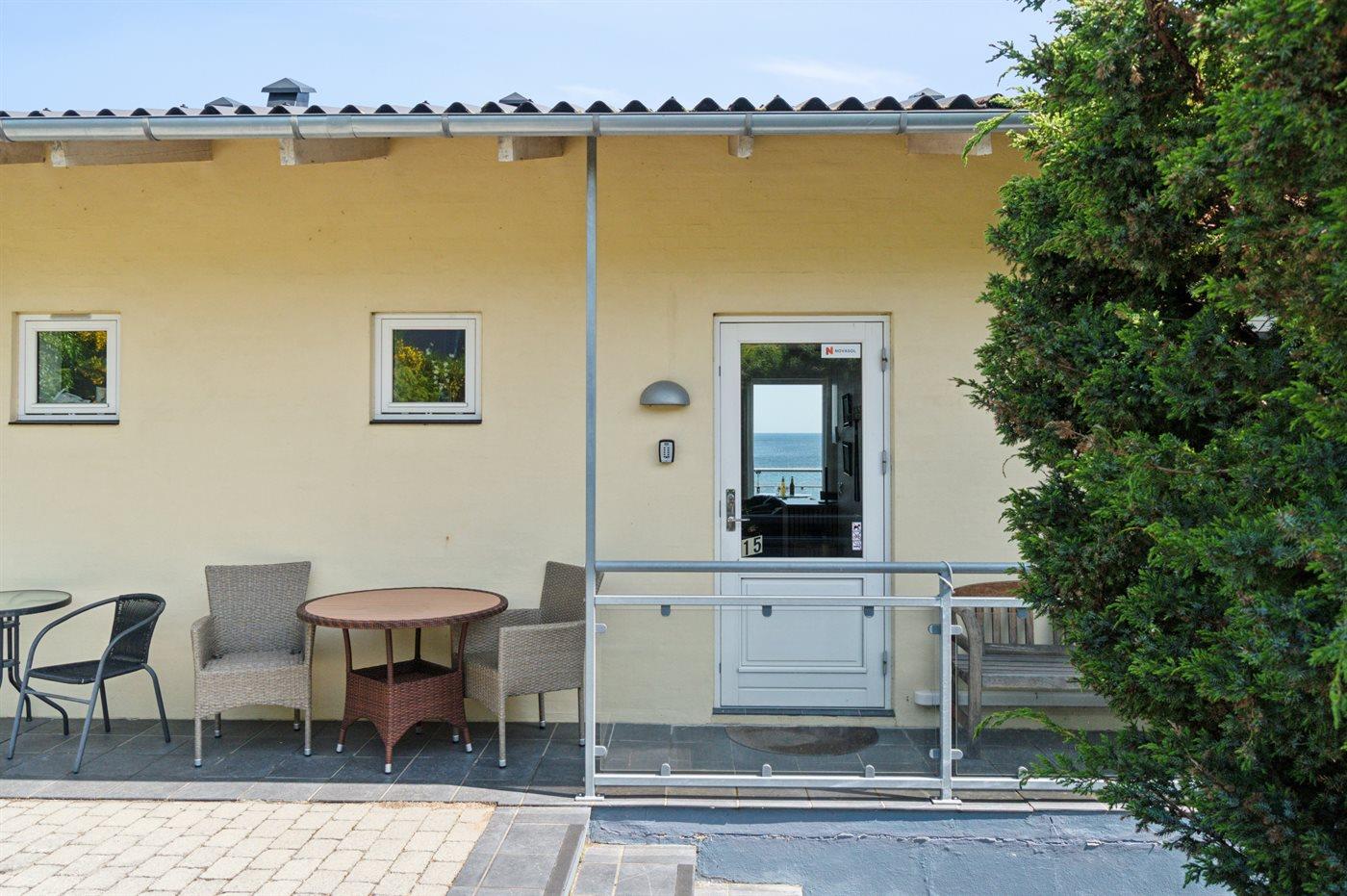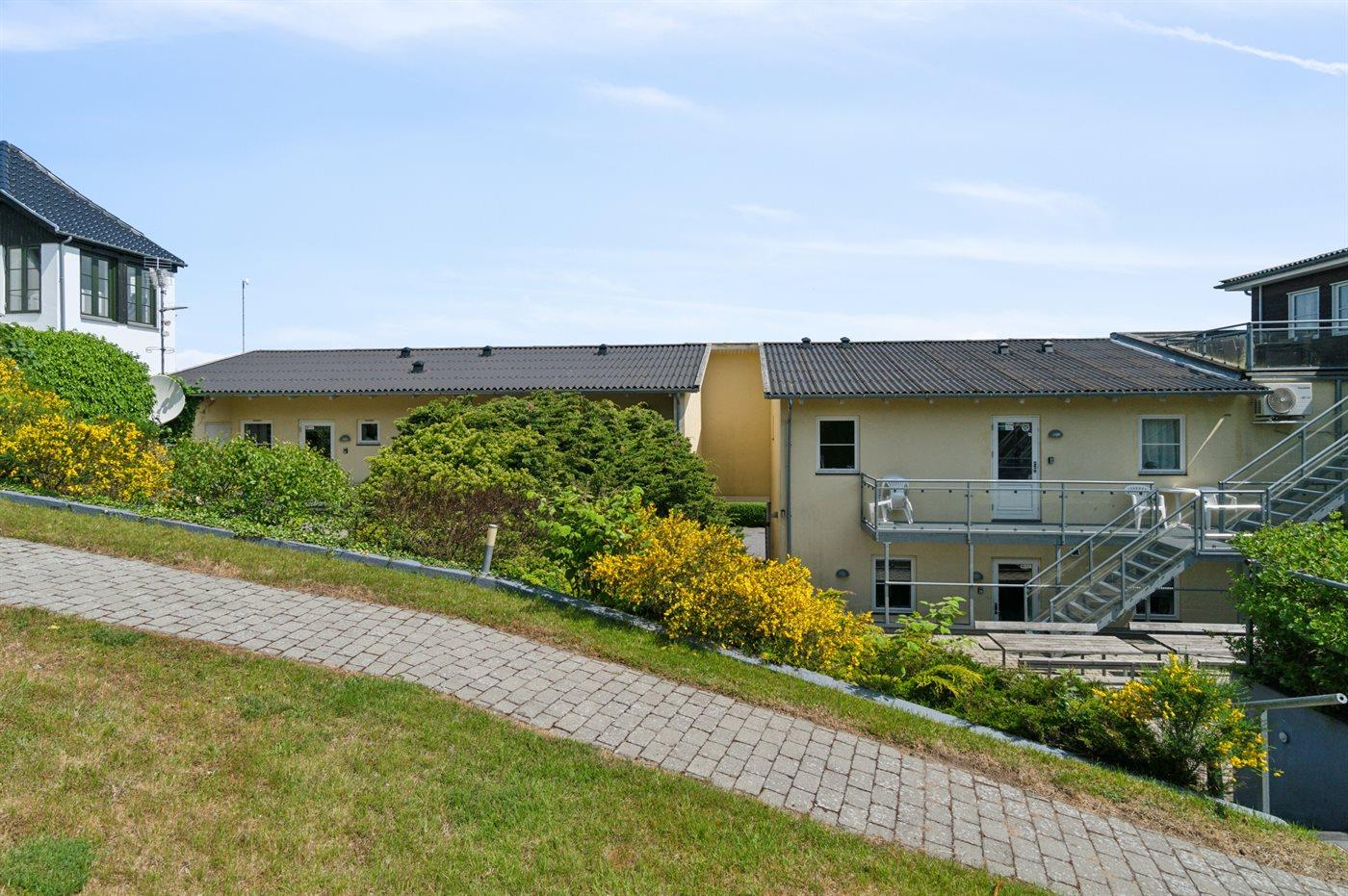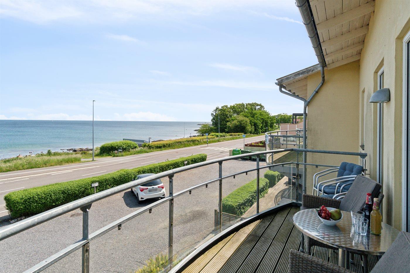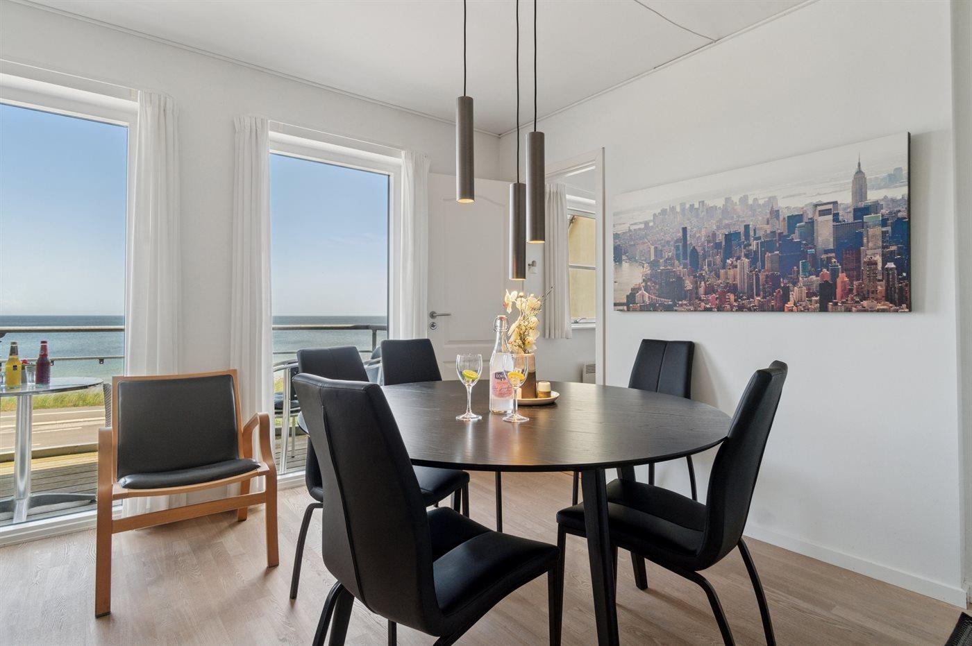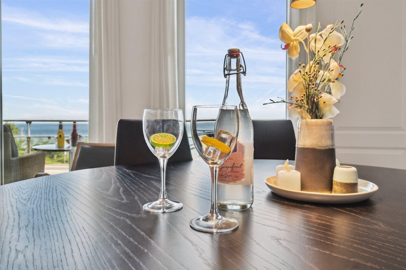 Velindrettet ferielejlighed med udsigt til kysten og havet fra terrasse og stue. Der er adgang til den store fælles grund med plæner, gårdhave og stor solterrasse højt hævet, så man får det bedste kig ud over havet.