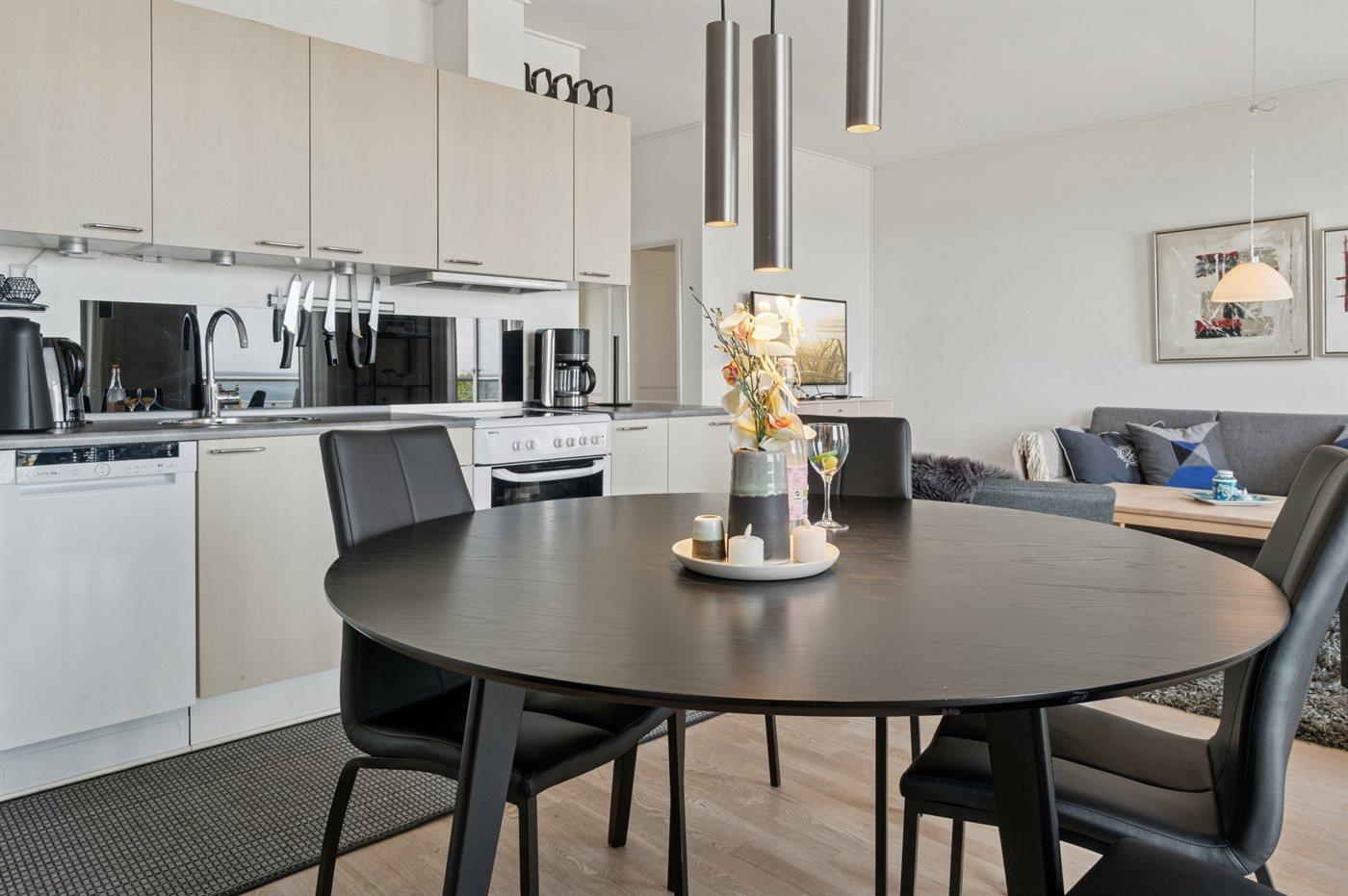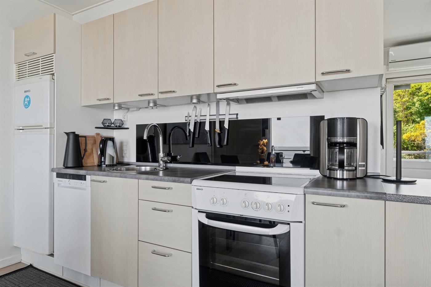 Køkkenet er udstyret med 1 køleskab. Der er 4 keramiske kogeplader, varmluftovn samt opvaskemaskine Der er gulvvarme i køkkenet.